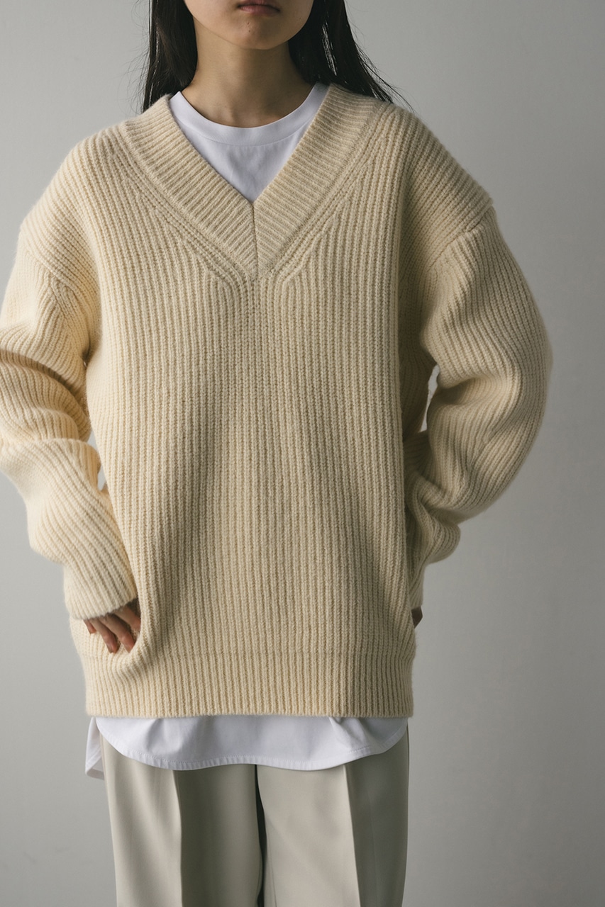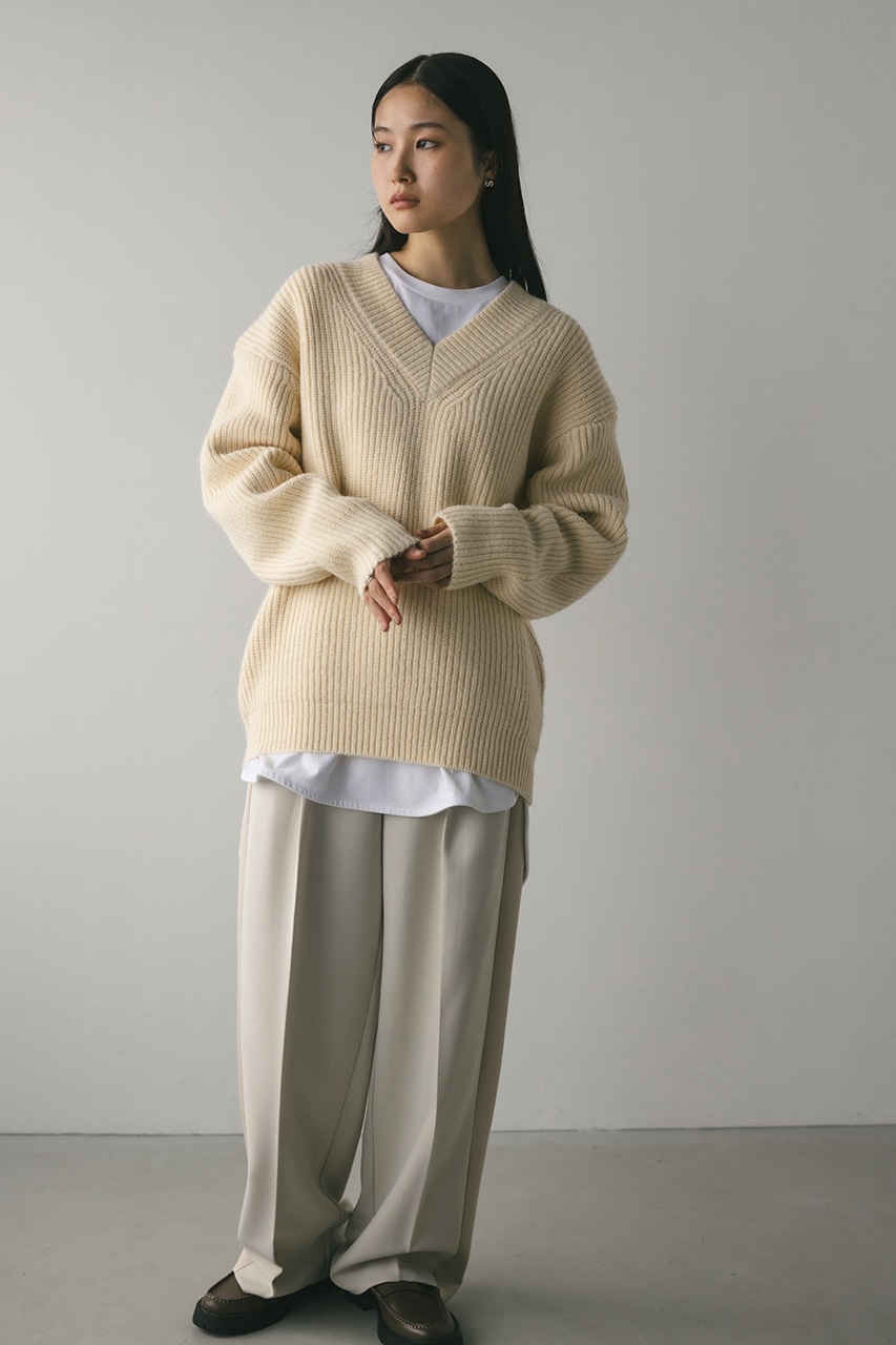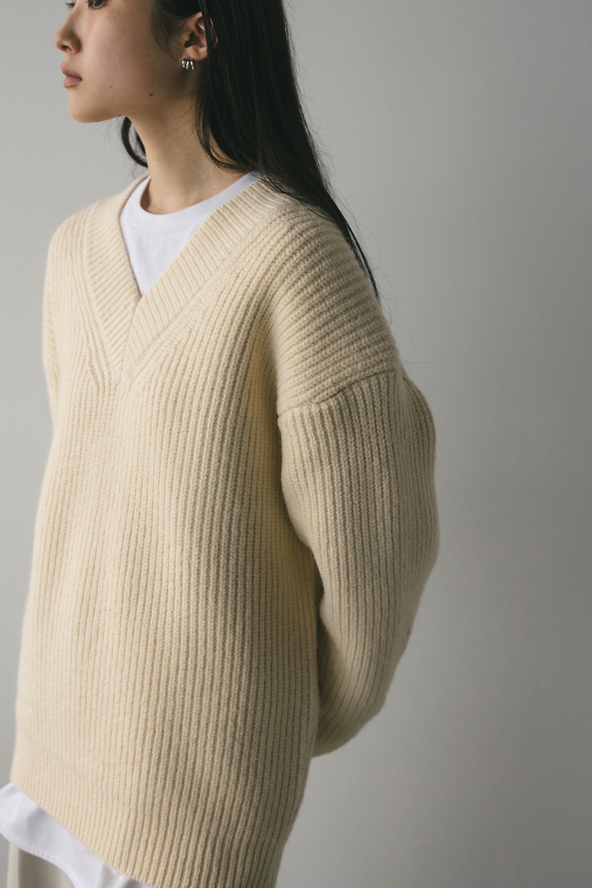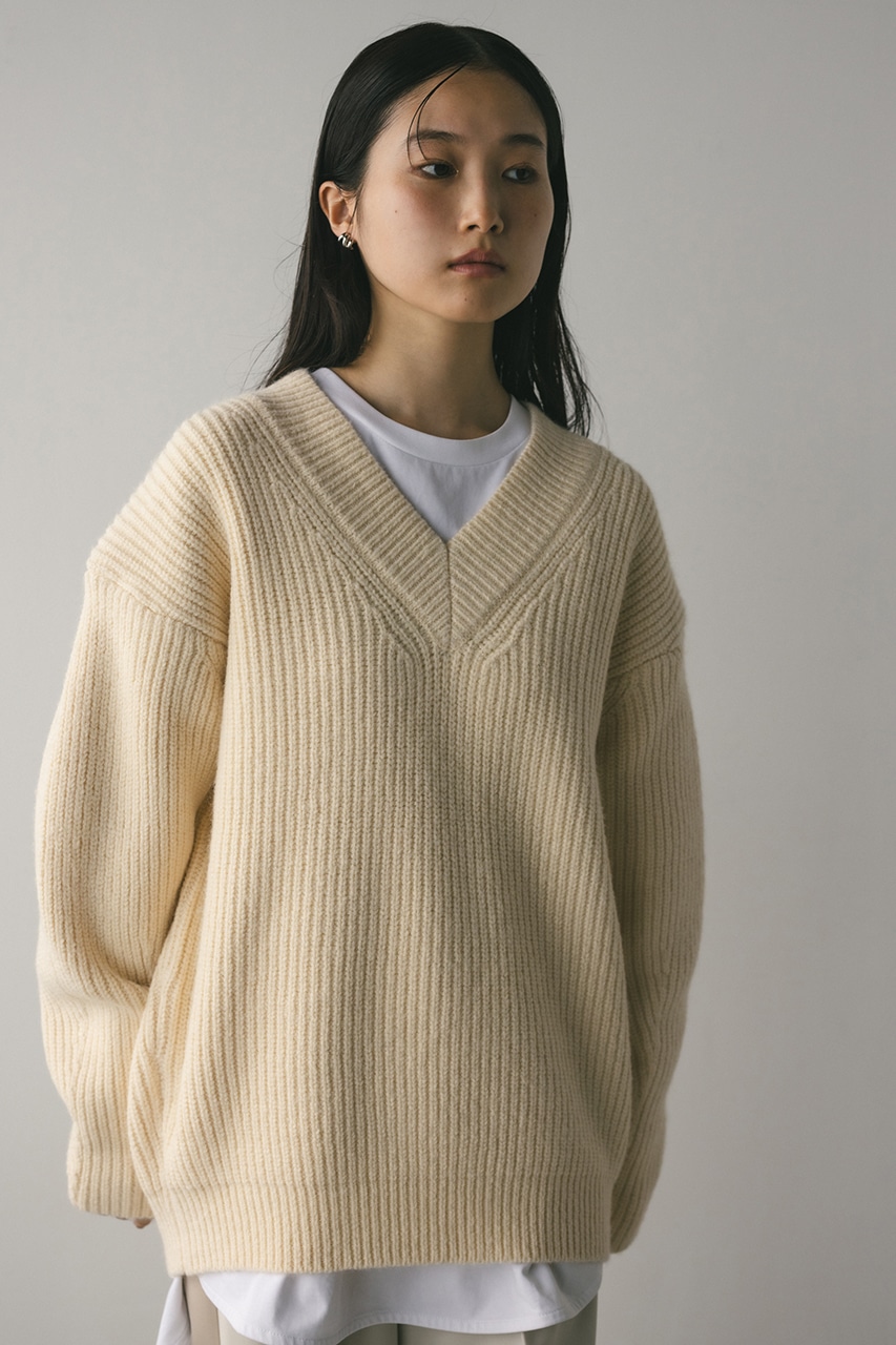 程よく開けたVネックが女性らしいローゲージのニットトップ。