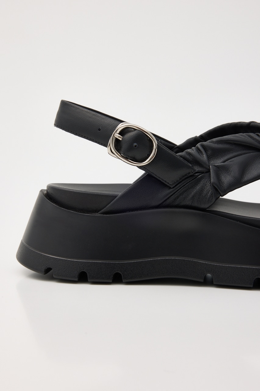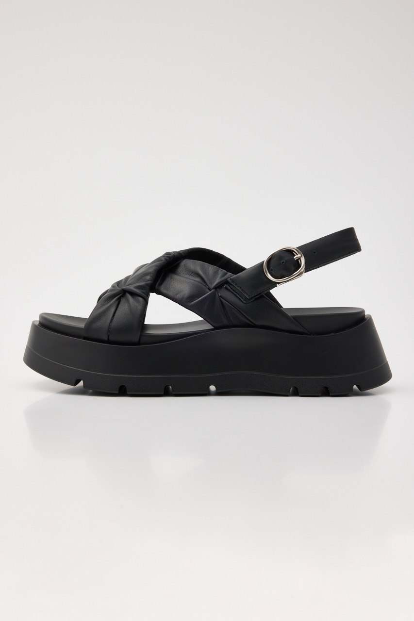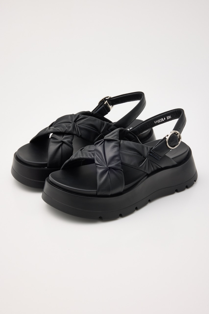 ツイスト風の表情感あるクロスベルトがおしゃれなボリュームソールサンダル。ベルト部分はふんわりとして足あたりも◎ソックス合わせにも相性のよい、ぽってりとした厚みのある船底ソールが今っぽい足元にアクセントつけてくれます。