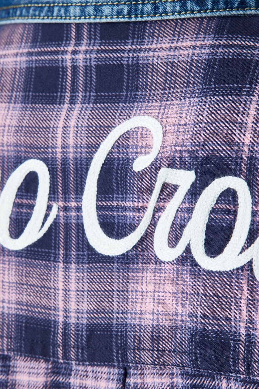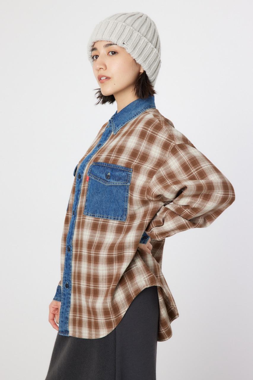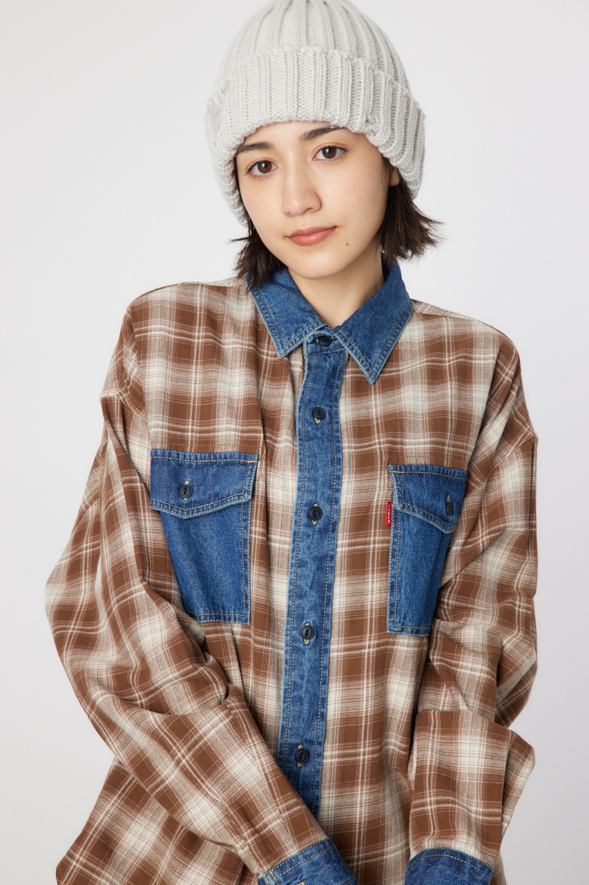 襟・前立て・ポケット・袖の生地がデニム素材になっているデザインチェックシャツ。バックには刺繍ロゴを施し、定番のチェックシャツをアップデートさせました。