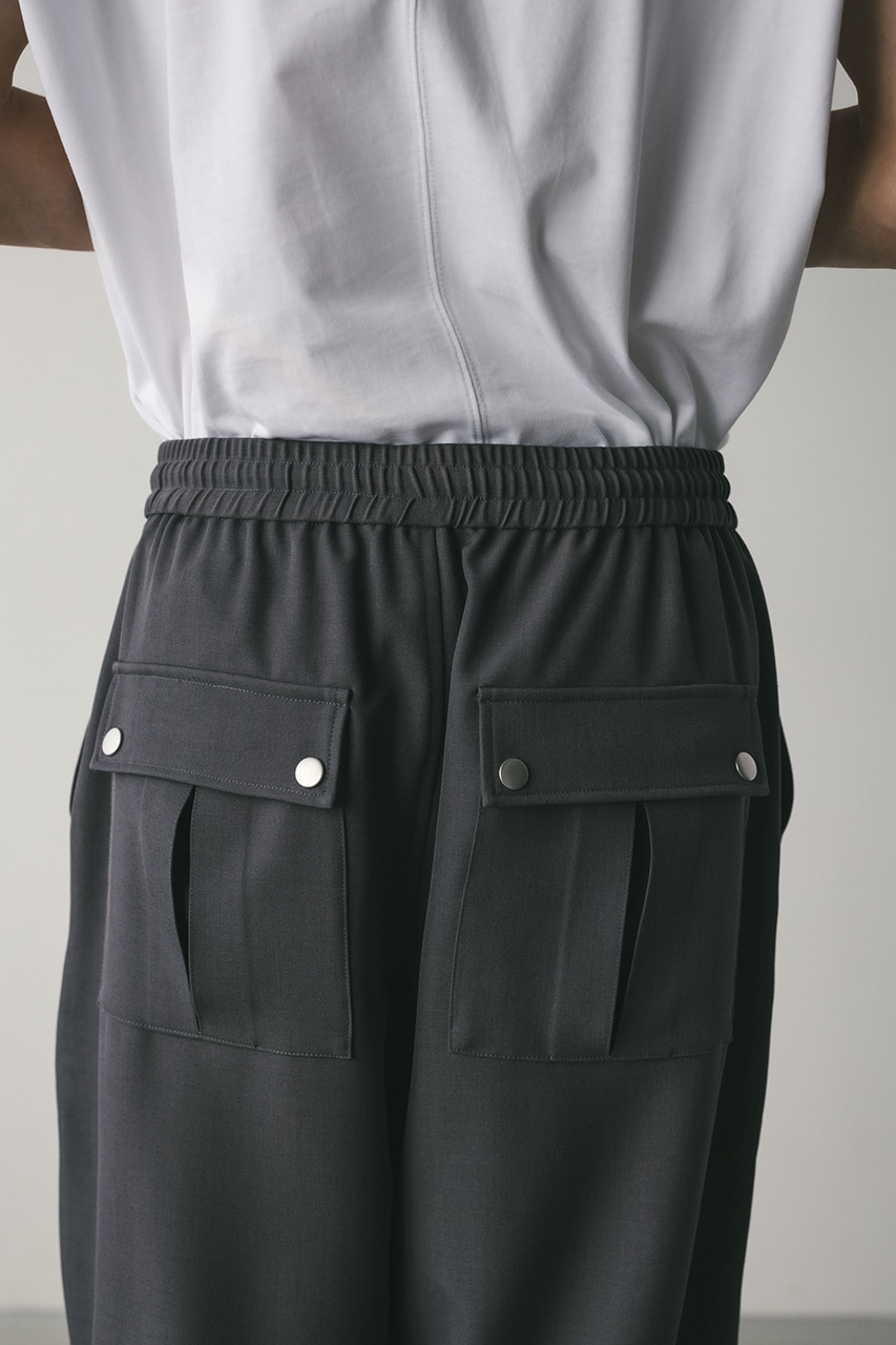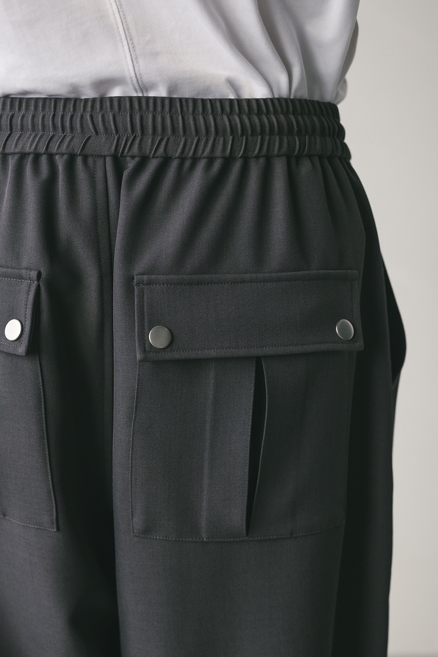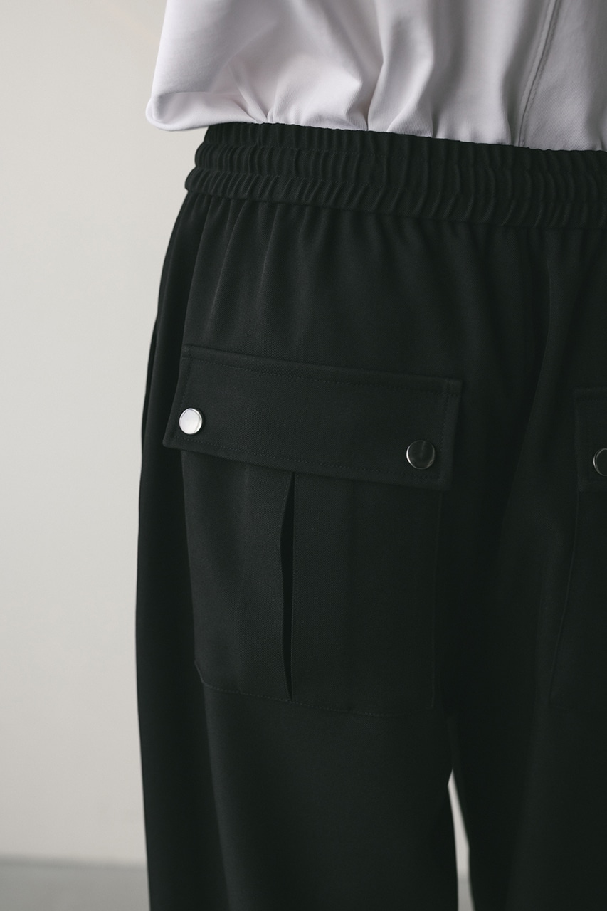バックの大きめなフラップポケットとシルバーのドットボタンがポイントのイージーパンツ。