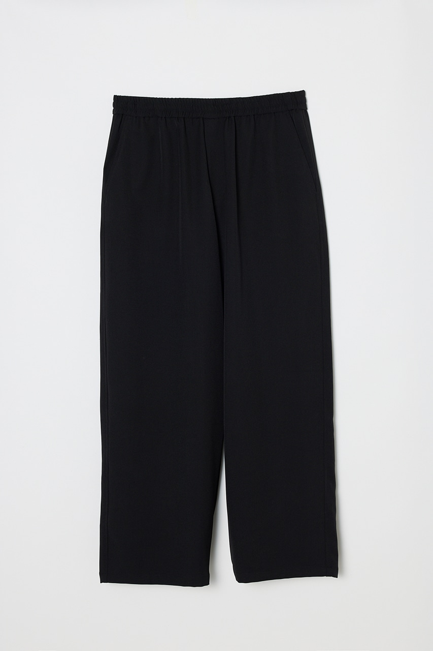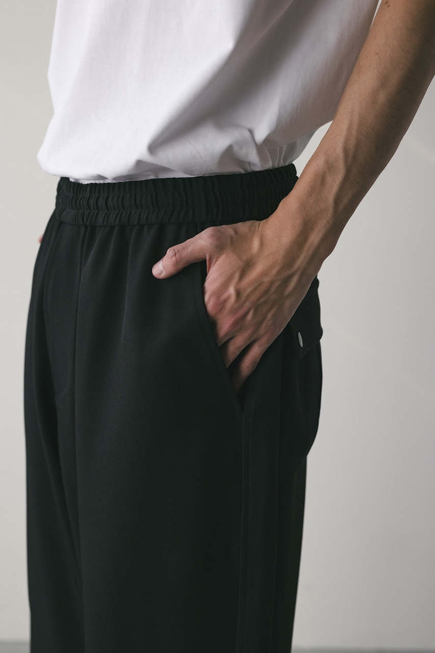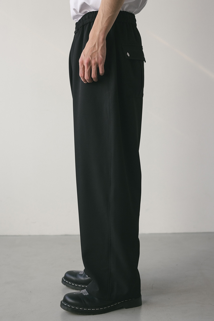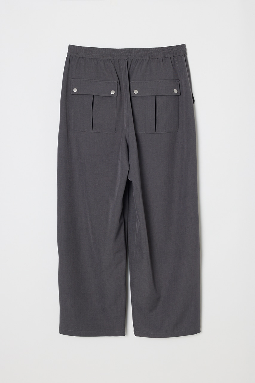 バックの大きめなフラップポケットとシルバーのドットボタンがポイントのイージーパンツ。
