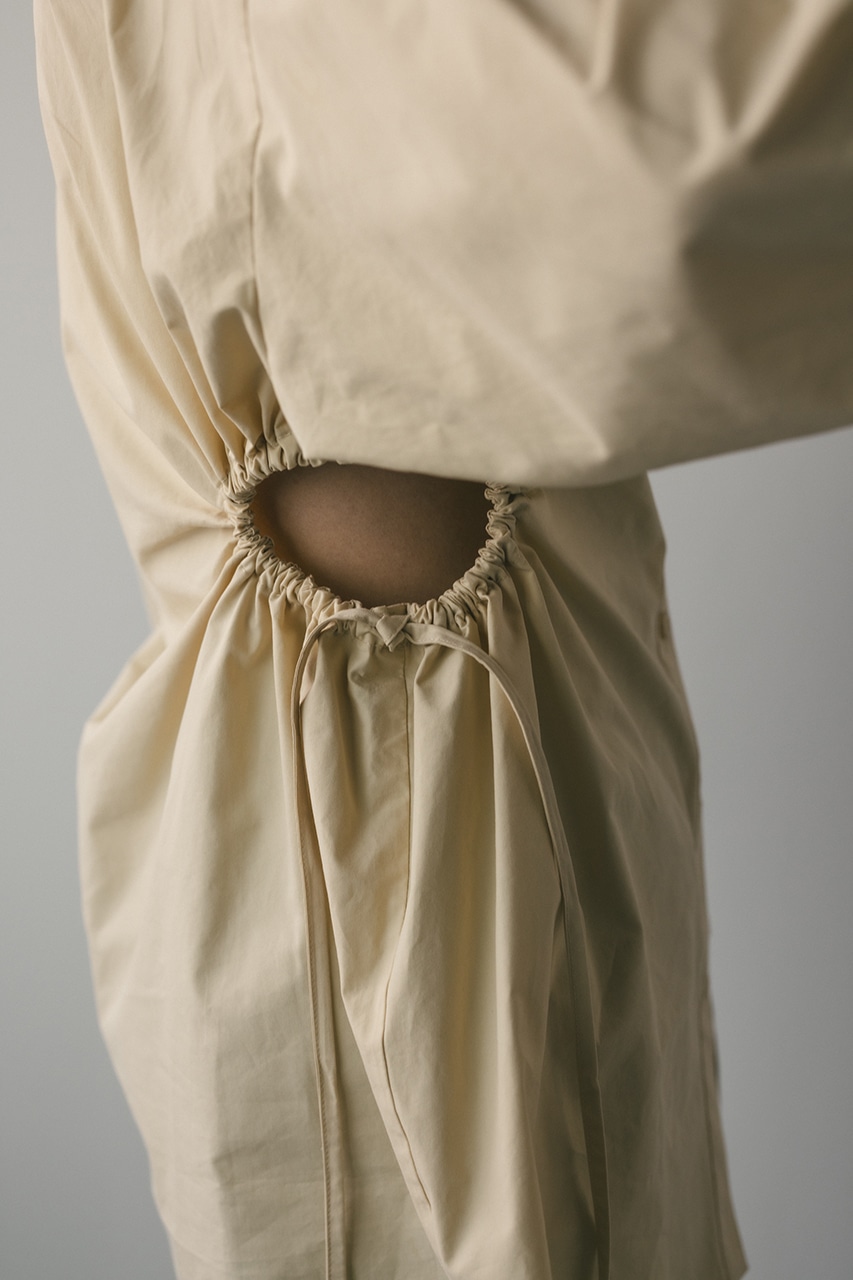ゆったりとしたボディーに調整可能のドロストホールを入れ、ウエスト部分のみシェイプシルエットがつくれるディテールに仕上げた一枚です。