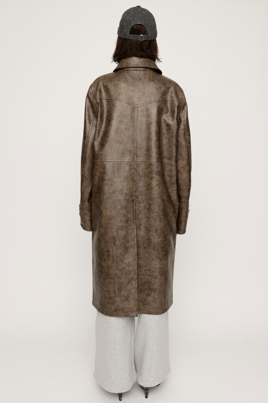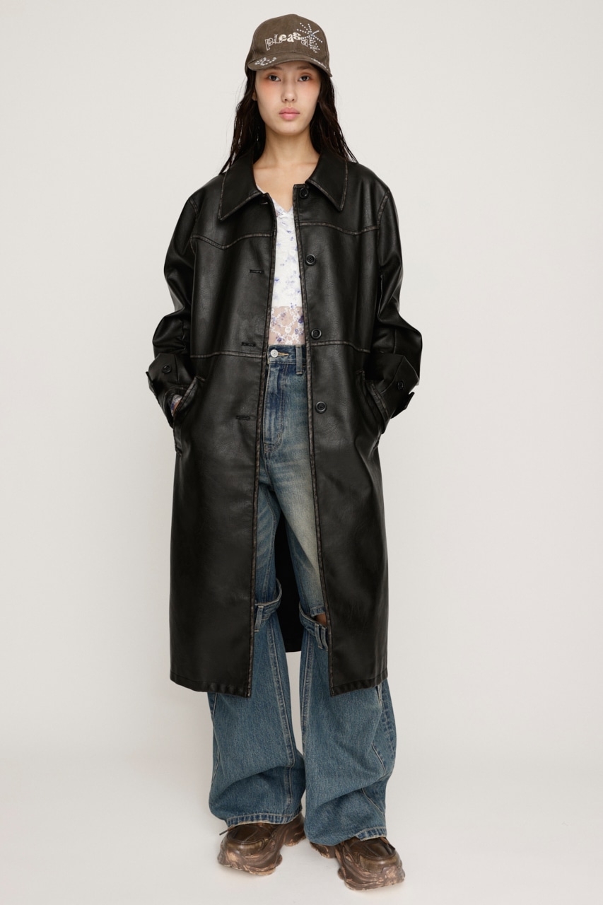 ■POINT:長年着古したようなヴィンテージライクなレザーロングジャケット。サラッと羽織るだけでこなれた印象に。ミニマルなデザインが大人可愛いアイテムです。
