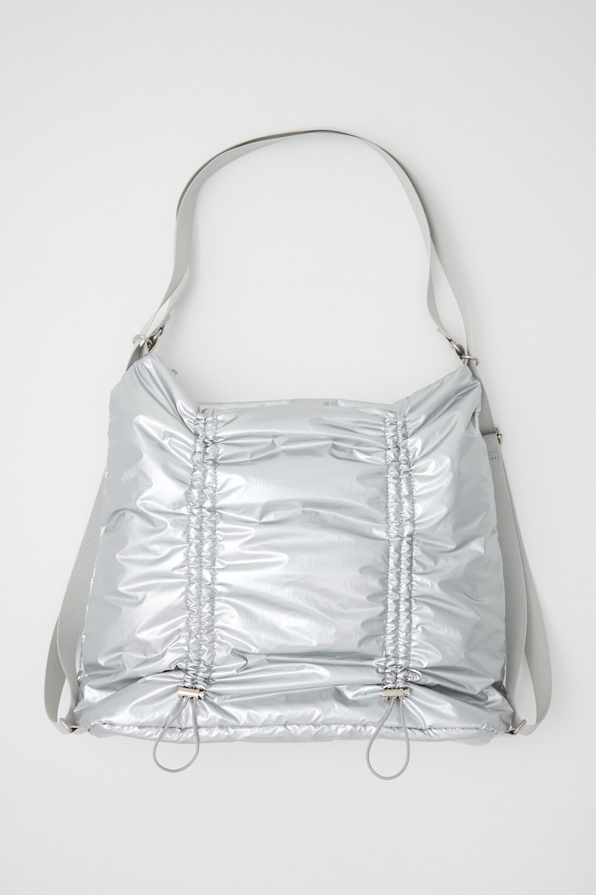 3WAYで使えるデザインで、テープの長さを調整して好きなタイプで使用できるバッグ。1WAYは肩掛け、2WAYは斜め掛けショルダー、3WAYはリュック仕様になっています。小ぶりながらマチもあるので、500mlペットボトルや長財布、A4サイズ書類も収納可能。フロントのゴムシャーリングがポイントで、絞ると本体の形も変えられます。