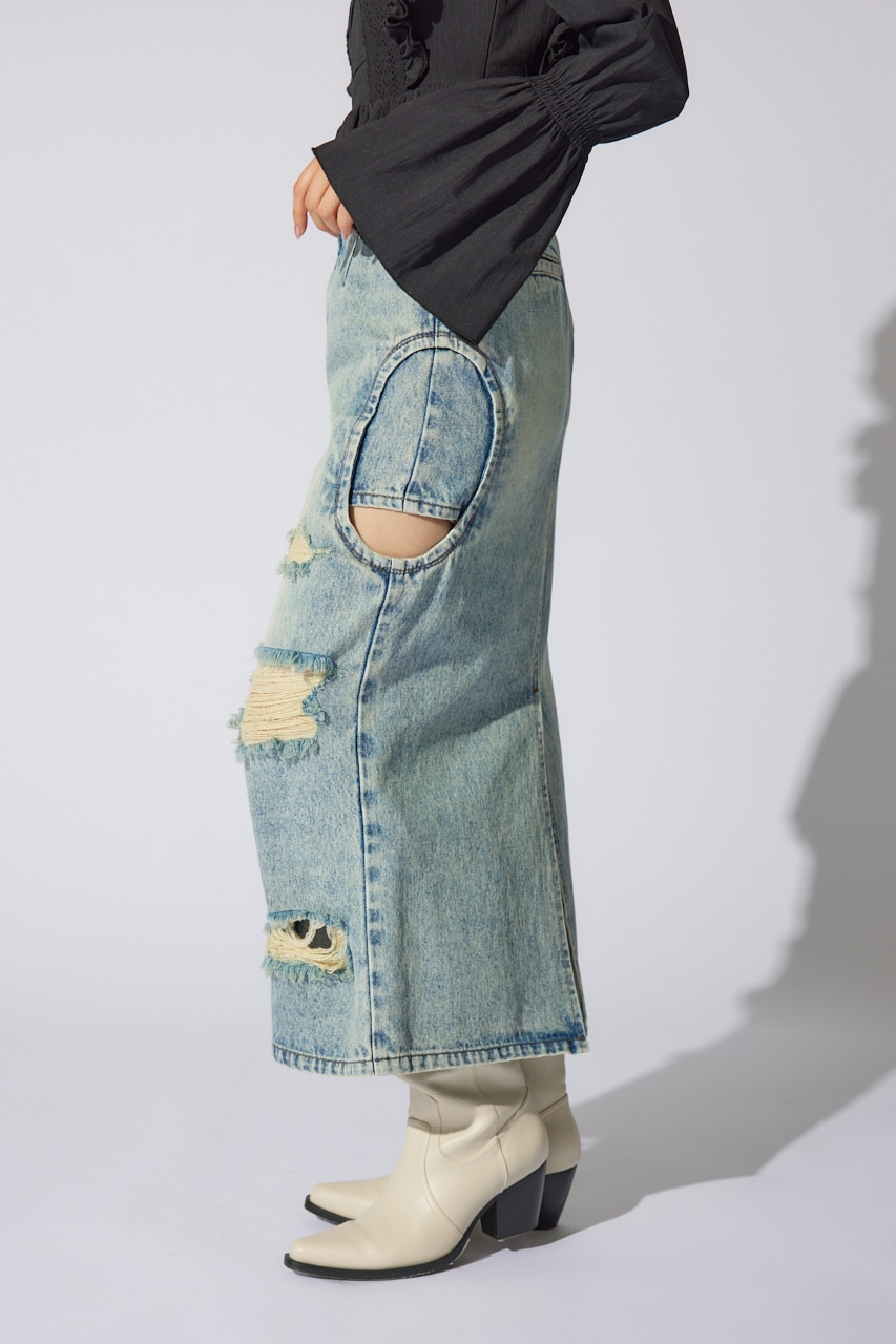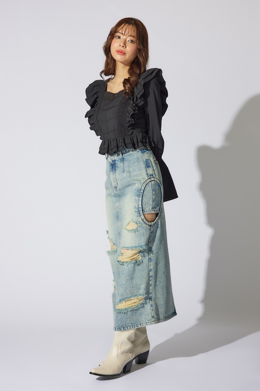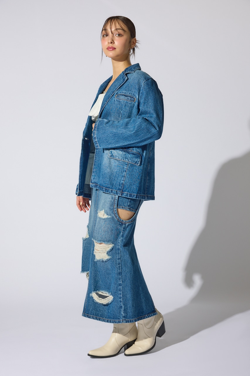 クラッシュなどハードな加工を施していますが、位置や大きさ、形状にもこだわって女性らしく上品に仕上げました。