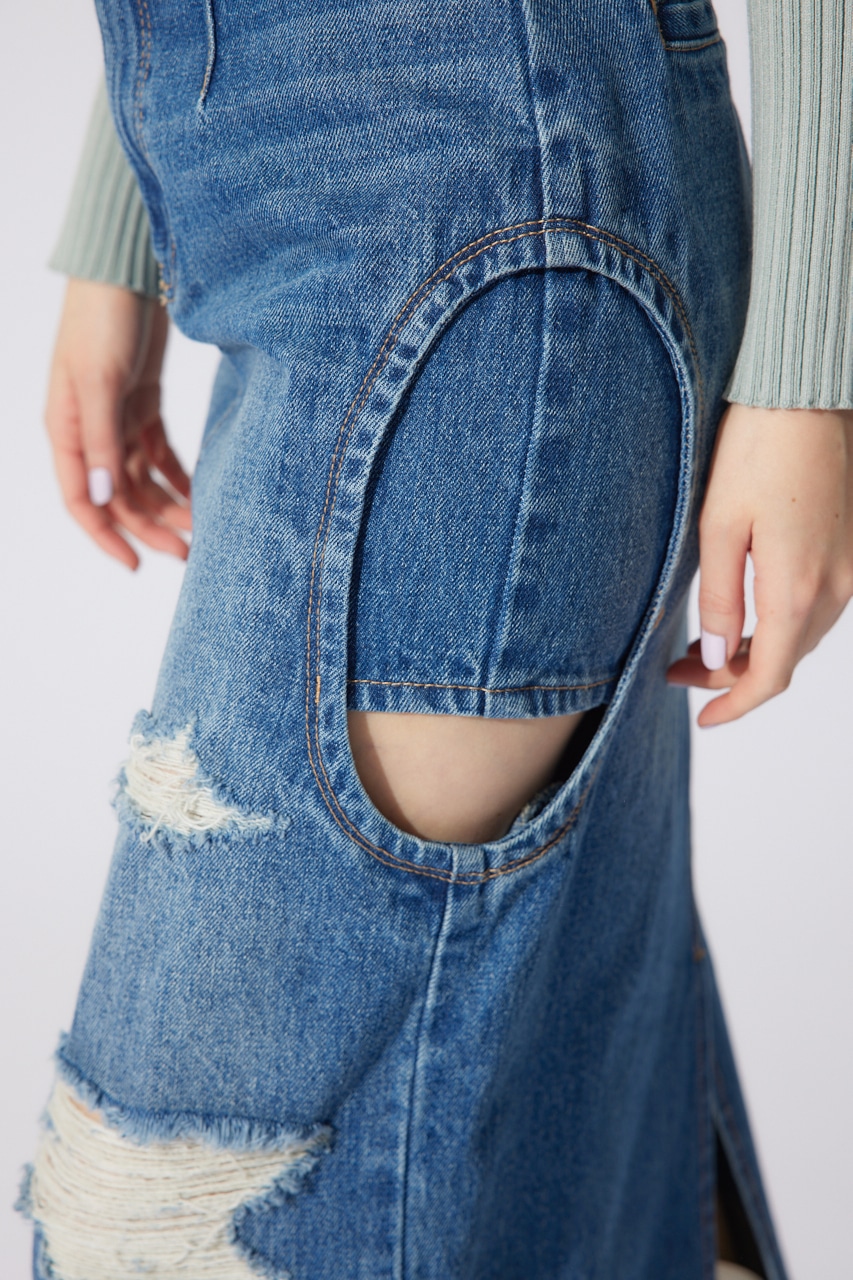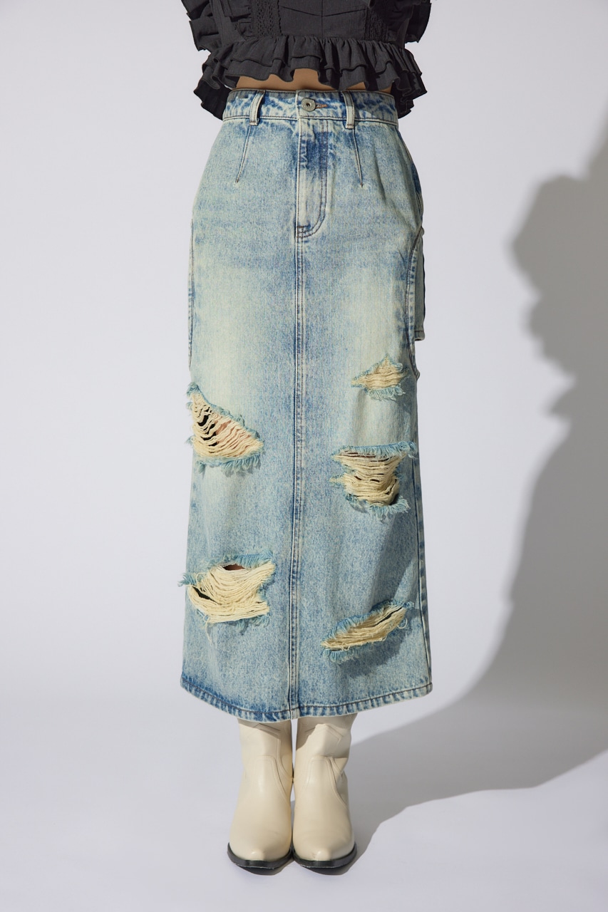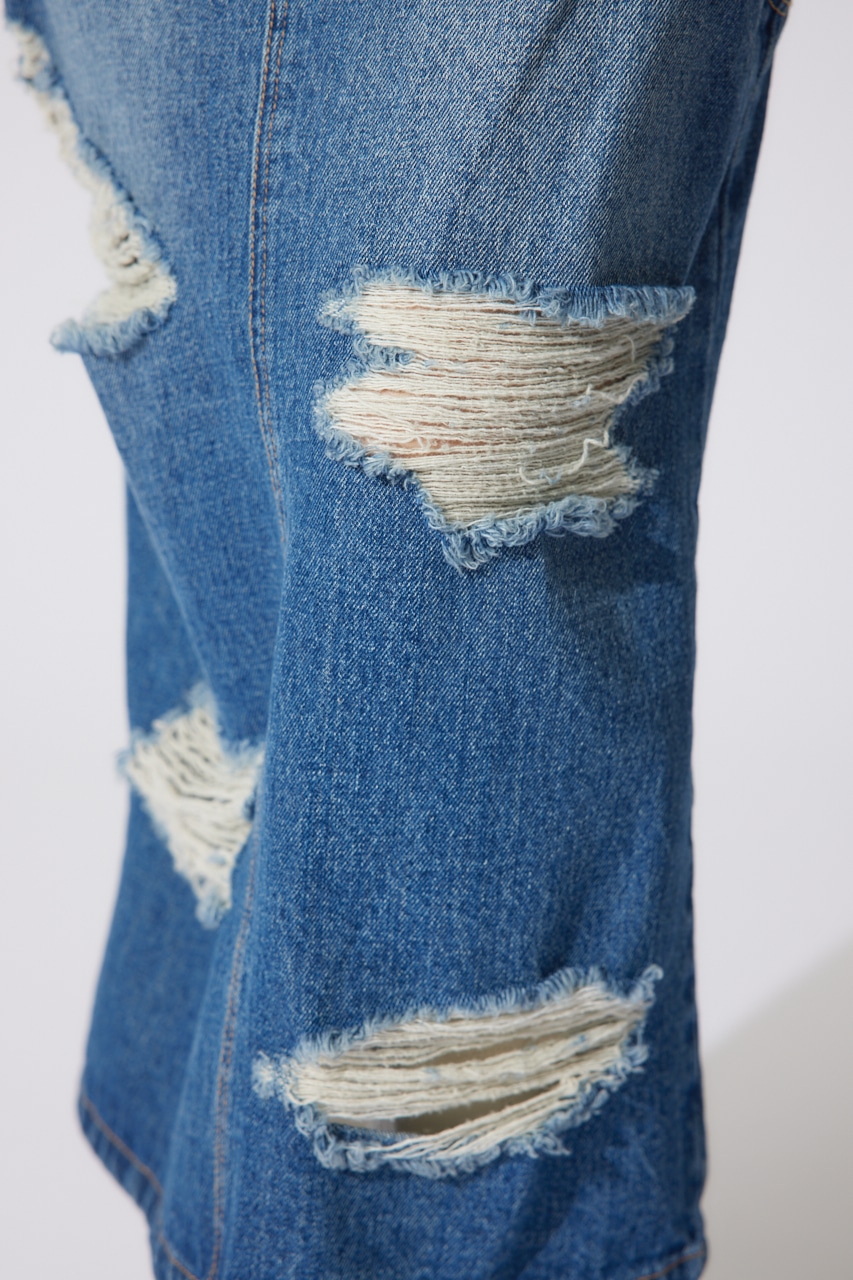 クラッシュなどハードな加工を施していますが、位置や大きさ、形状にもこだわって女性らしく上品に仕上げました。