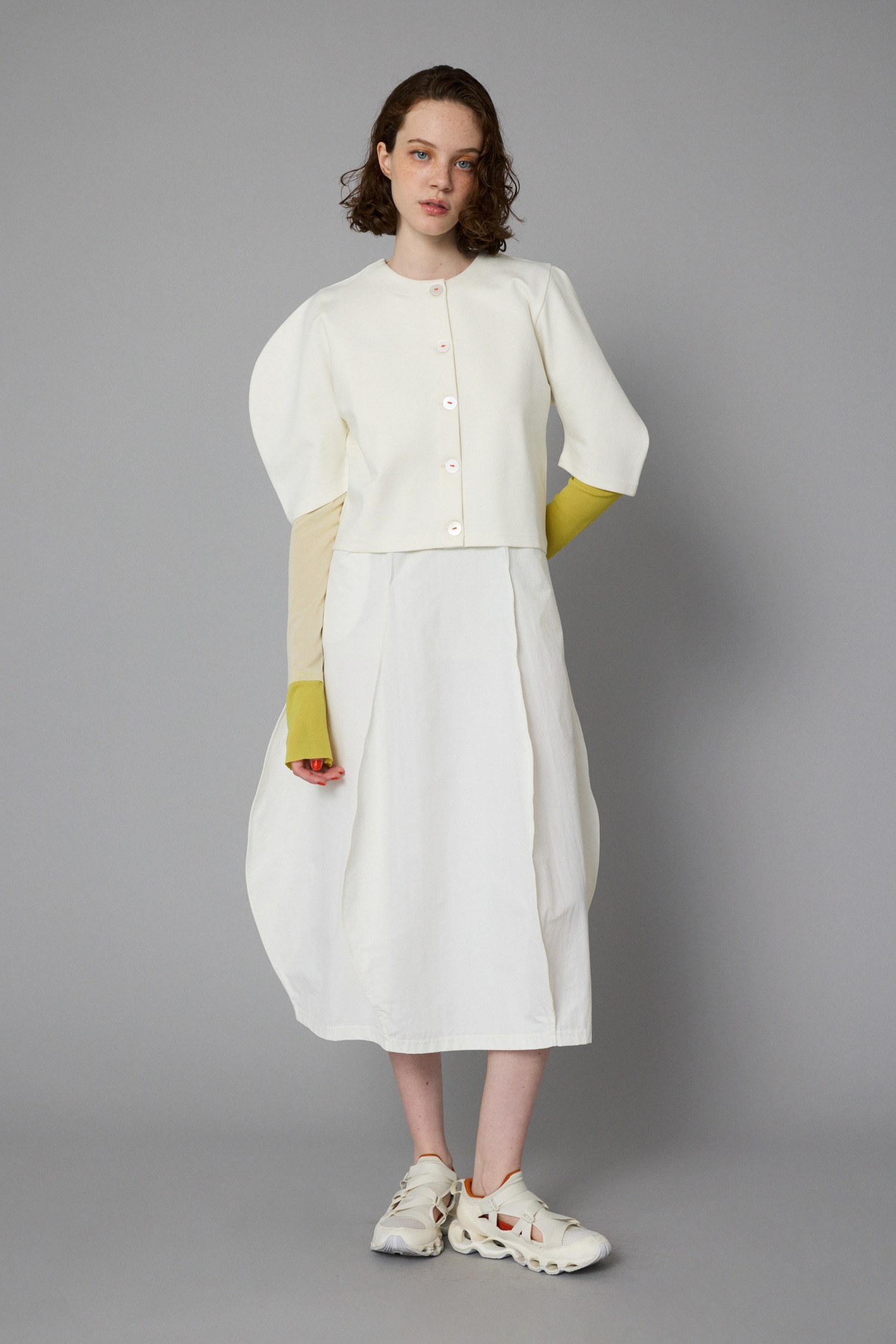 丸っとした袖のラインが特徴的なポンチカーディガン