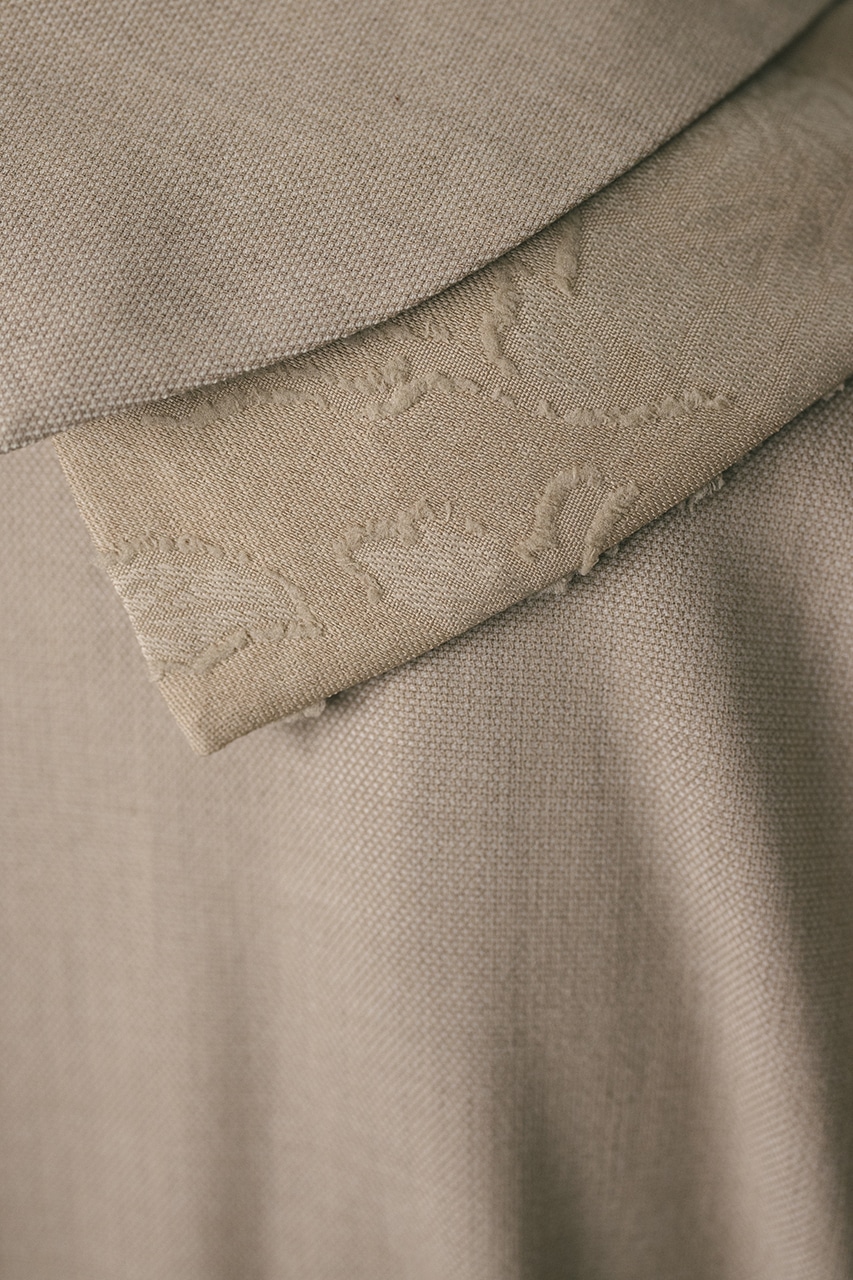 表地:本体ポリエステル67% レーヨン25% ポリウレタン4% アセテート4% 別布:ポリエステル99% ポリウレタン1% 裏地:ポリエステル100%