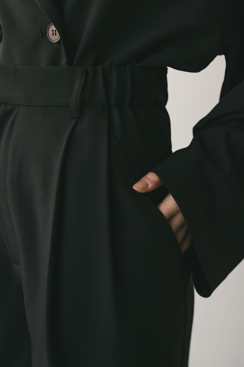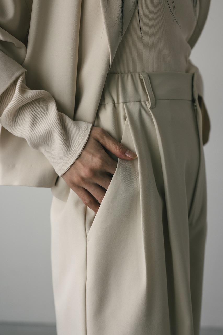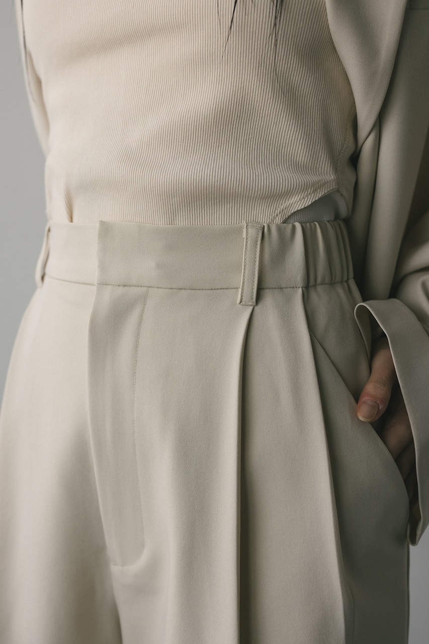 タックデザインでウエスト周りをカバーしながら、ゆとりのある裾幅とタックが身体のラインを拾わず美脚見えに導きます。