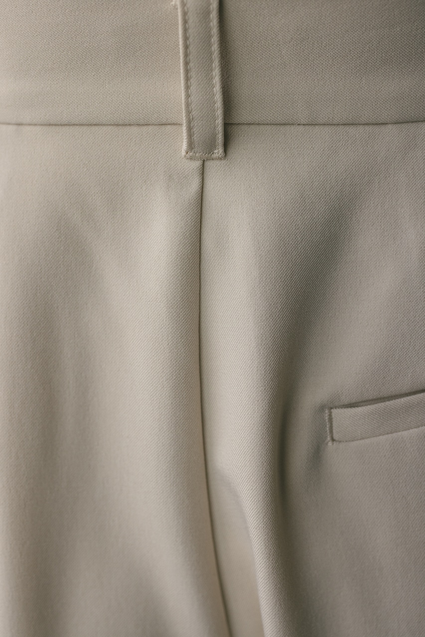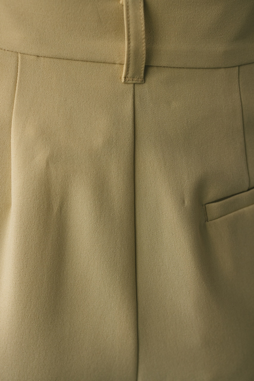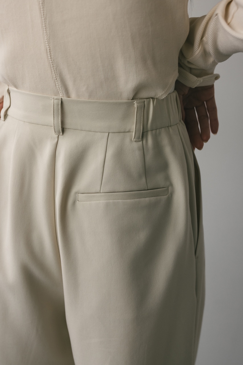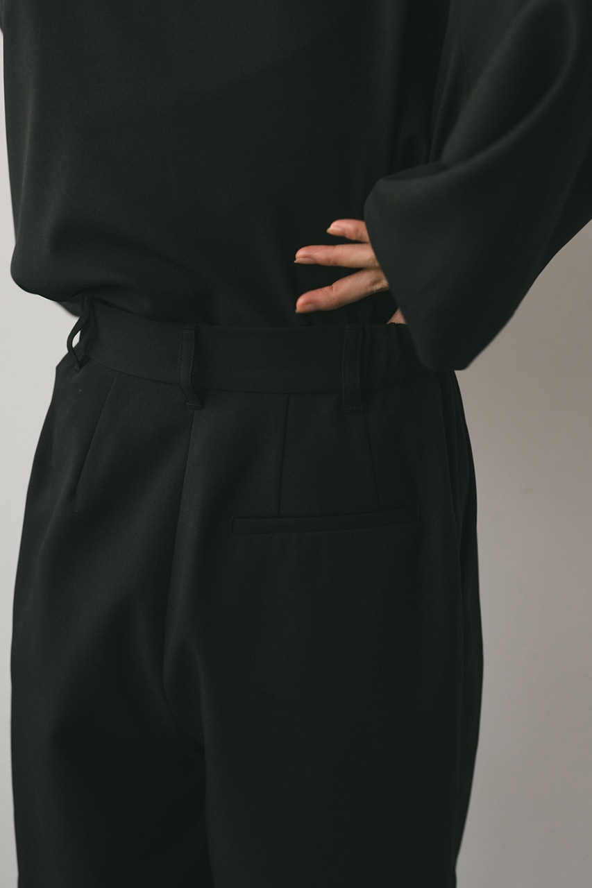 タックデザインでウエスト周りをカバーしながら、ゆとりのある裾幅とタックが身体のラインを拾わず美脚見えに導きます。