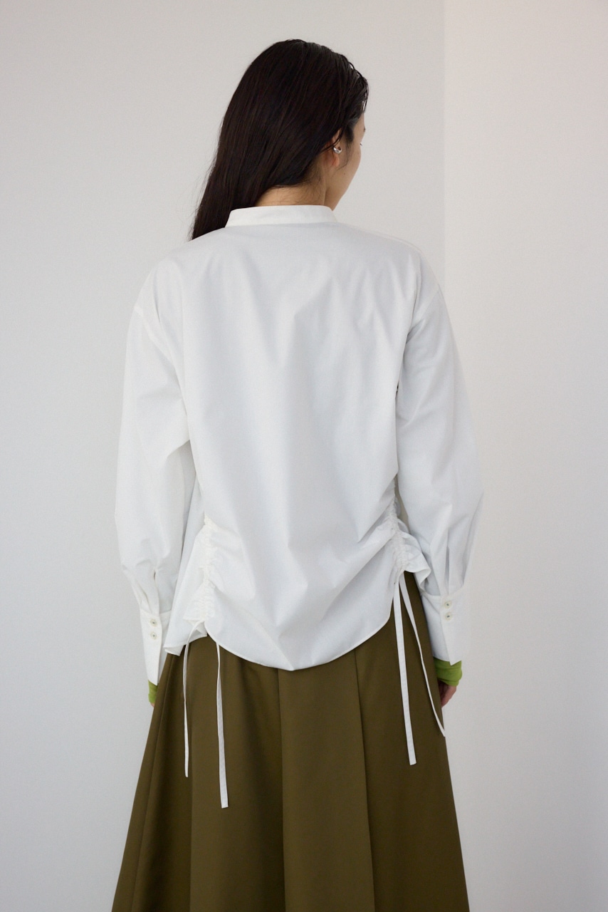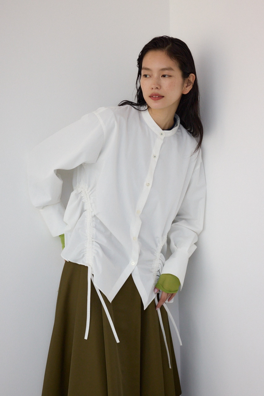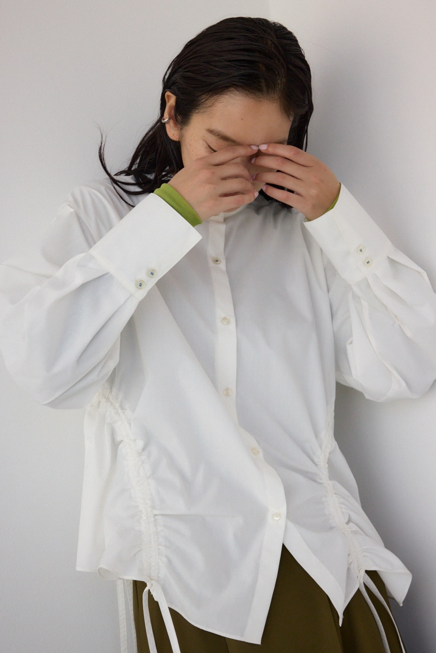 ランダムなギャザーデザインがポイントのシャツブラウスです。