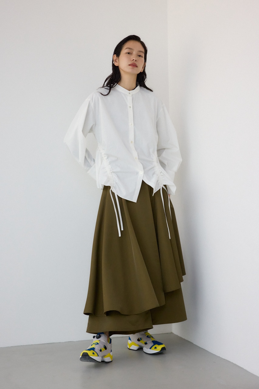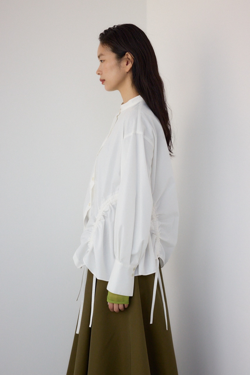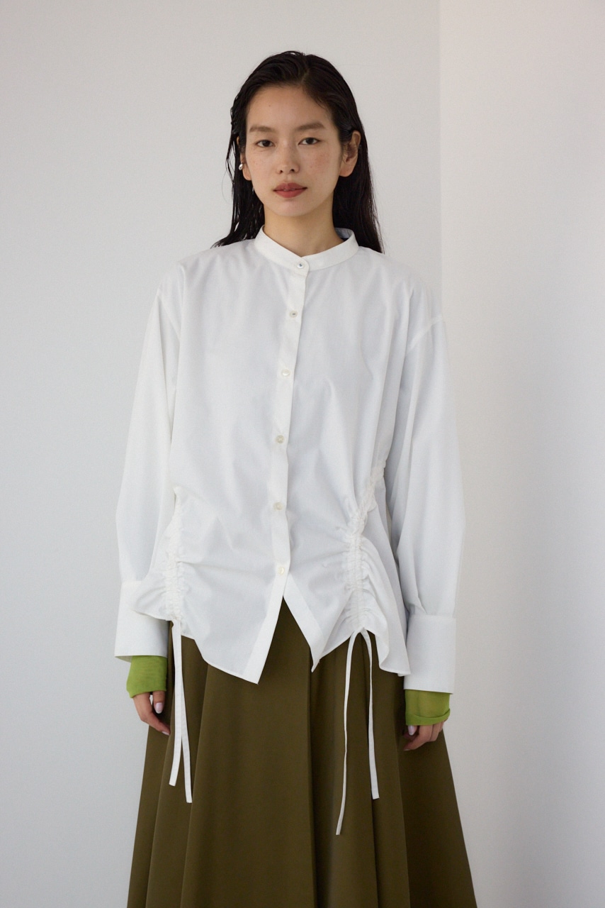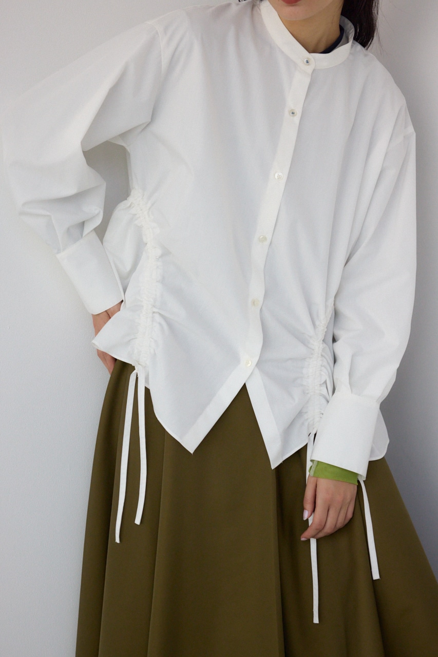 ランダムなギャザーデザインがポイントのシャツブラウスです。
