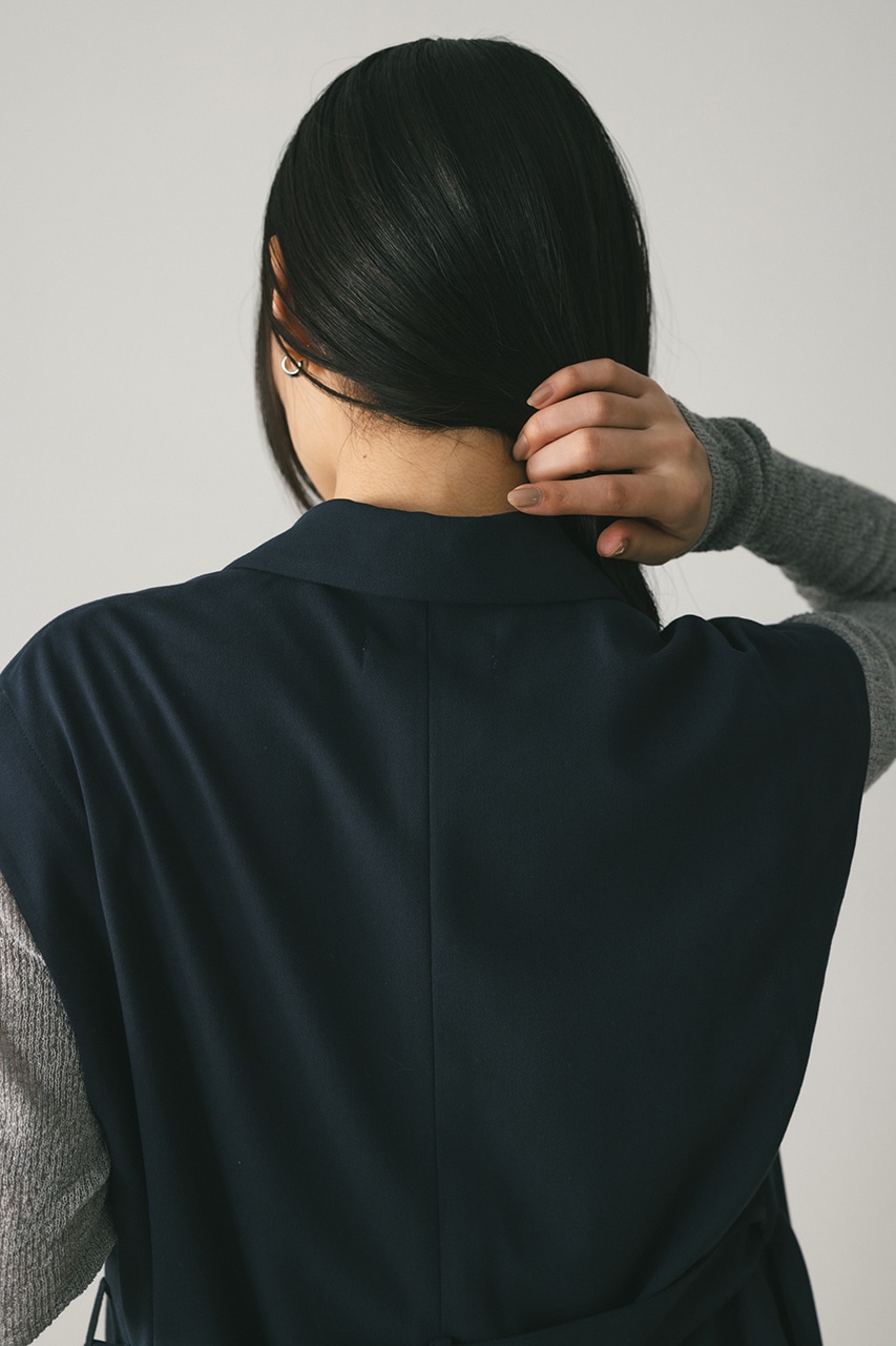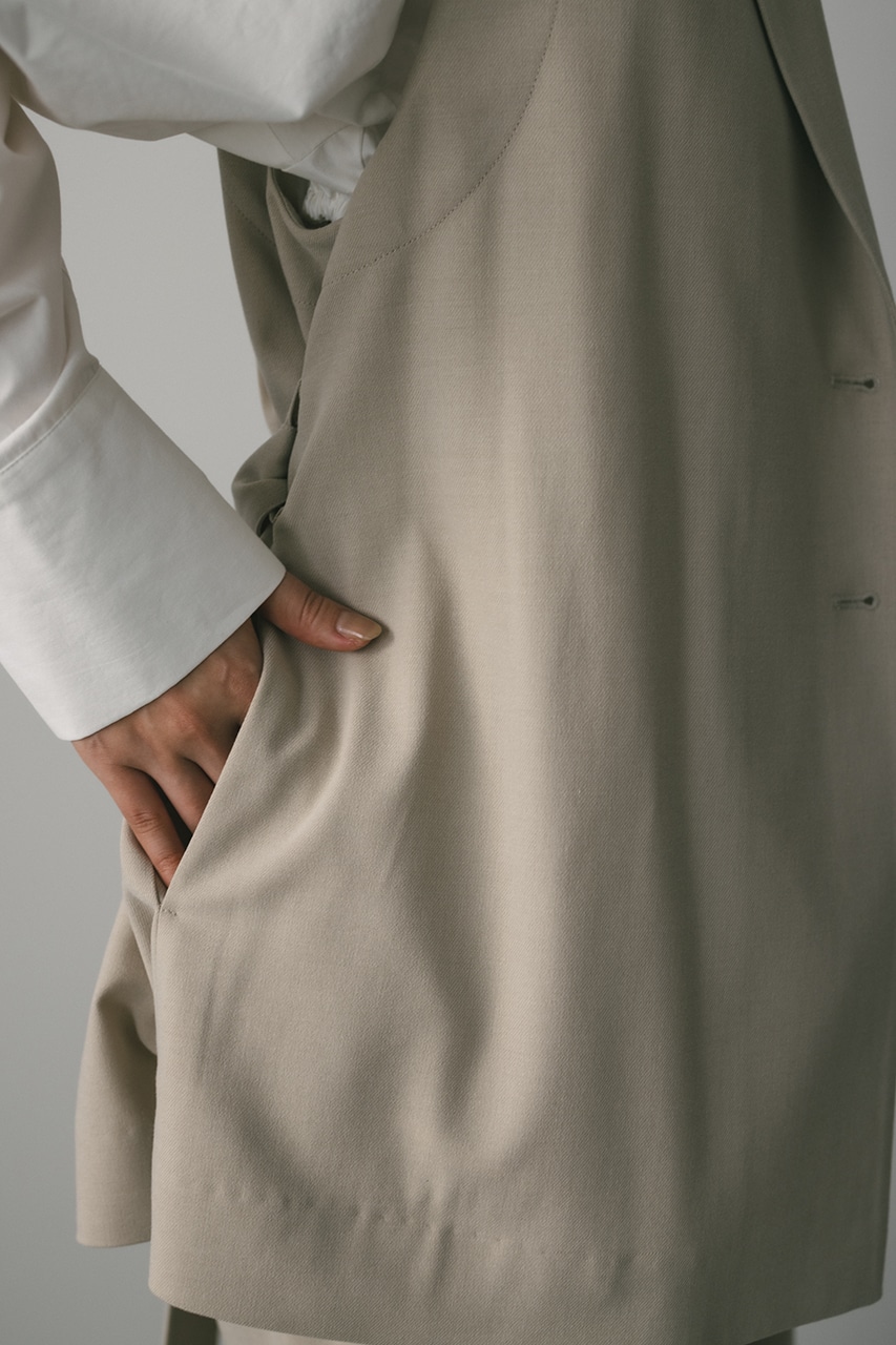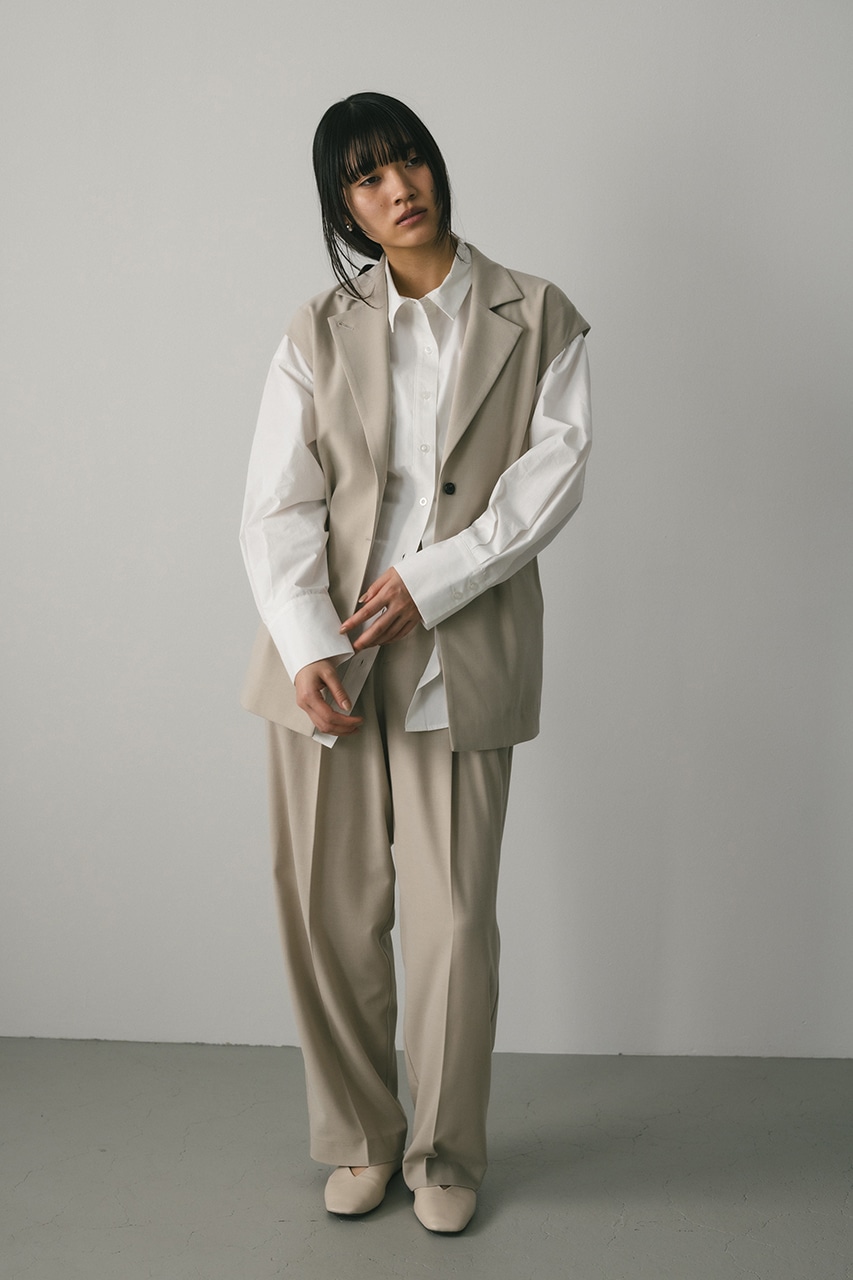 ゆったりフレアラインがこなれた印象に導くルーズテーラードベスト。
