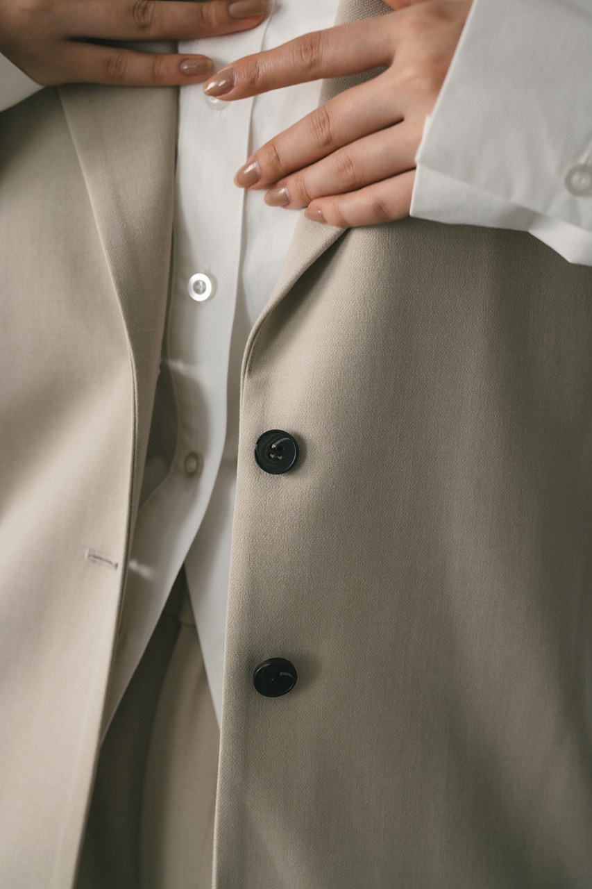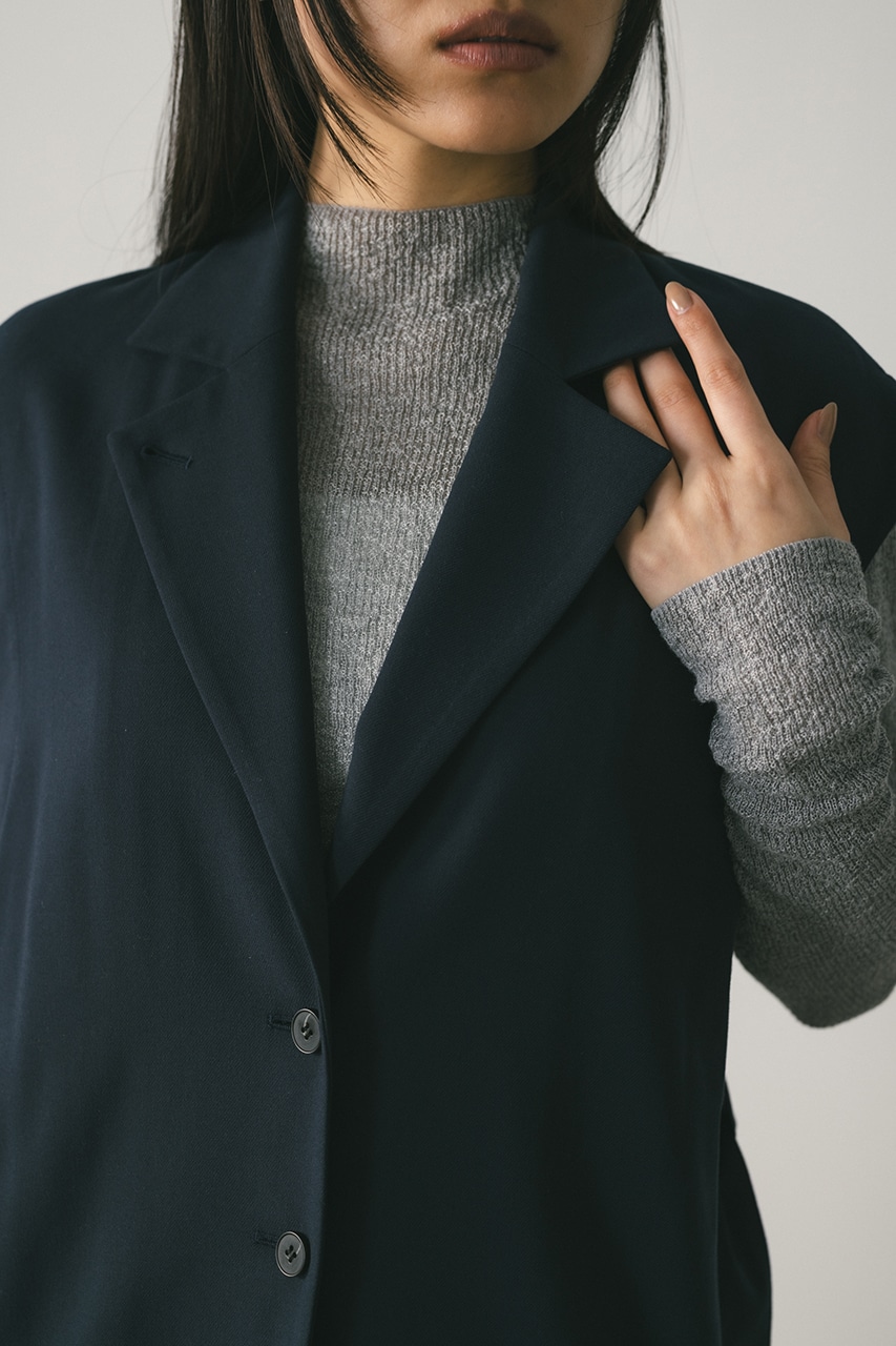 第二ラペルのボタンやウエストベルトでシルエット変化を楽しんでいただける一枚です。