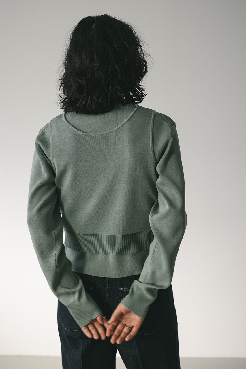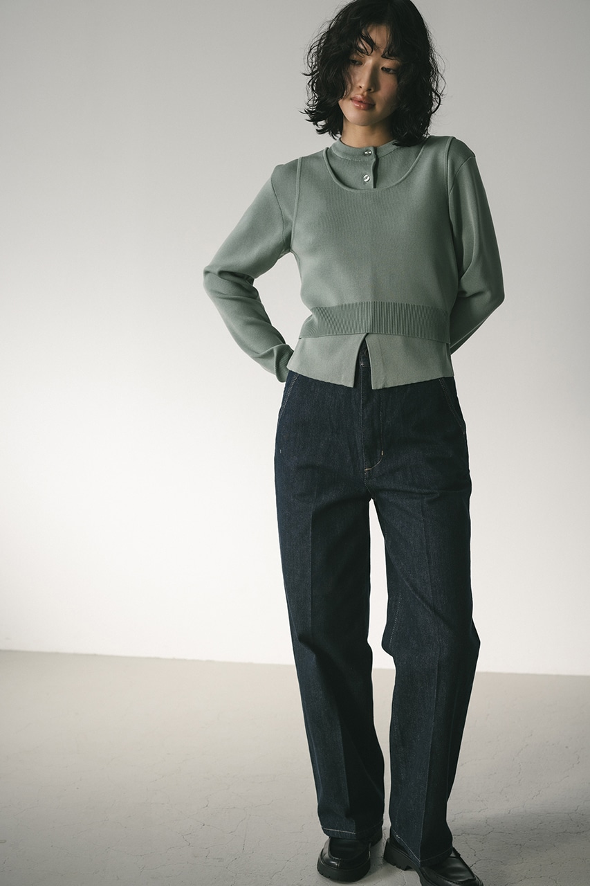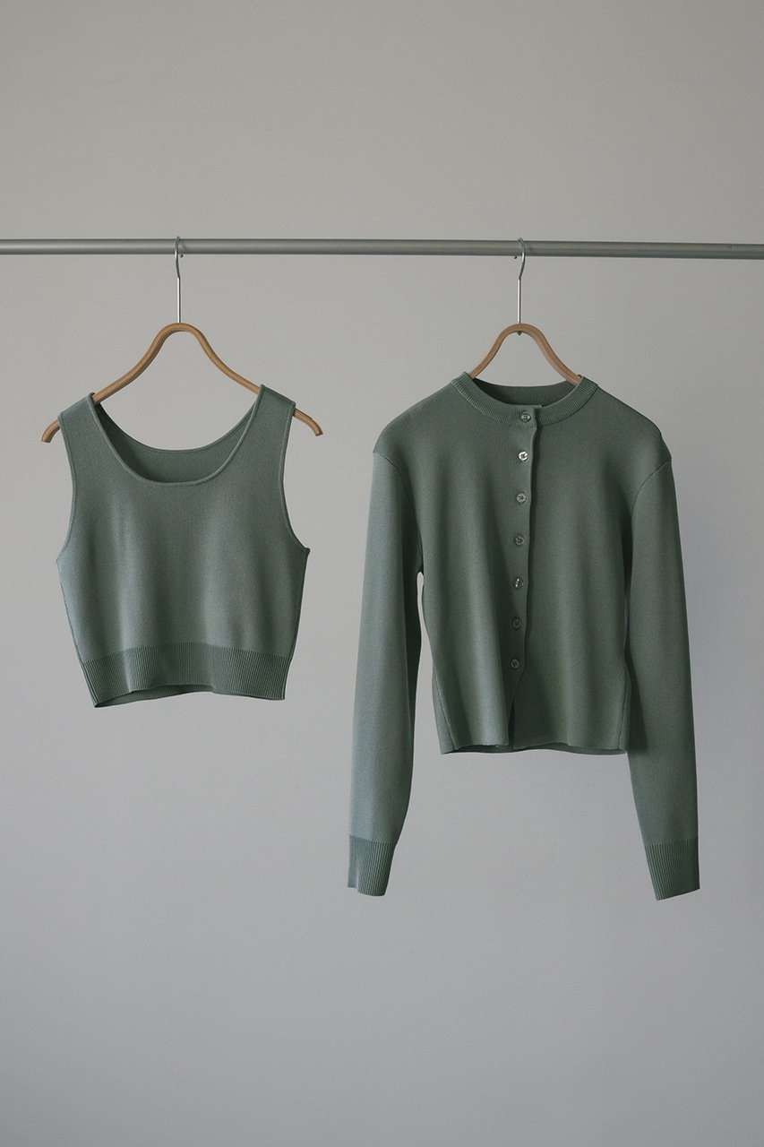 スタイルアップ見えするコンパクトなシルエットのニットカーデと前後2WAYで着用できるタンクのセットアイテム。