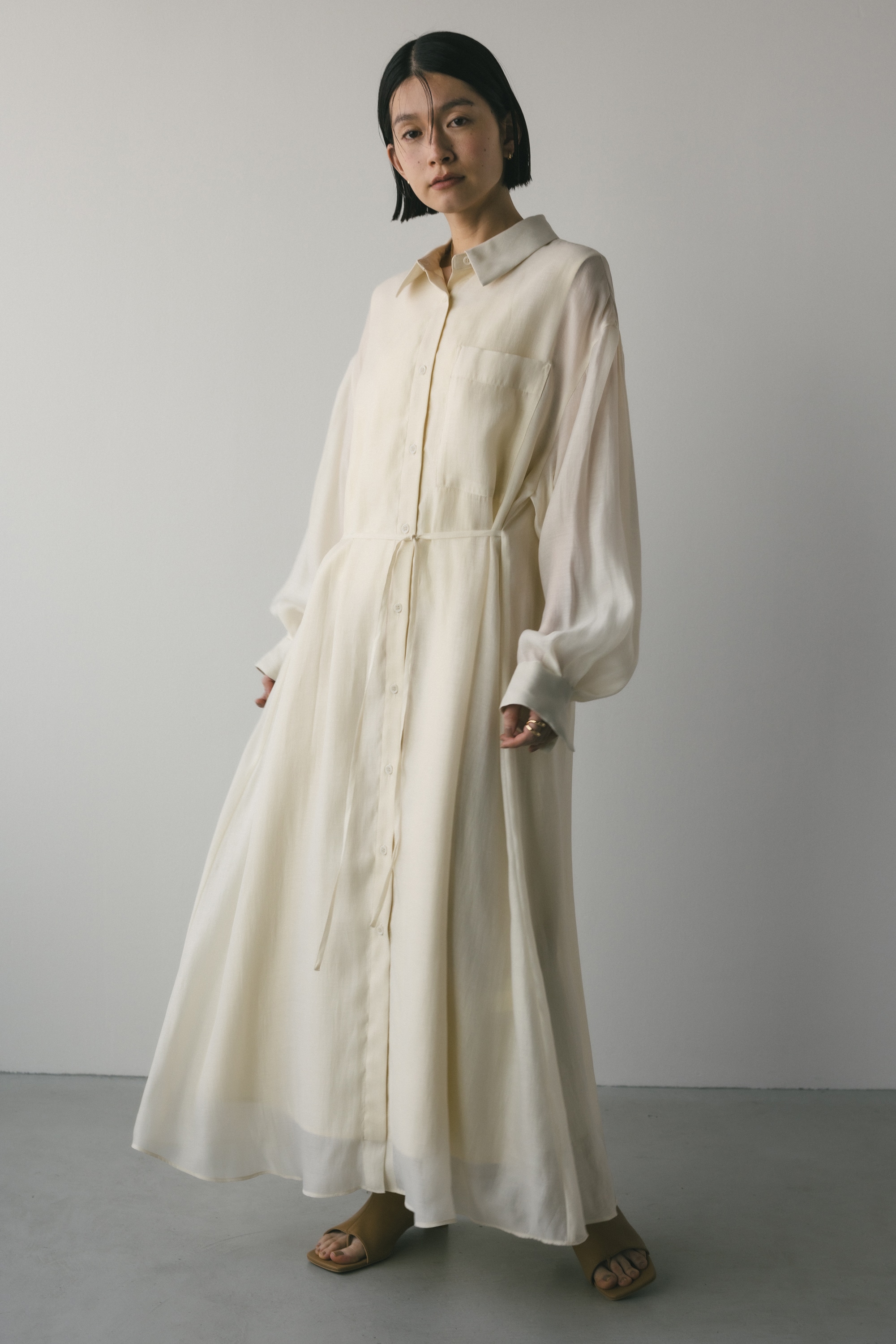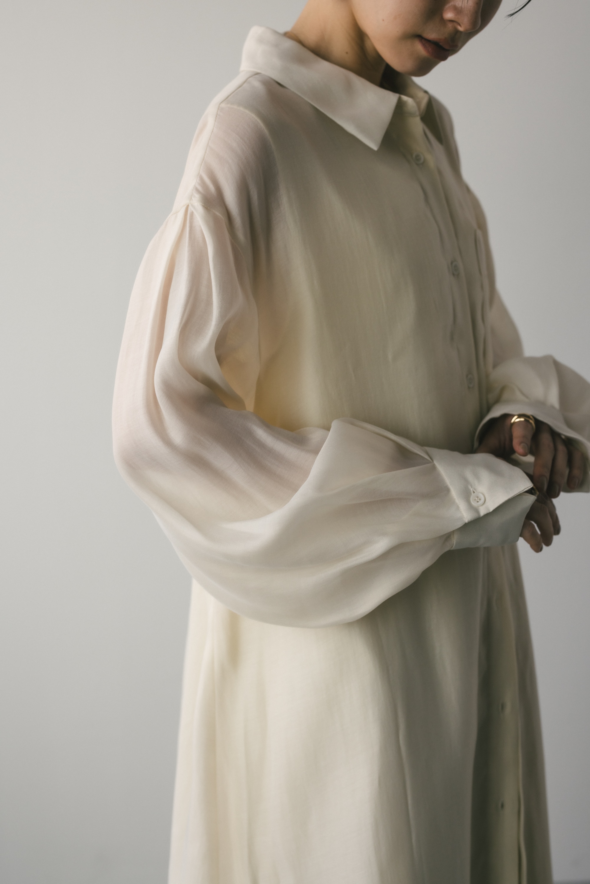 膨らみのある優しい雰囲気のシアーシャツに透けない素材のタンクワンピースがドッキングしたワンピース。