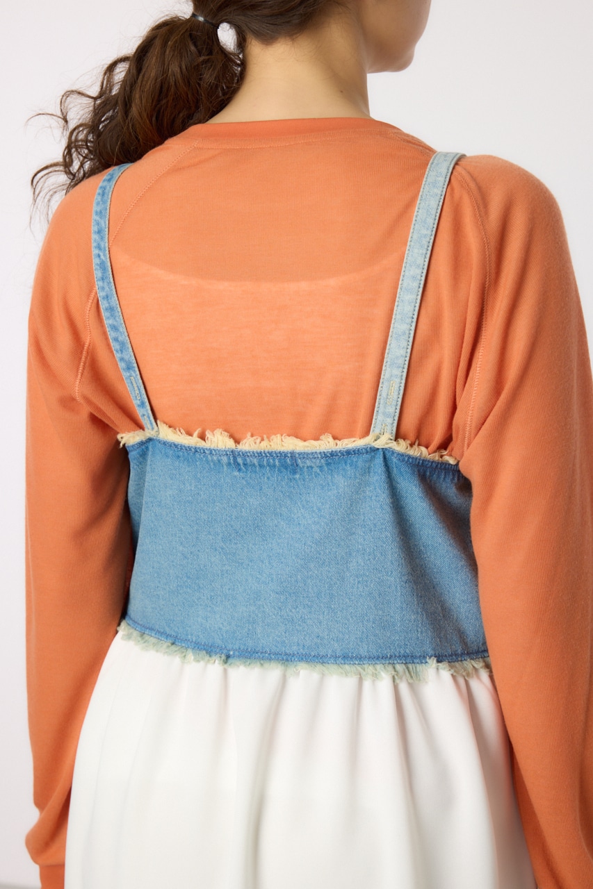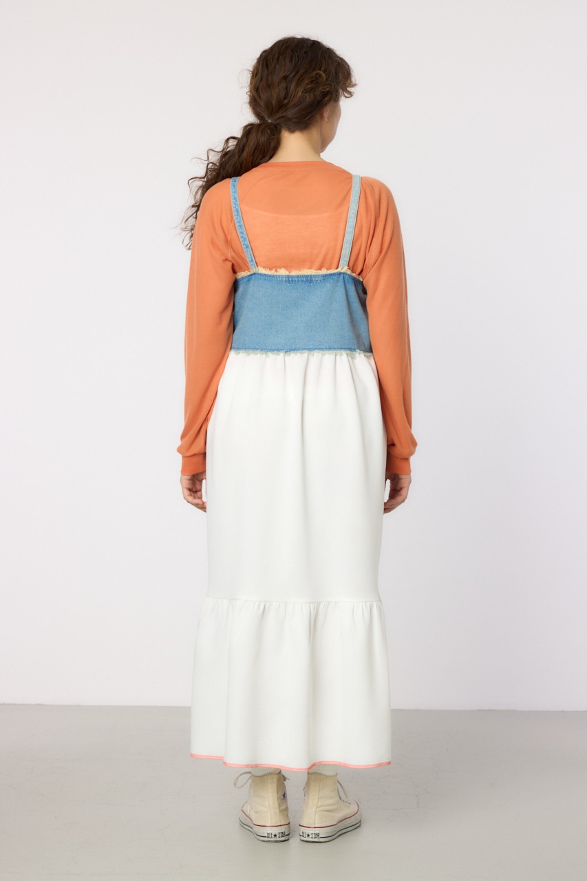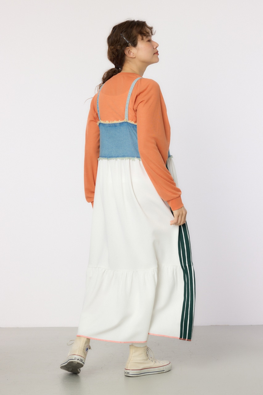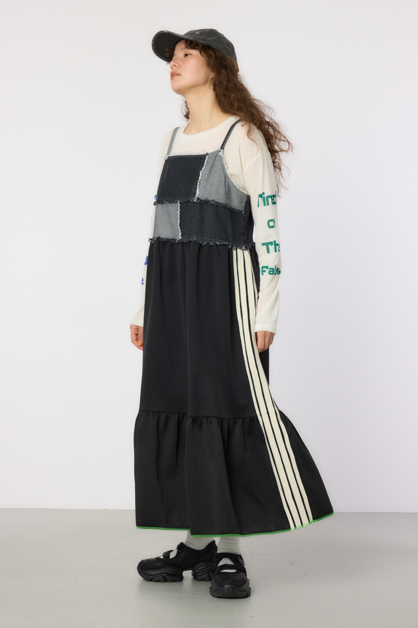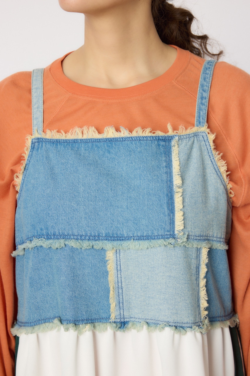胸部分はデニムをパッチワーク状に使い、スカート部分はジャージをティアードさせたデザインに。
