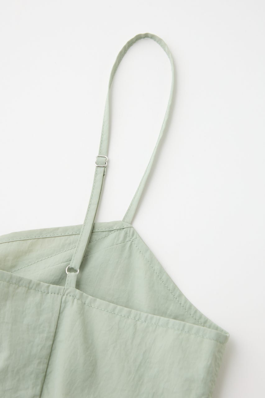 フロントネック部分のレイヤード風デザインと、フロントに長く使用したメタルファスナーがポイントのジップアップナイロンキャミドレス。