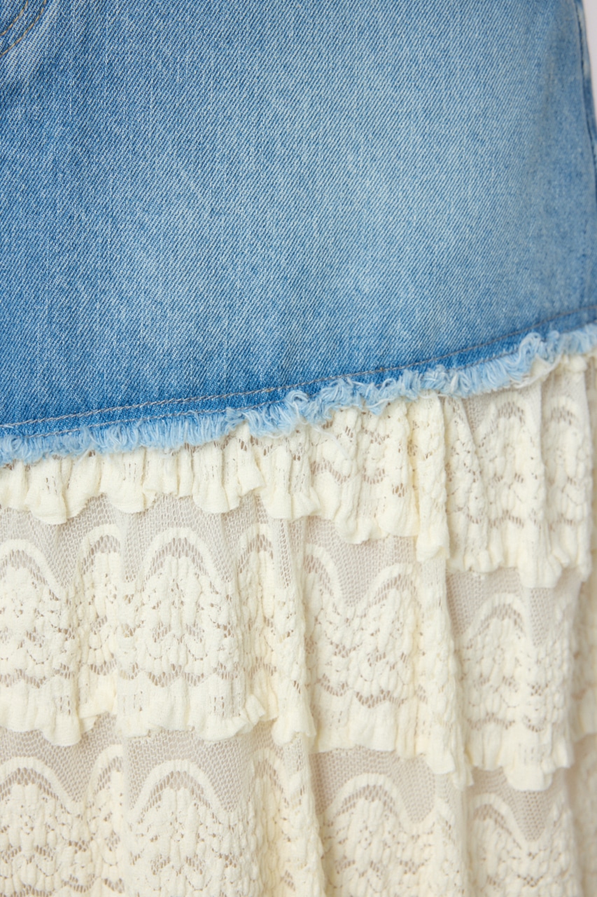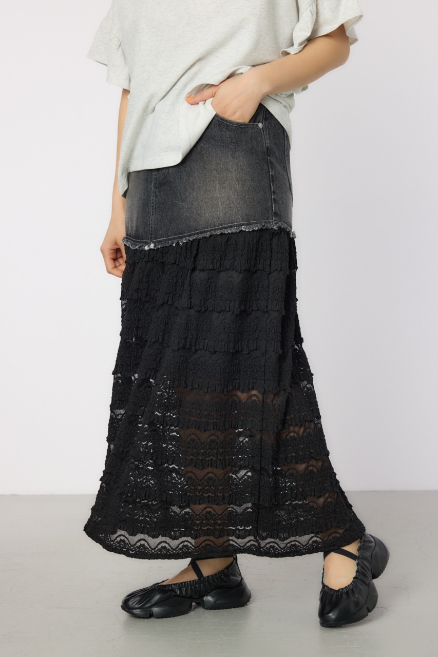 デニム部分をUSED加工後に、ティアード状に編み立てたレースとドッキングしてリメイク風デザインに。