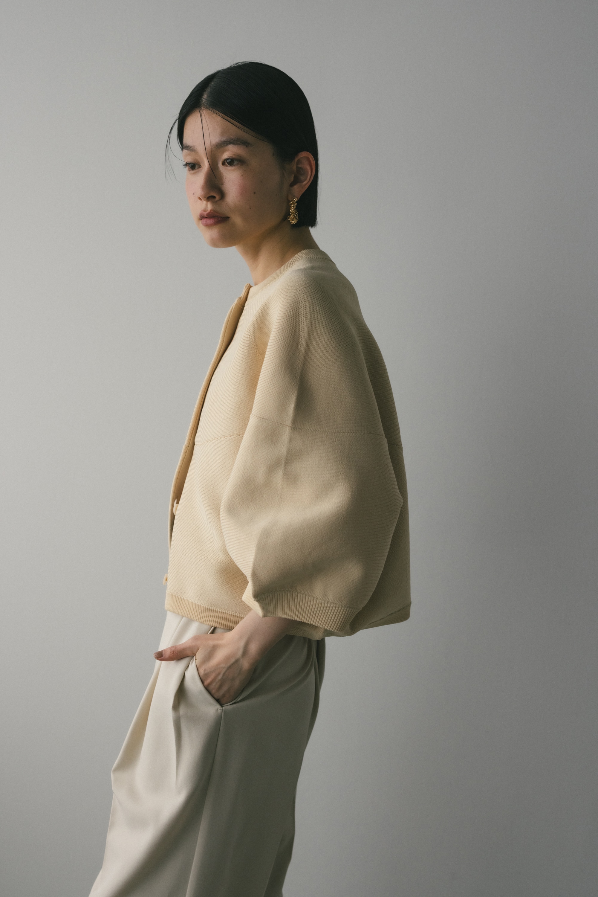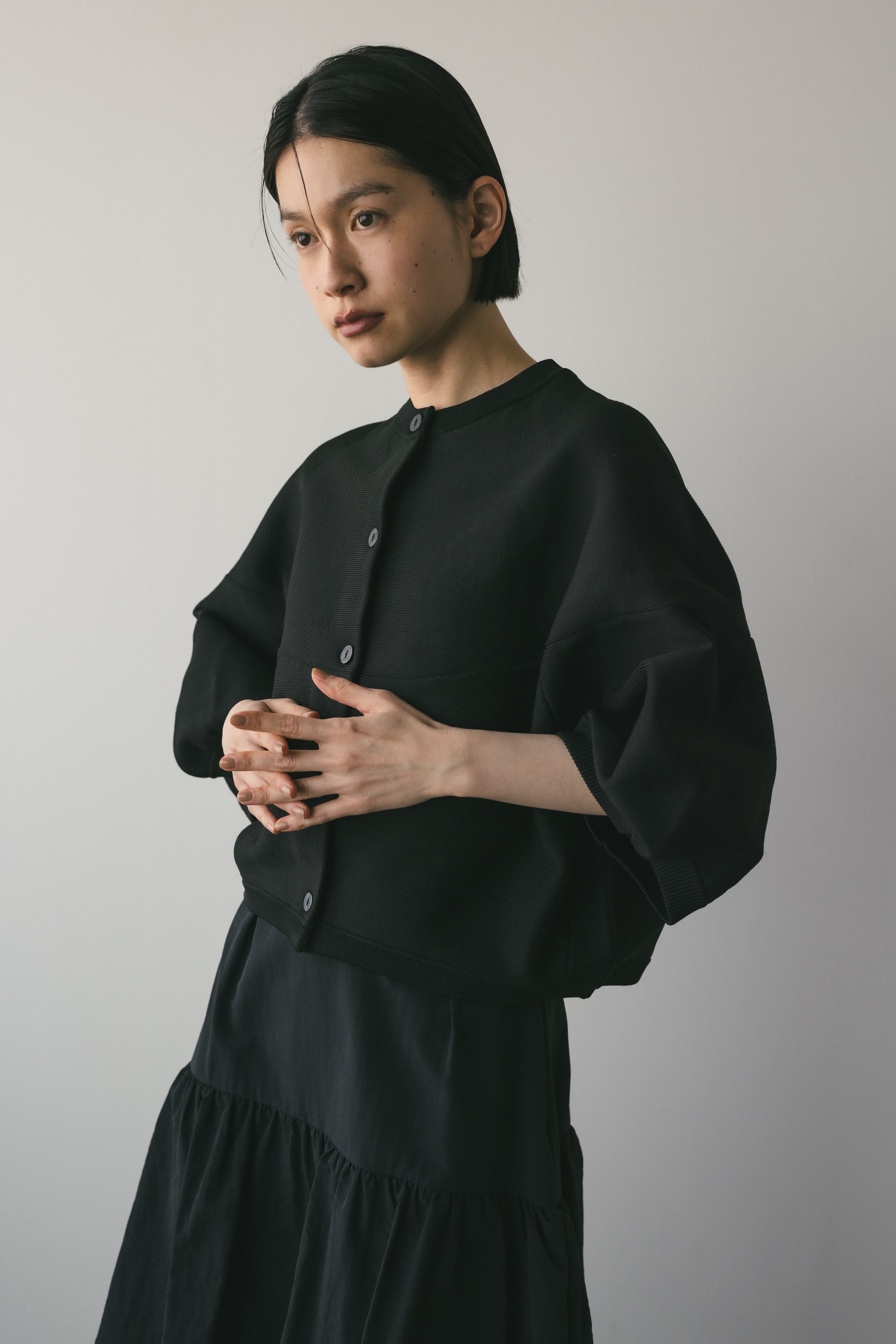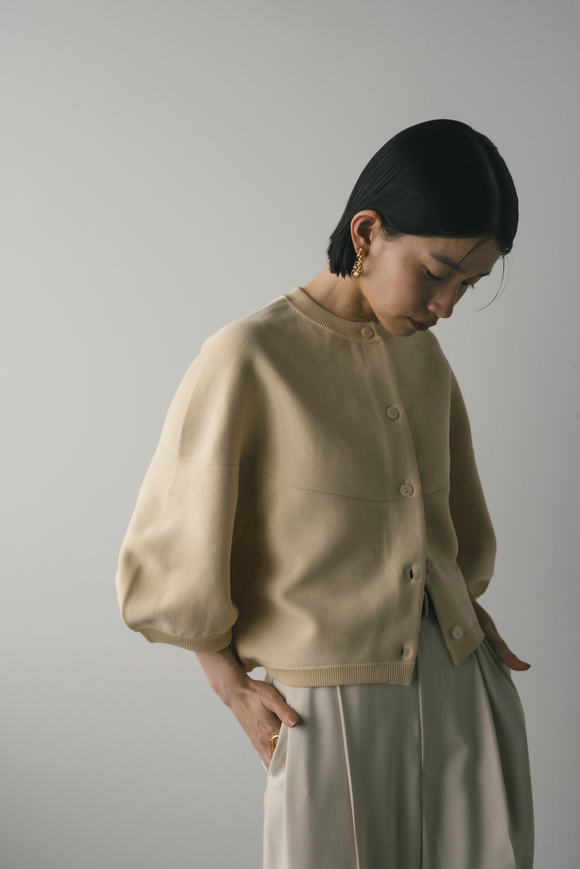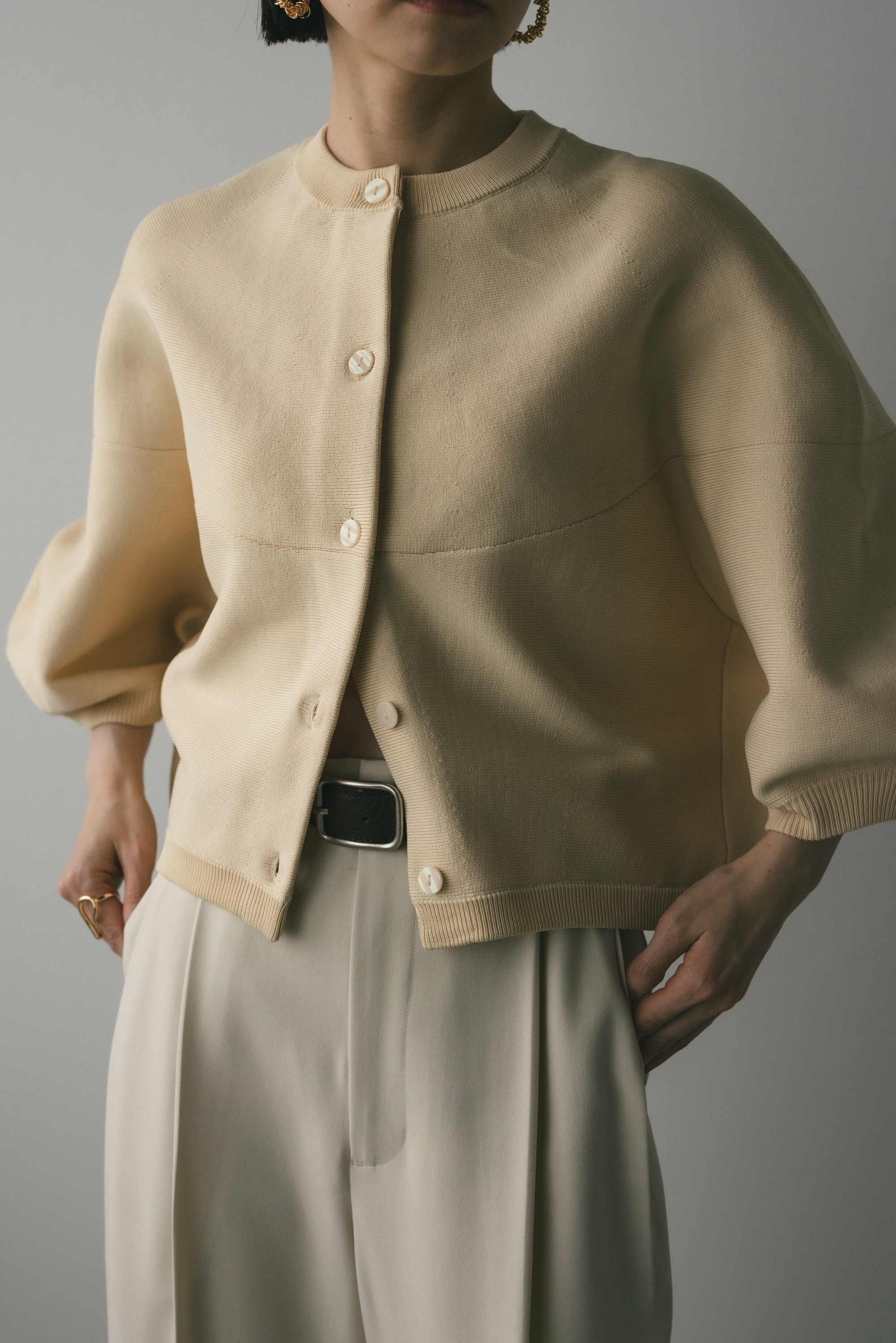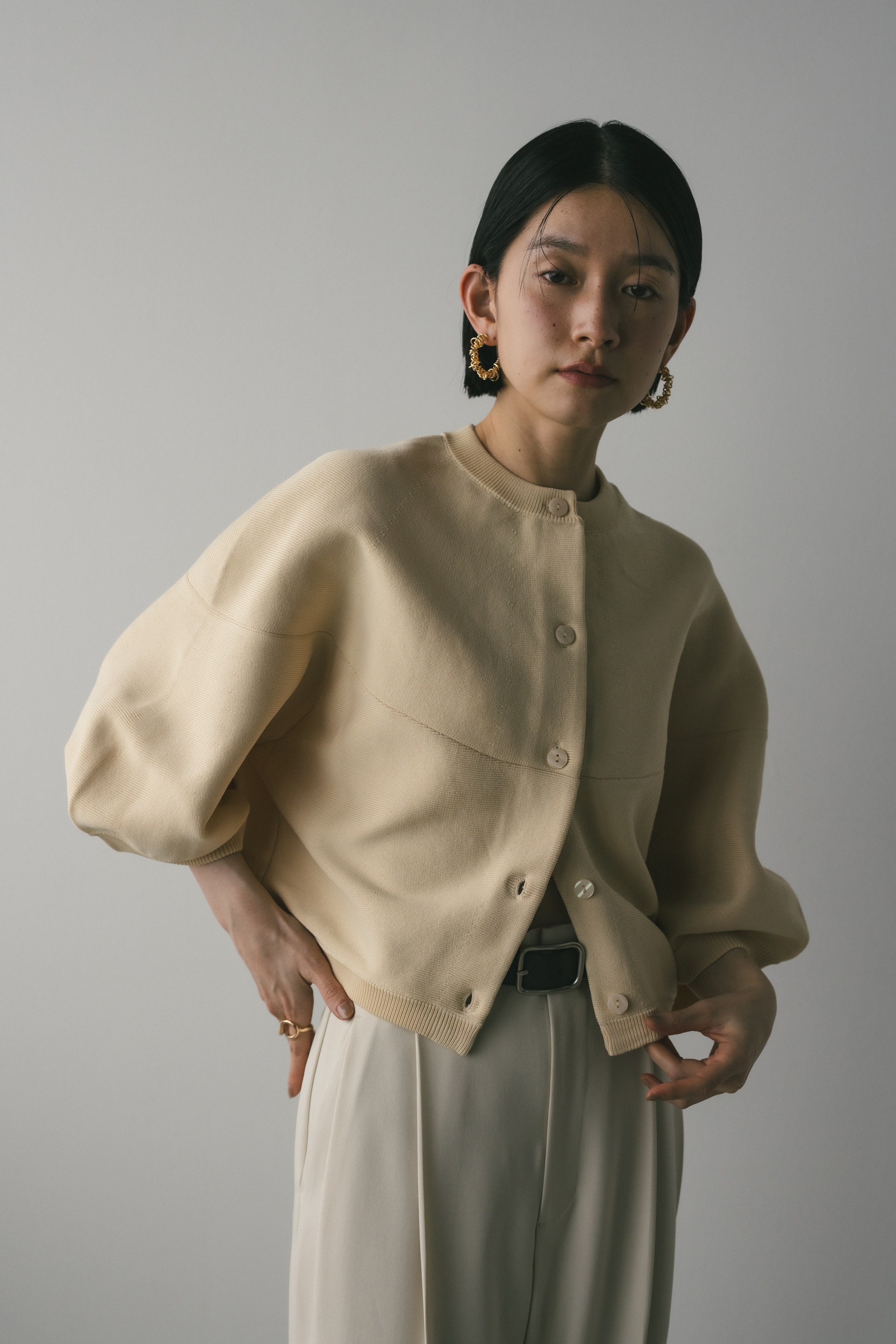大きく入ったラウンドパネルが作るシルエットが可愛いカーデ。