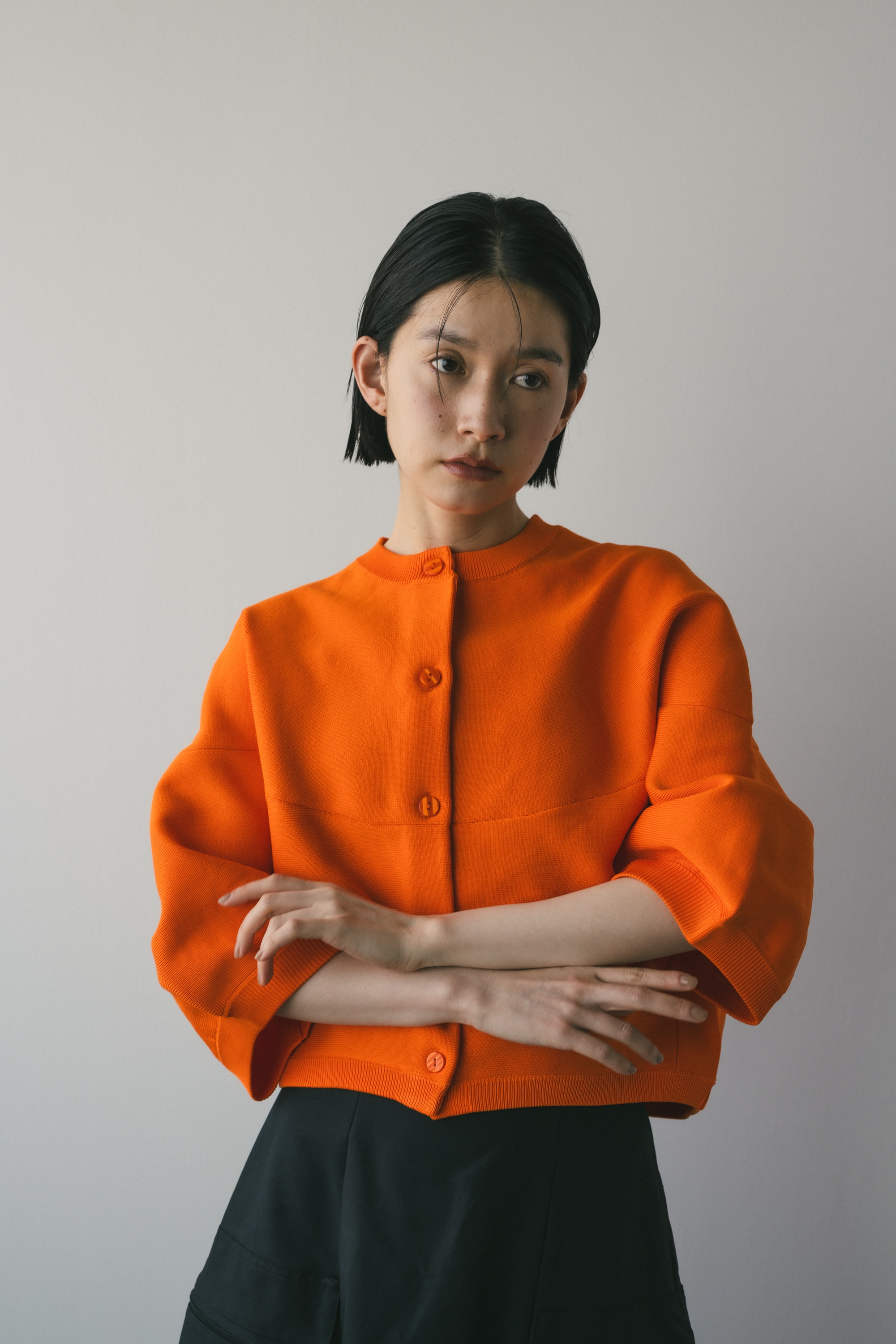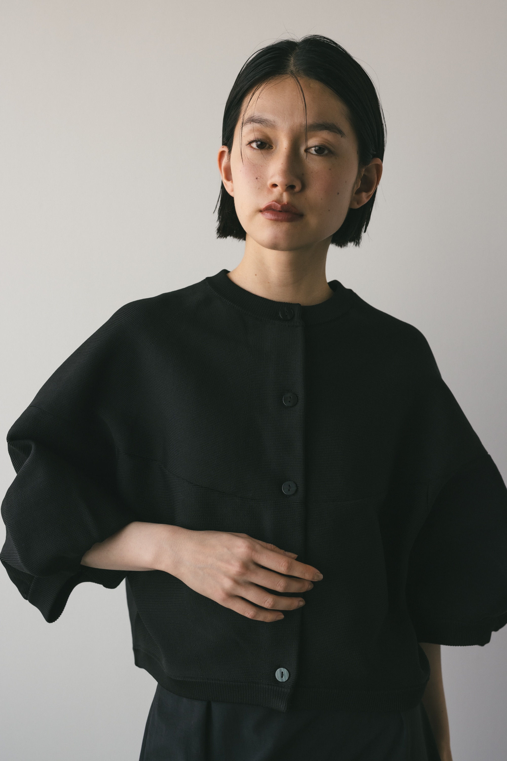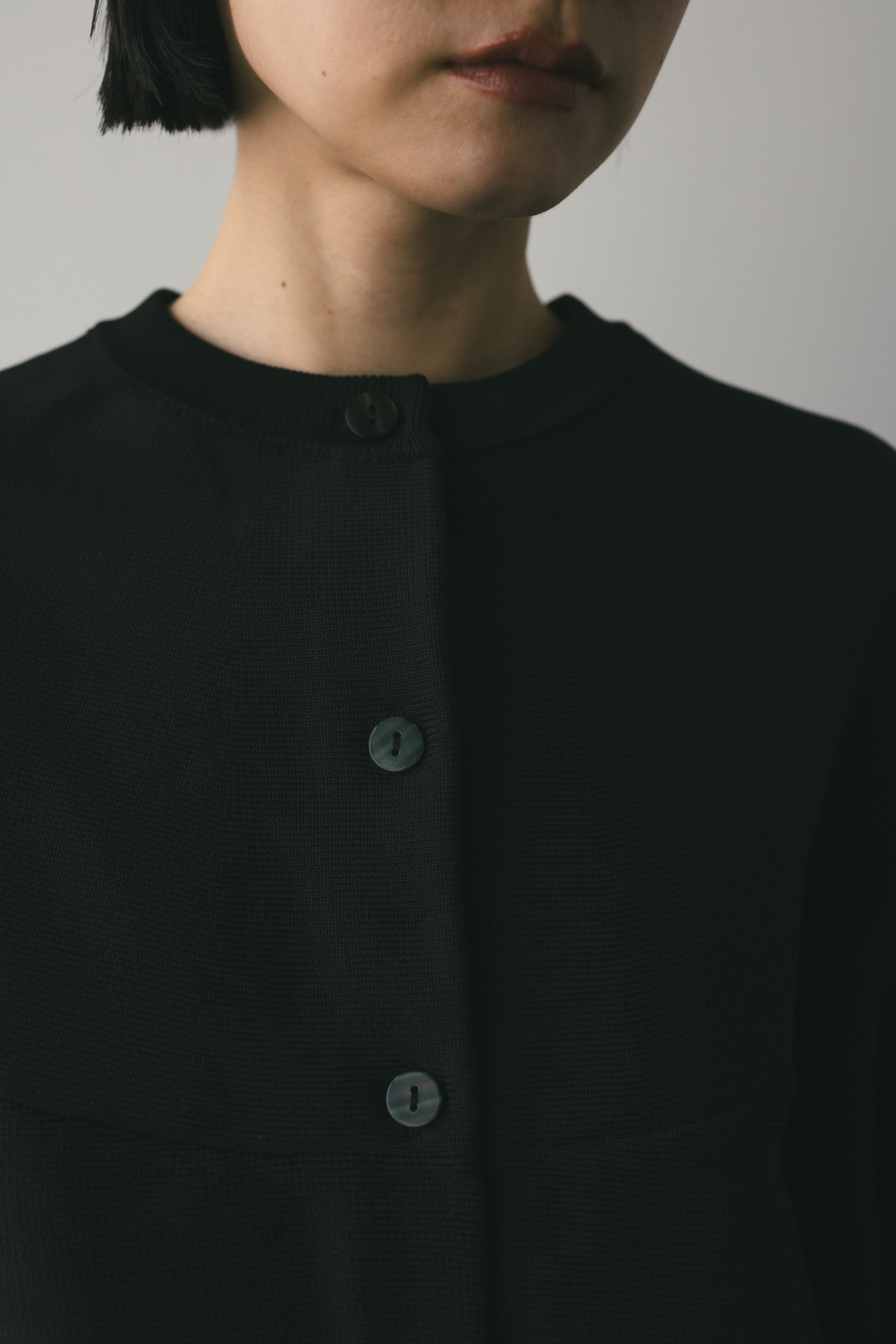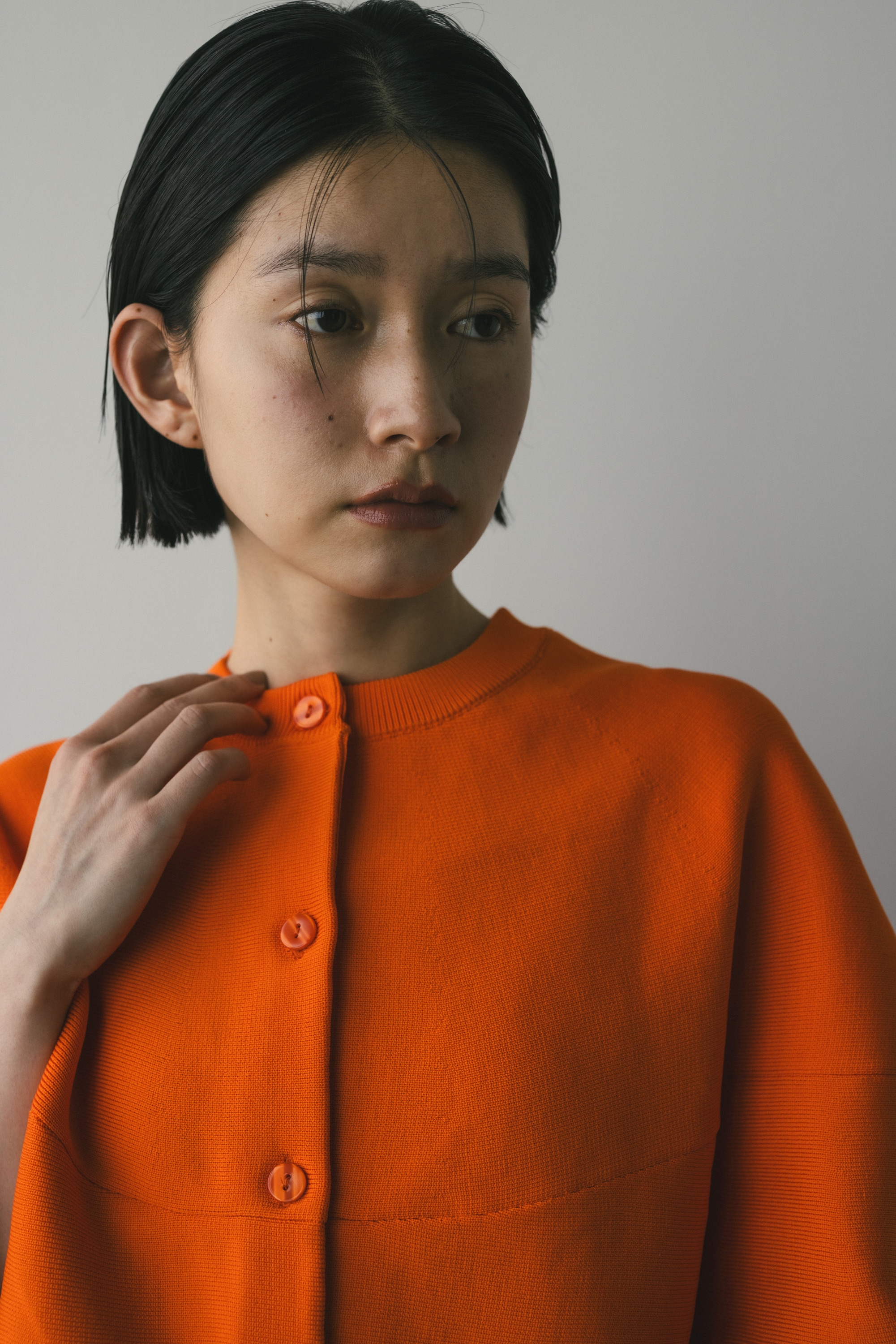 大きく入ったラウンドパネルが作るシルエットが可愛いカーデ。