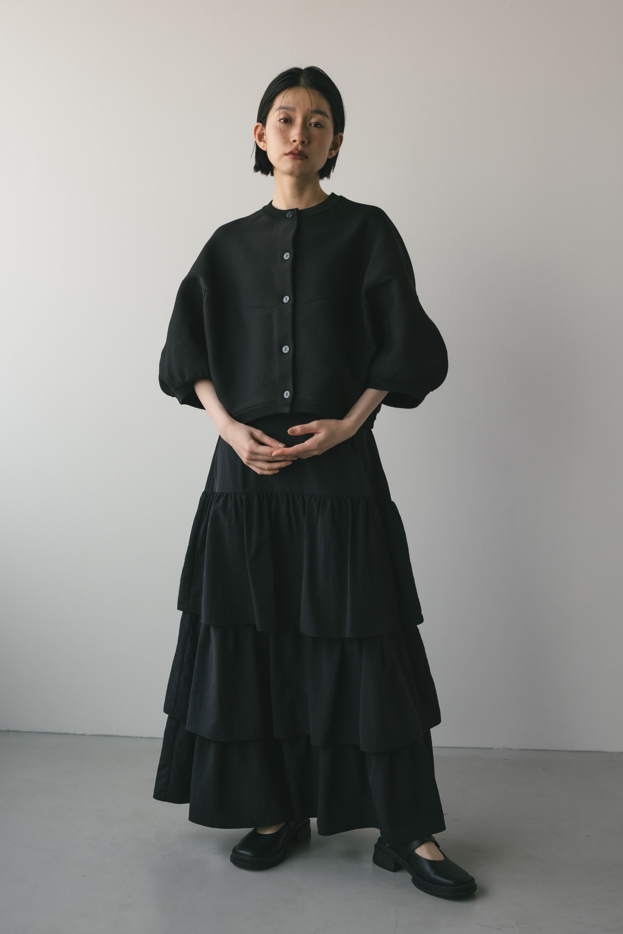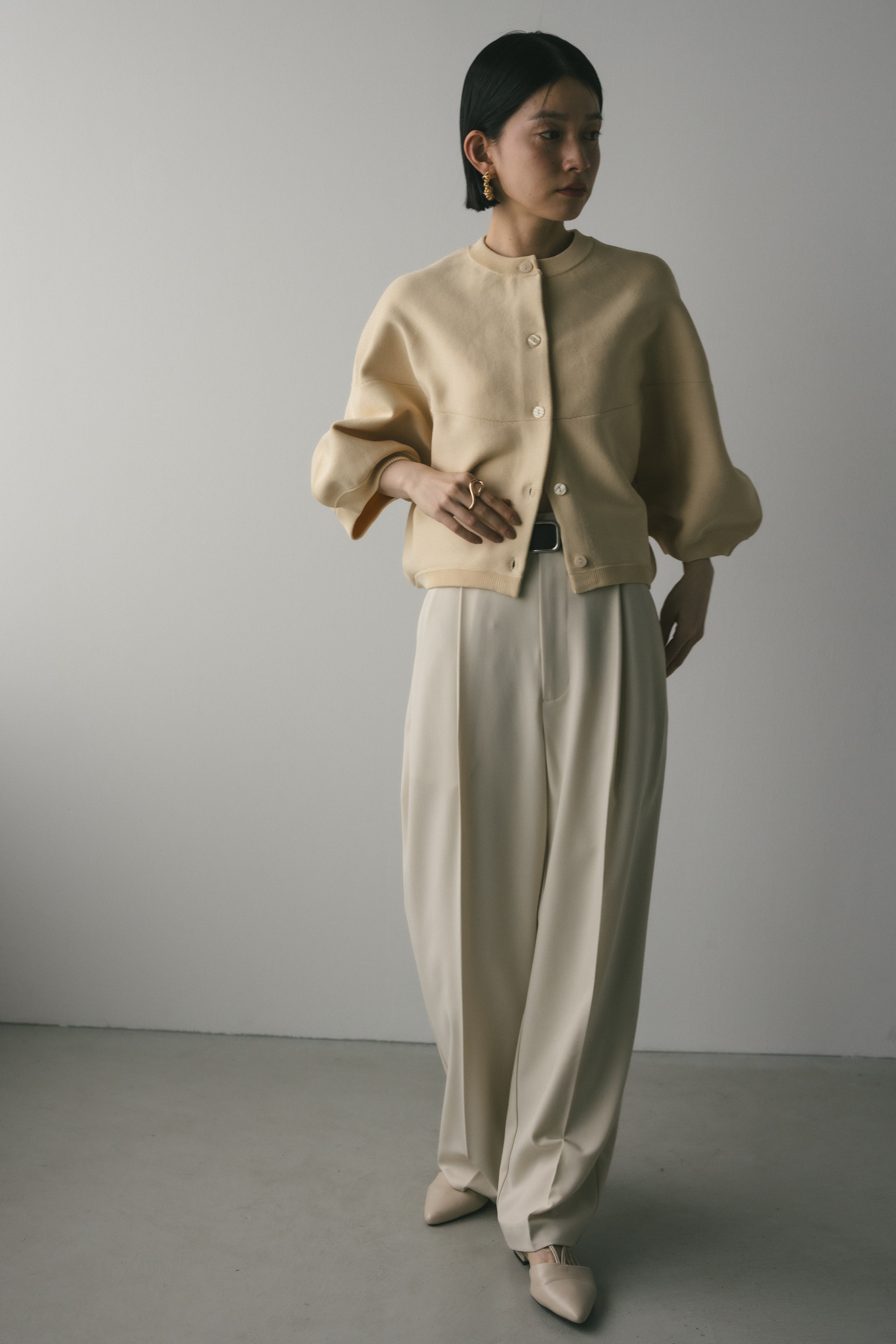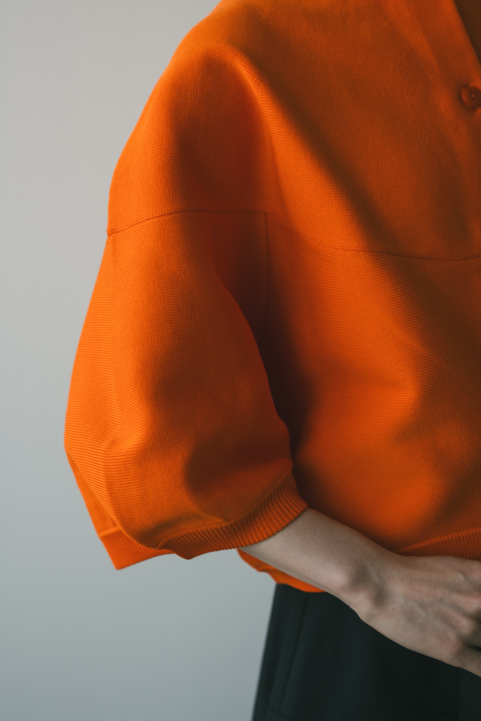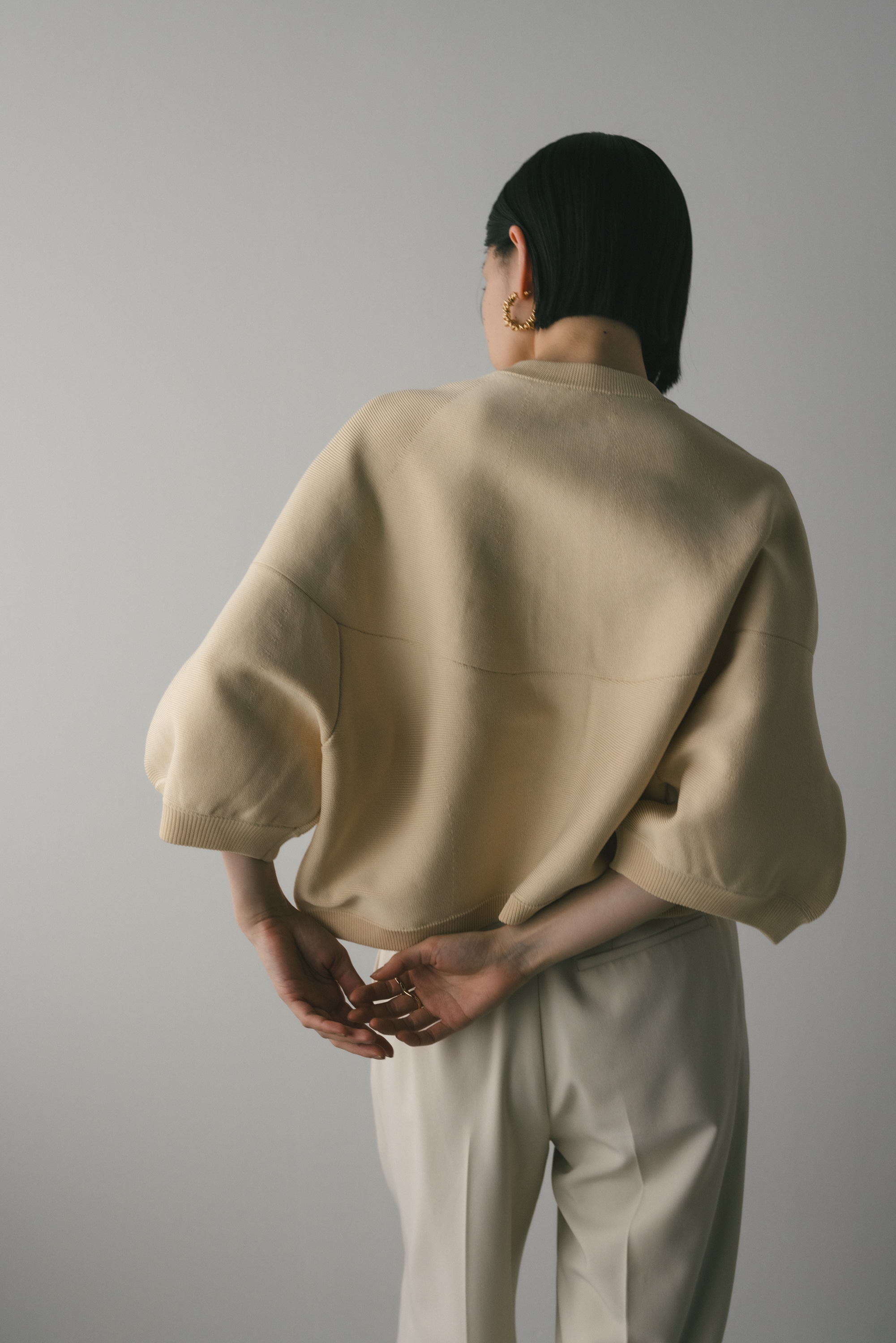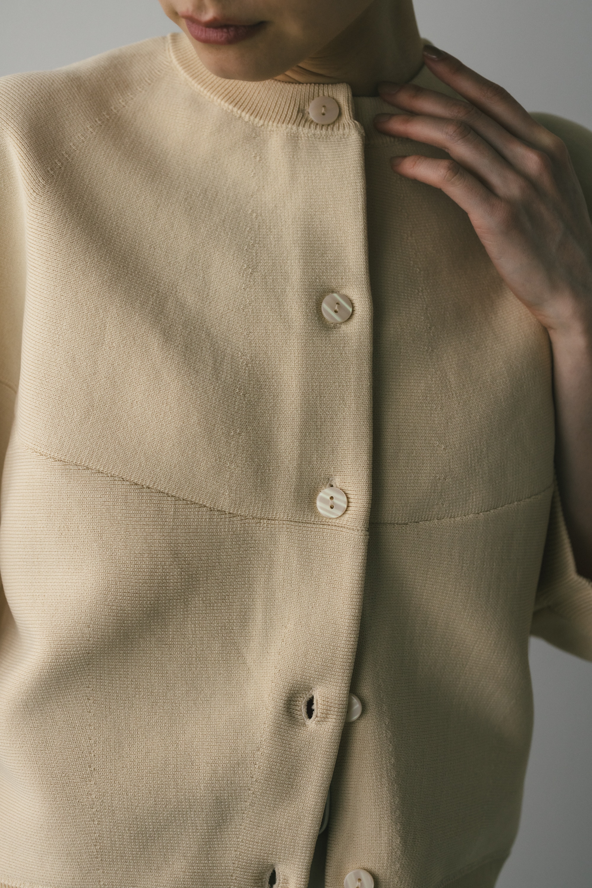 大きく入ったラウンドパネルが作るシルエットが可愛いカーデ。