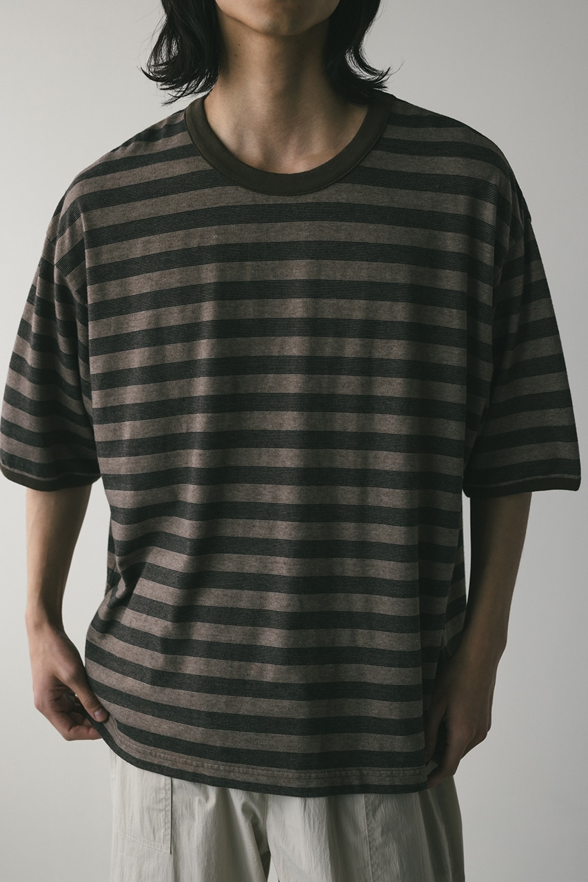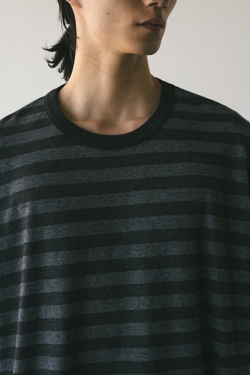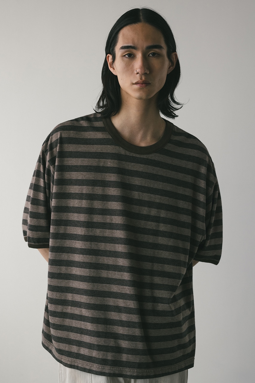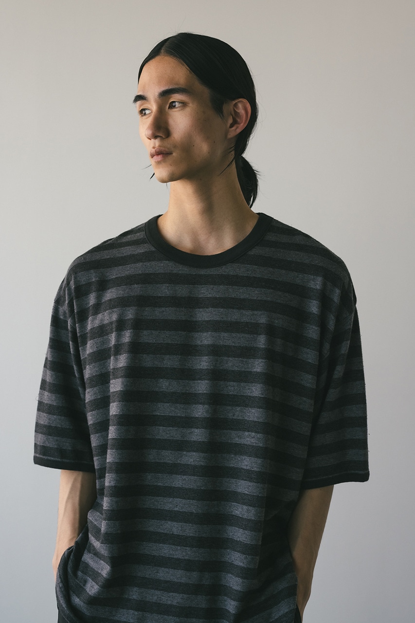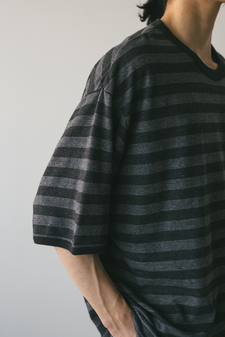 ドライな着心地ととろみが特徴の杢グレーの天竺ボーダーをベースに製品染を施した半袖Tシャツ。