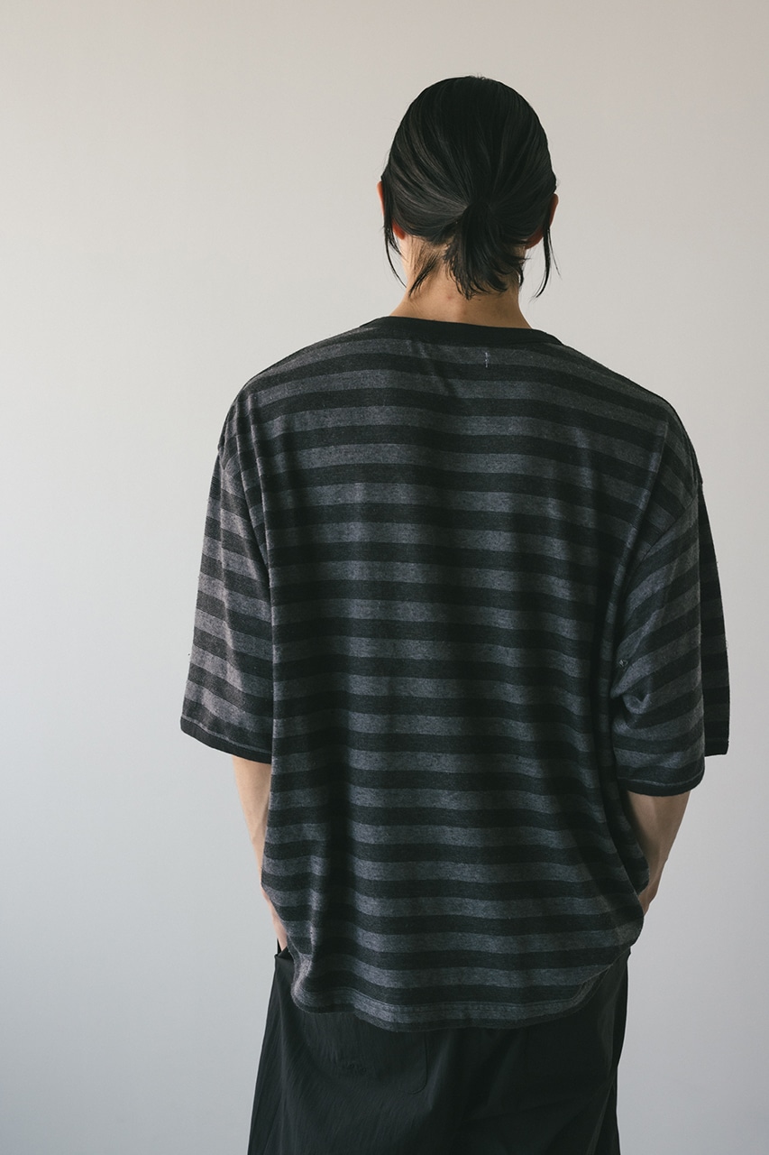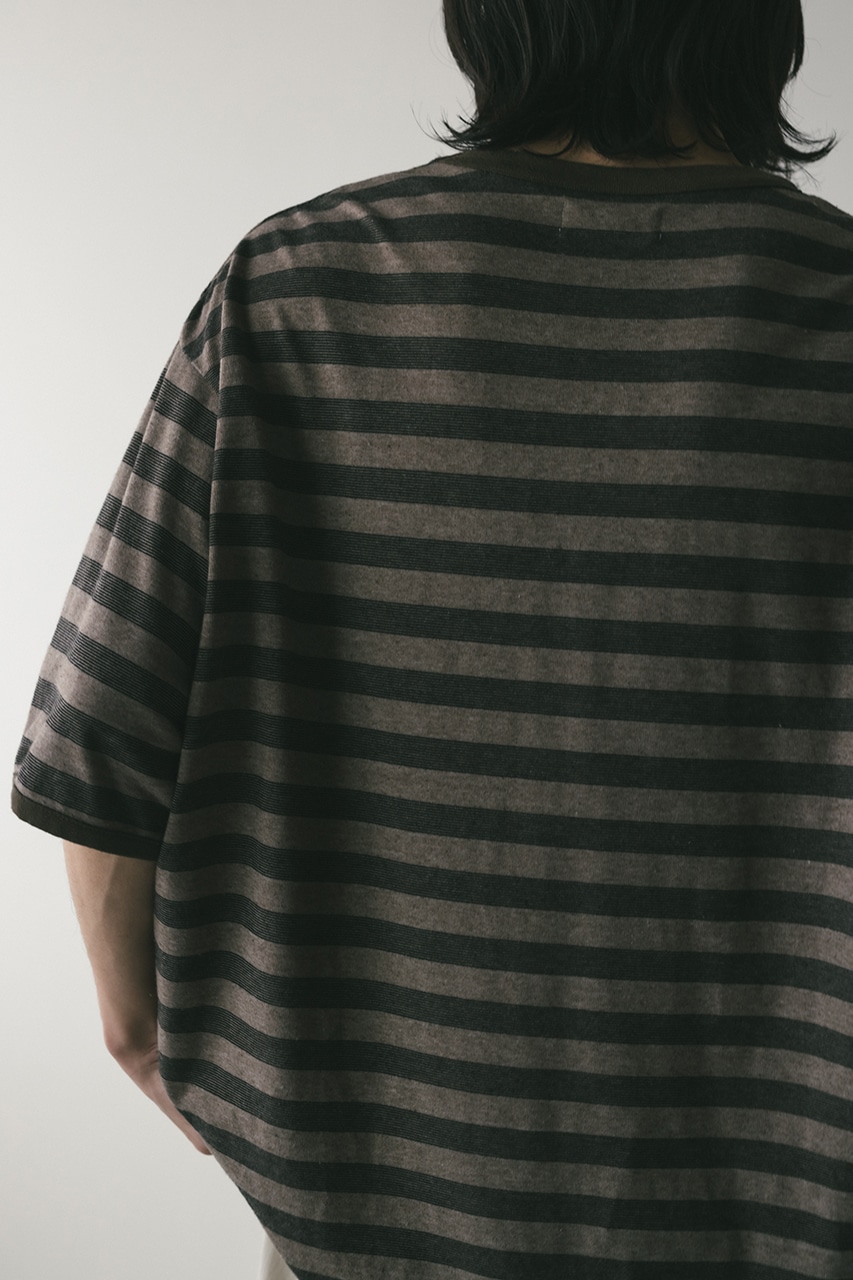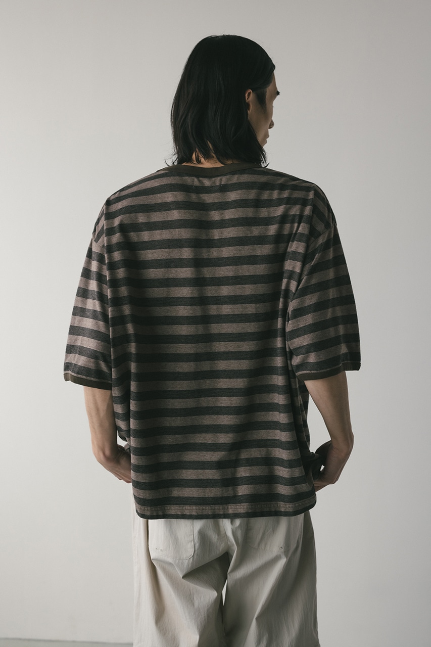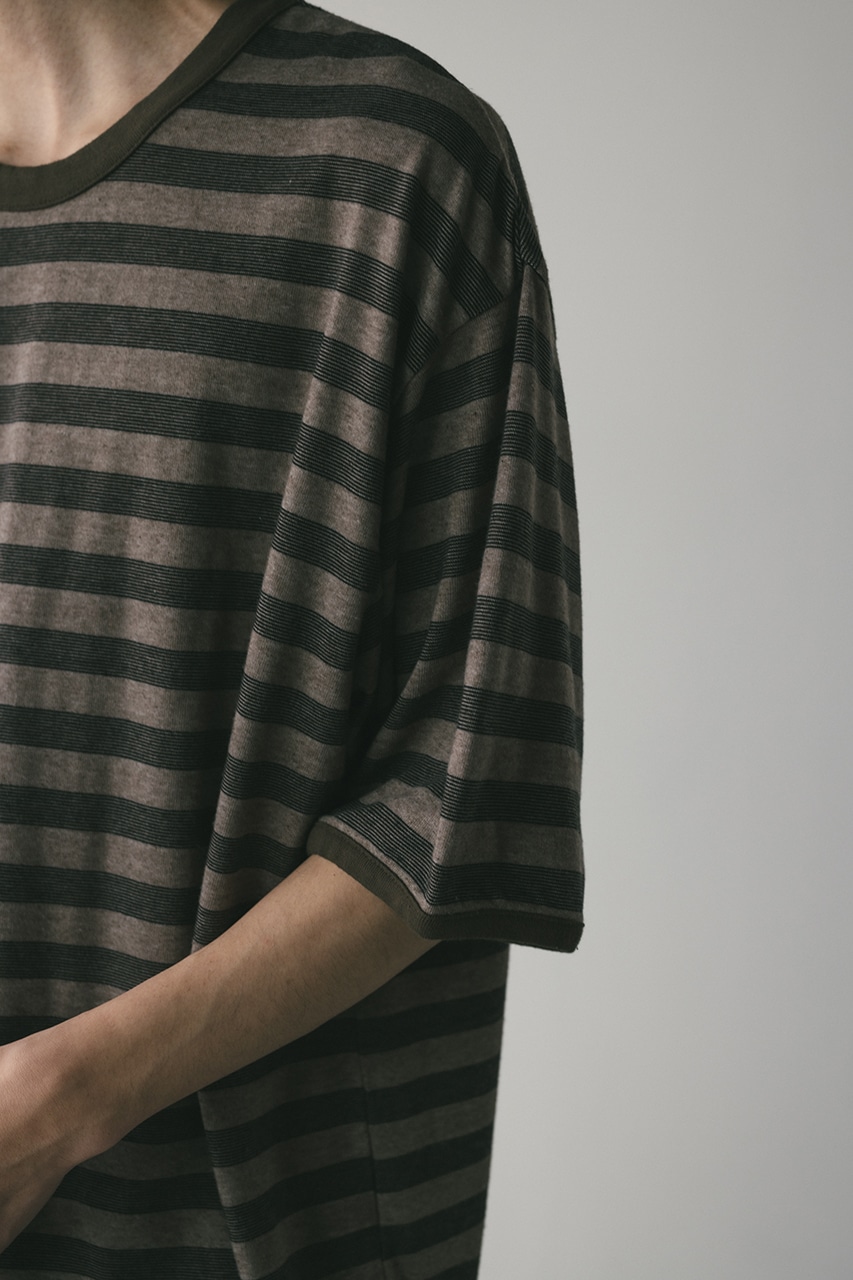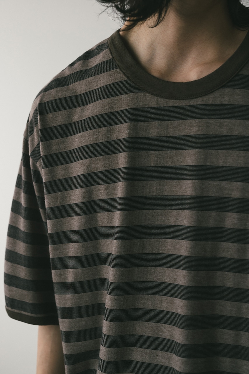 ドライな着心地ととろみが特徴の杢グレーの天竺ボーダーをベースに製品染を施した半袖Tシャツ。