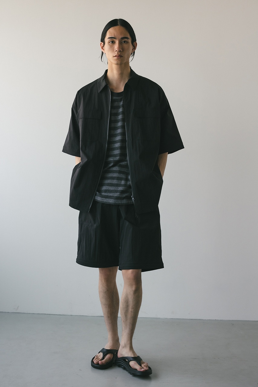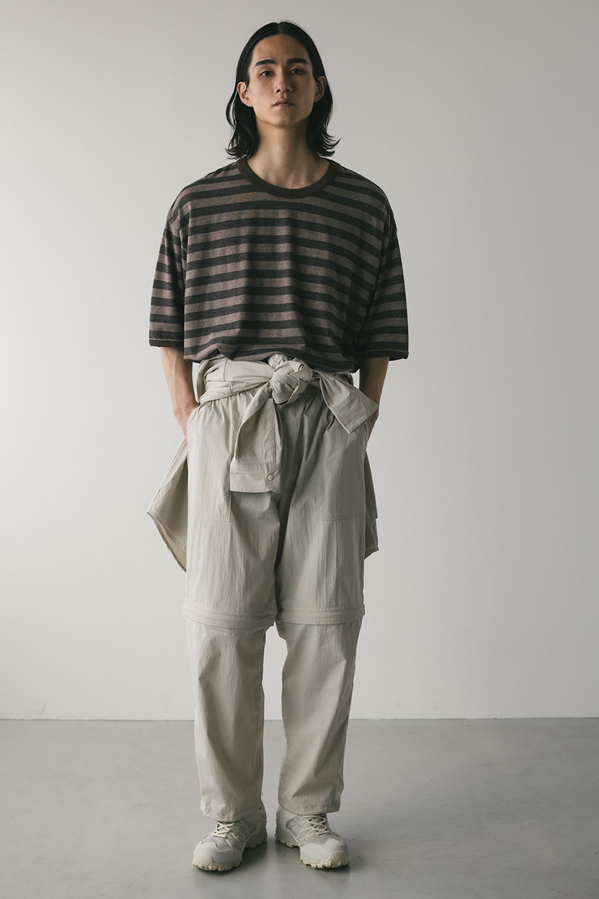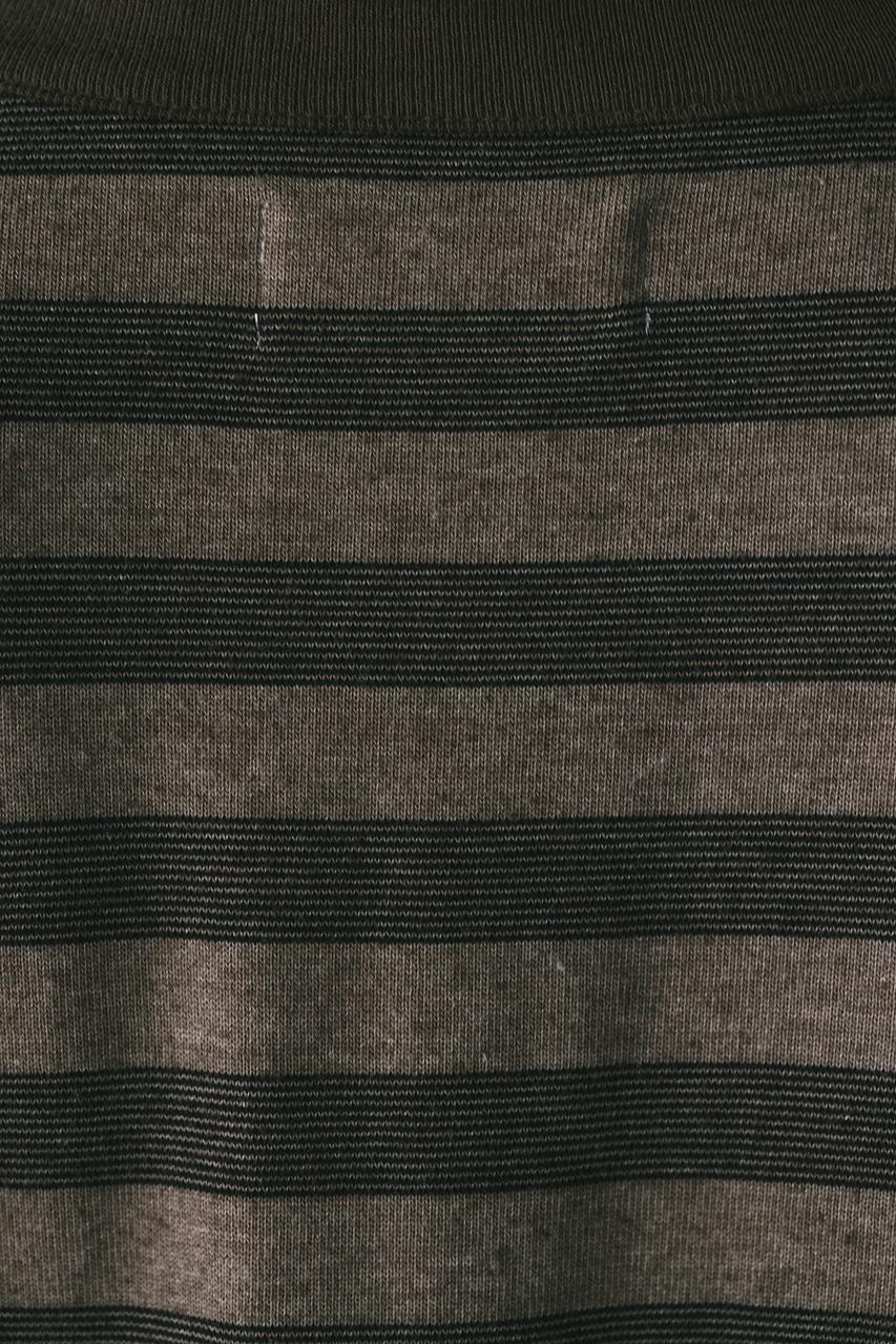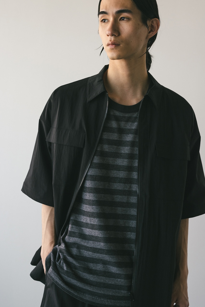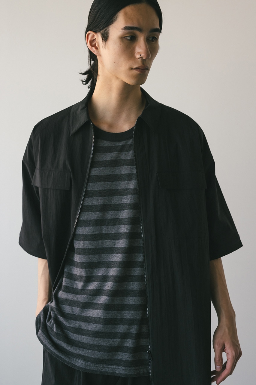ドライな着心地ととろみが特徴の杢グレーの天竺ボーダーをベースに製品染を施した半袖Tシャツ。
