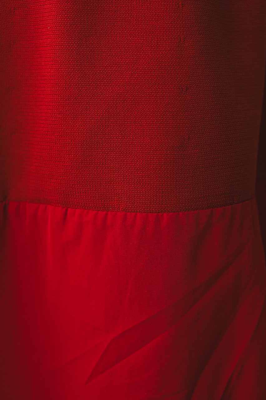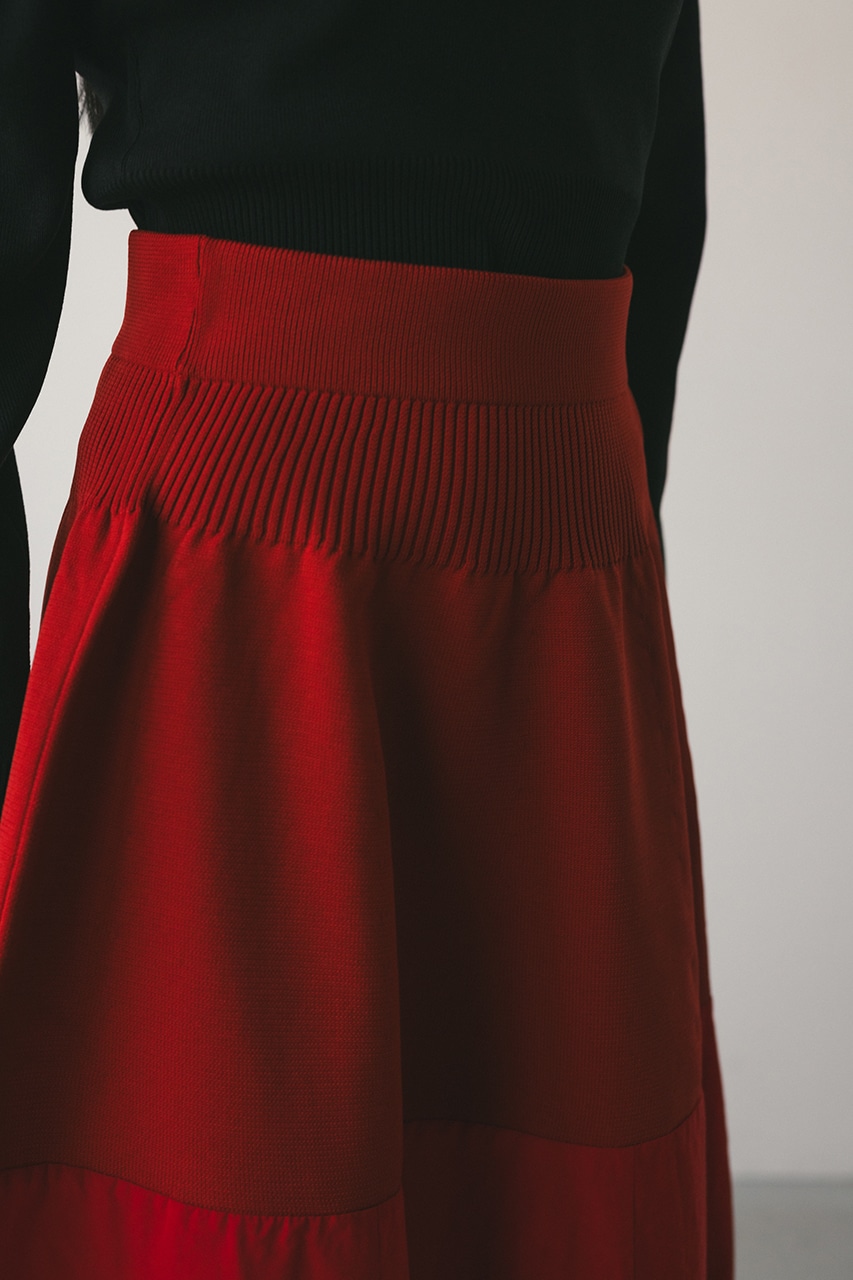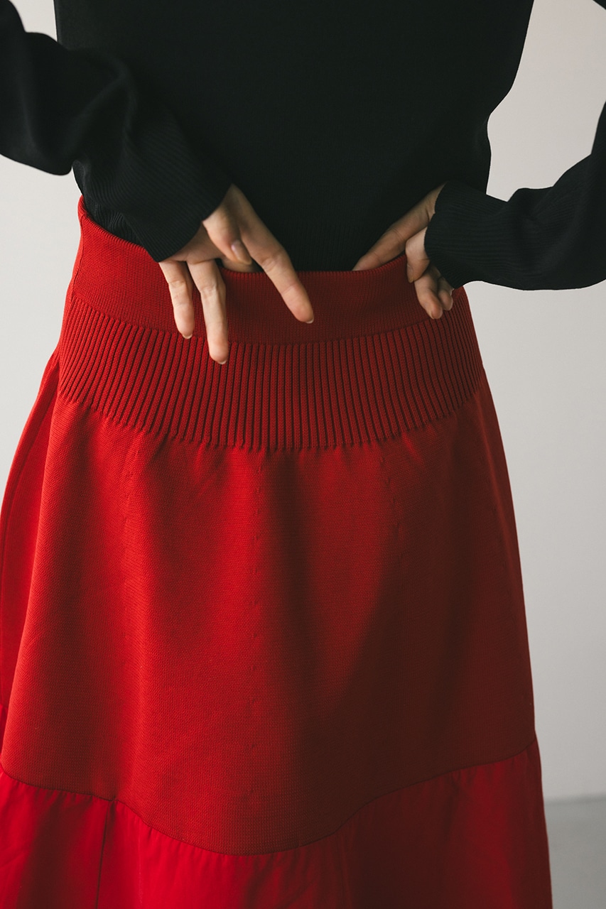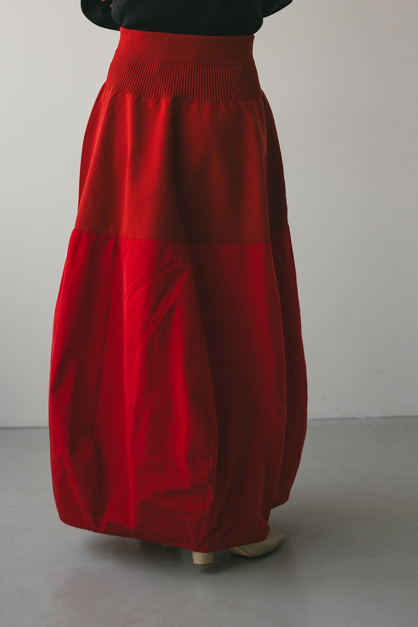 ウエストはゴム仕立てのニット素材で履きやすく、裾にかけては布帛仕立ての8枚のパネルで作る立体パターンのコクーンシルエットがポイント。