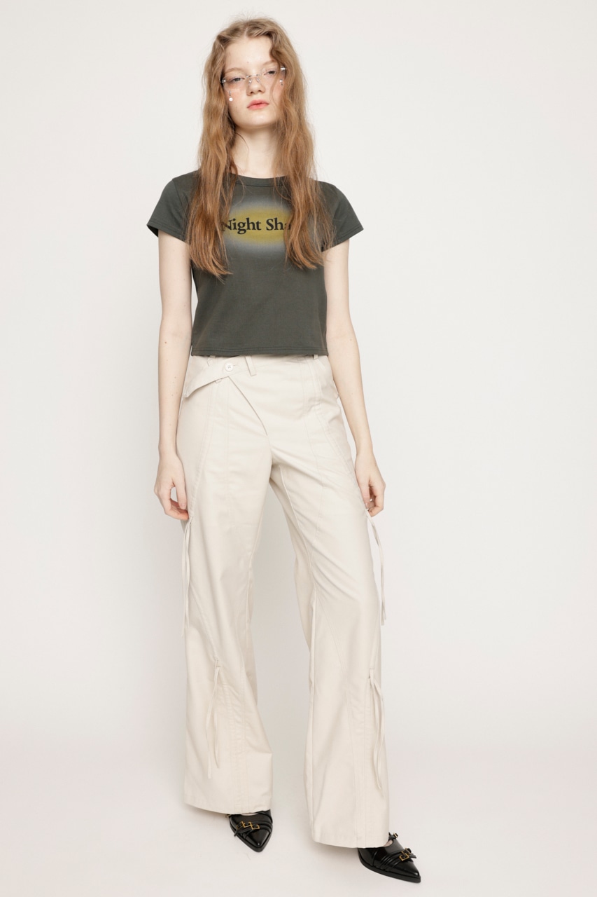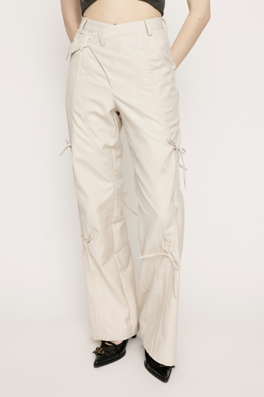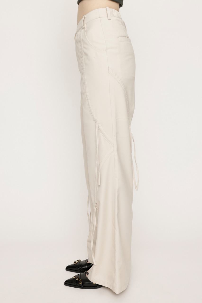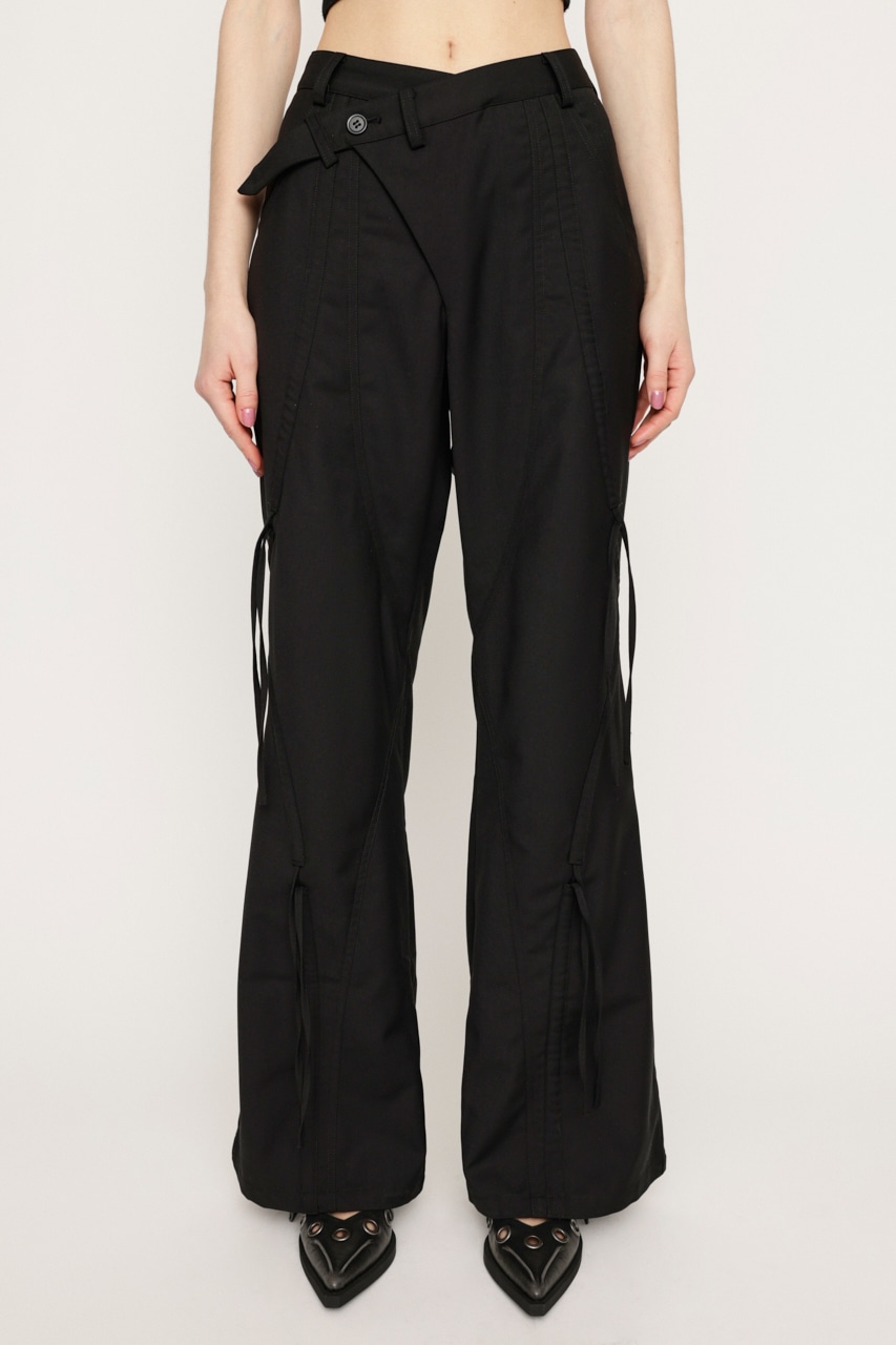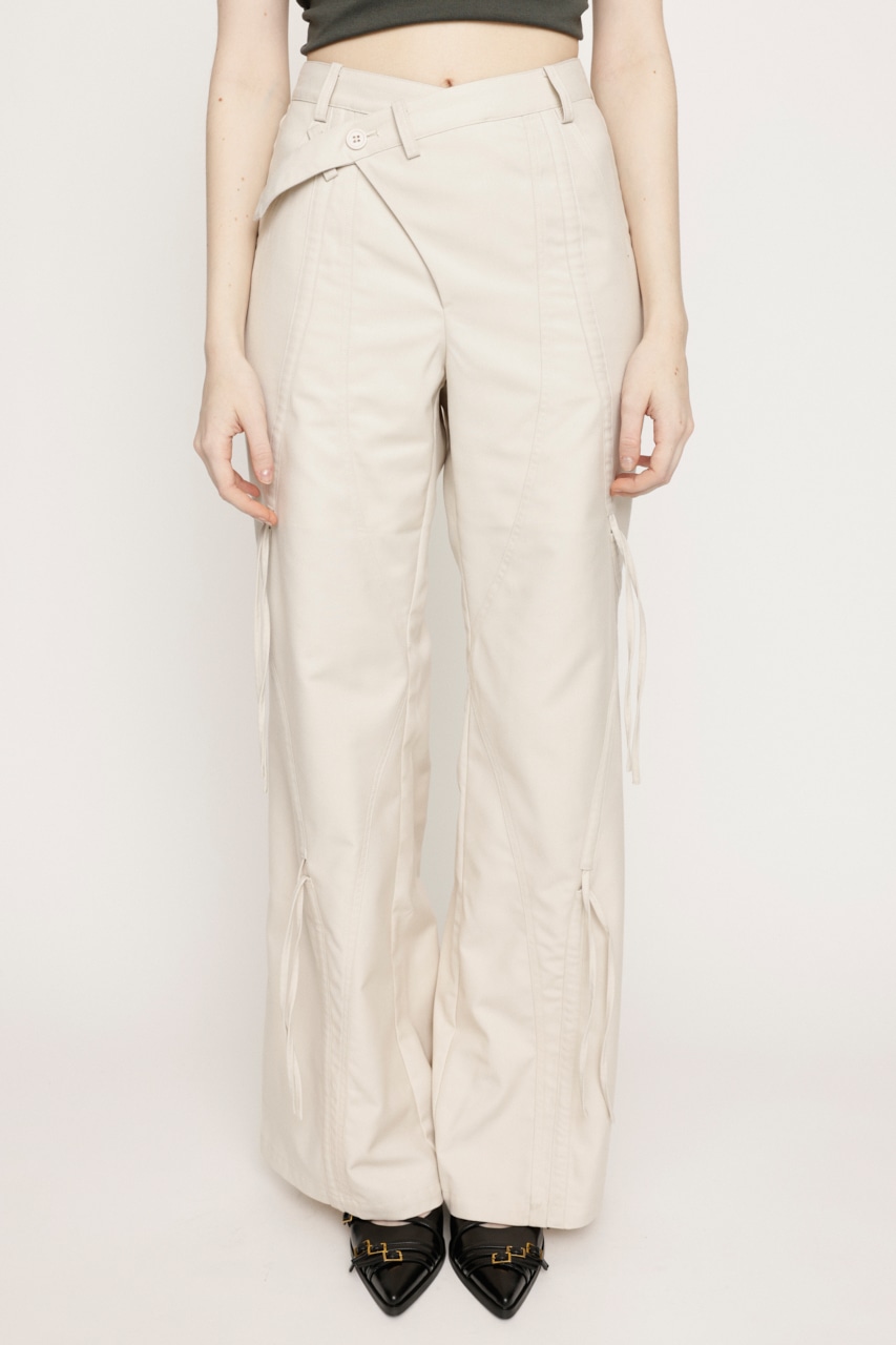 ■POINT:斜めに設定されたウエストベルトデザインと調節可能な紐のデザインがポイントのセミフレアパンツ。