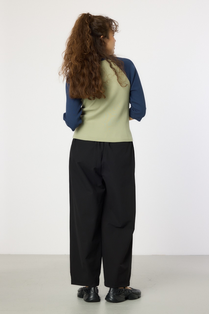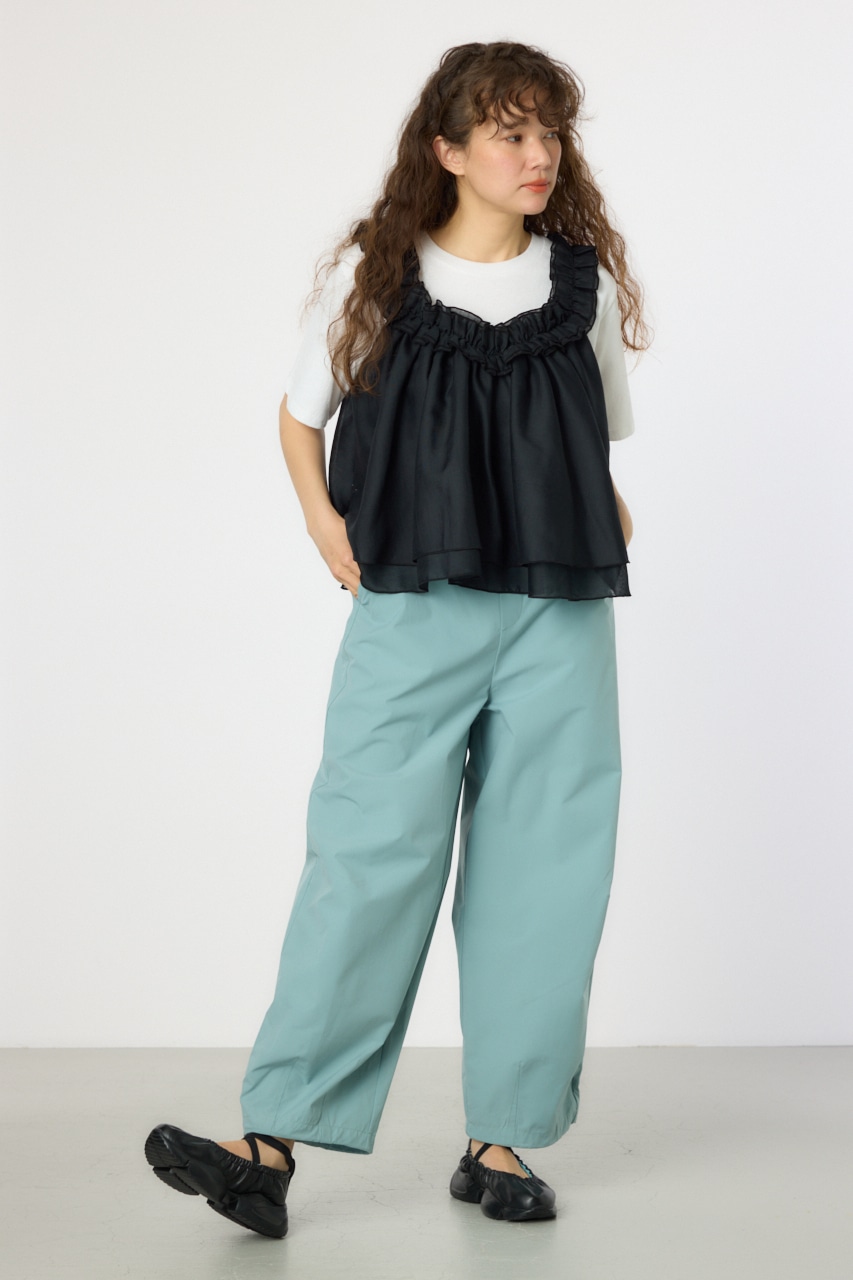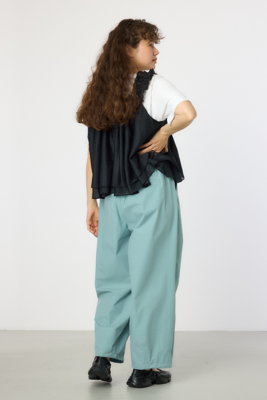 前ウエストはスッキリとしたシルエットで、後ウエストにはゴムを入れ動きやすく着脱もしやすい仕様です。