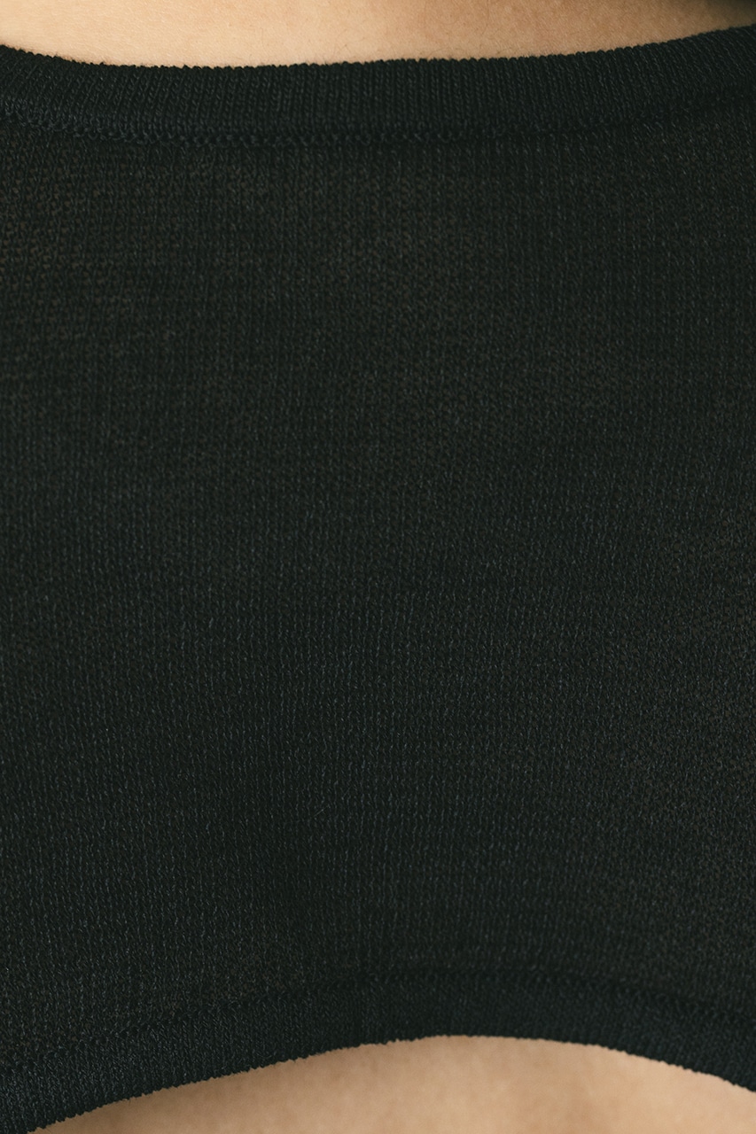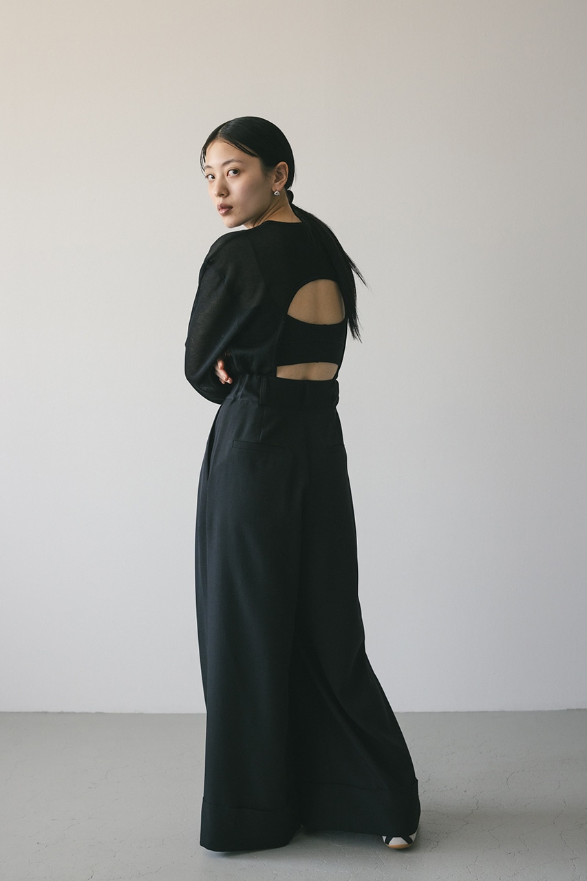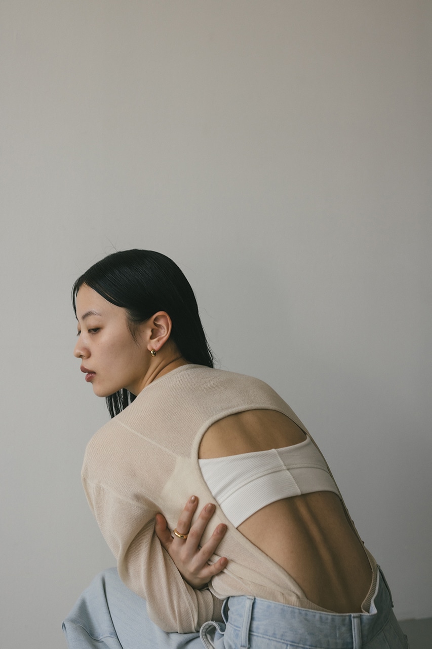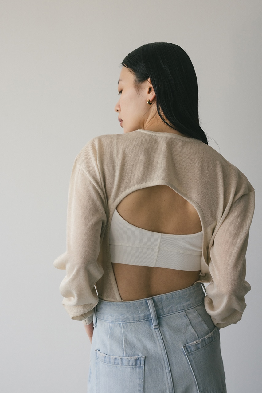 ドライタッチの肌なじみの良い素材で編み立てたバックオープンデザインのニットボディースーツ。
