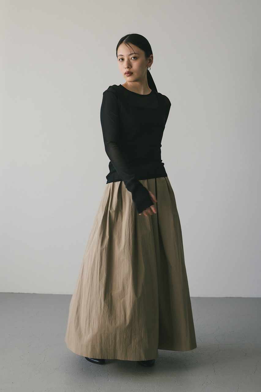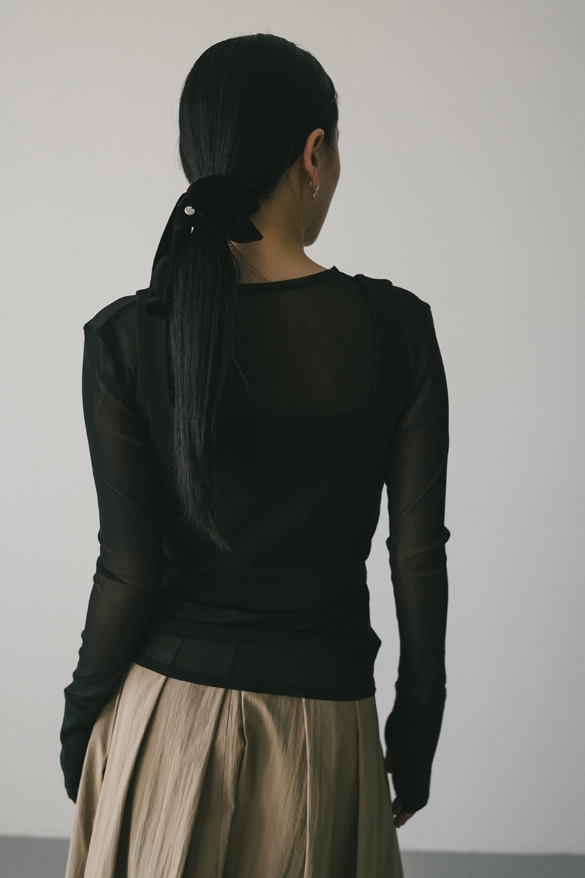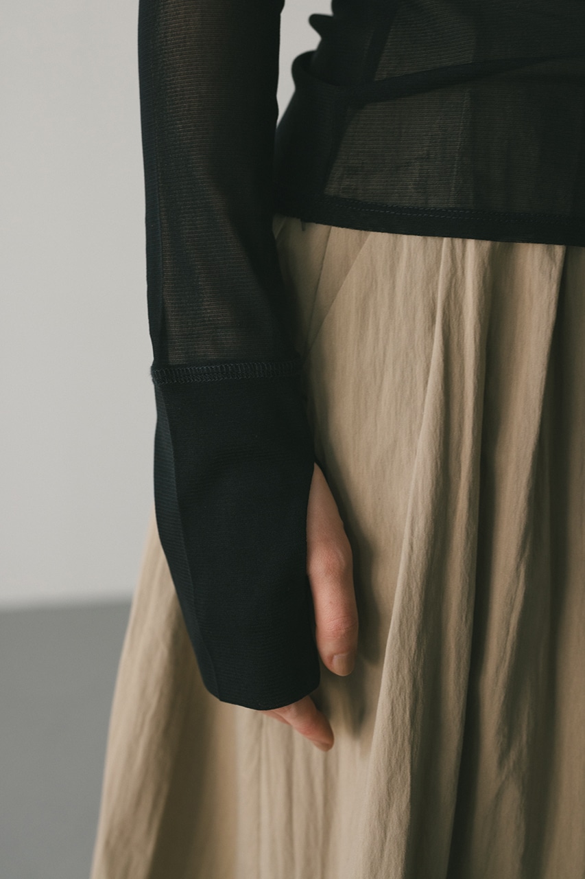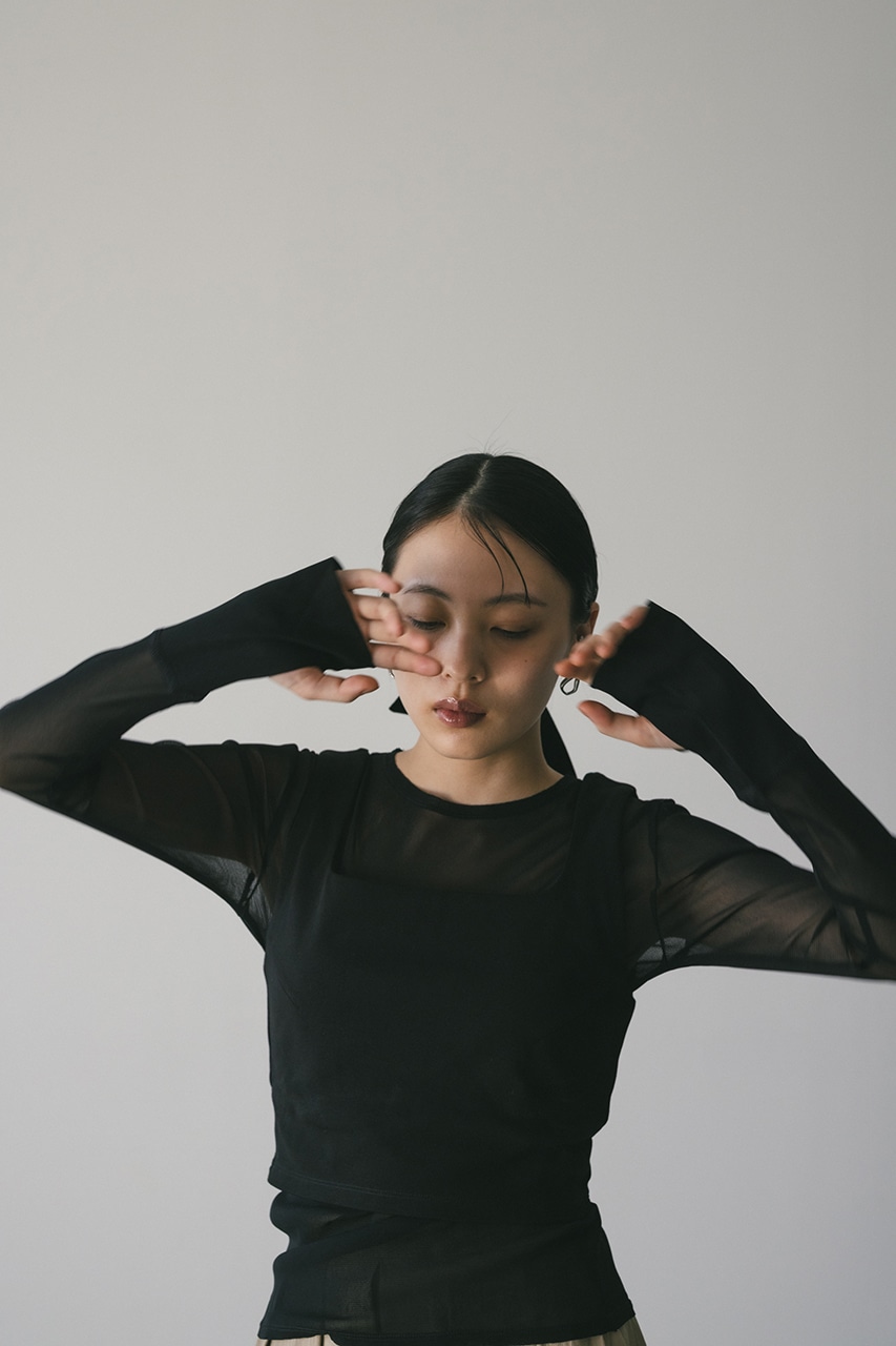 しなやかに身体の動きに沿うシアートップはこだわりの重ね断ち切りデティールと親指の付け根から出るフィンガーホールがポイント。