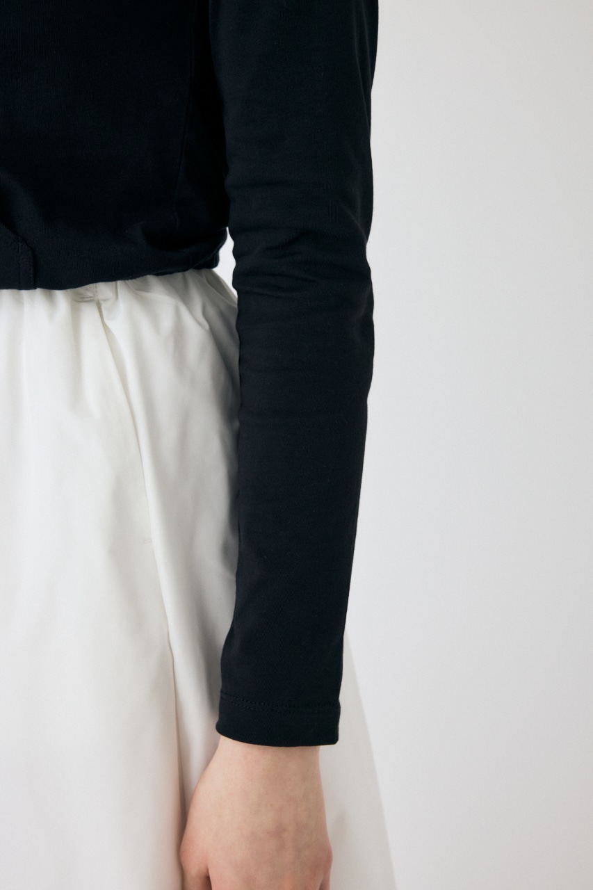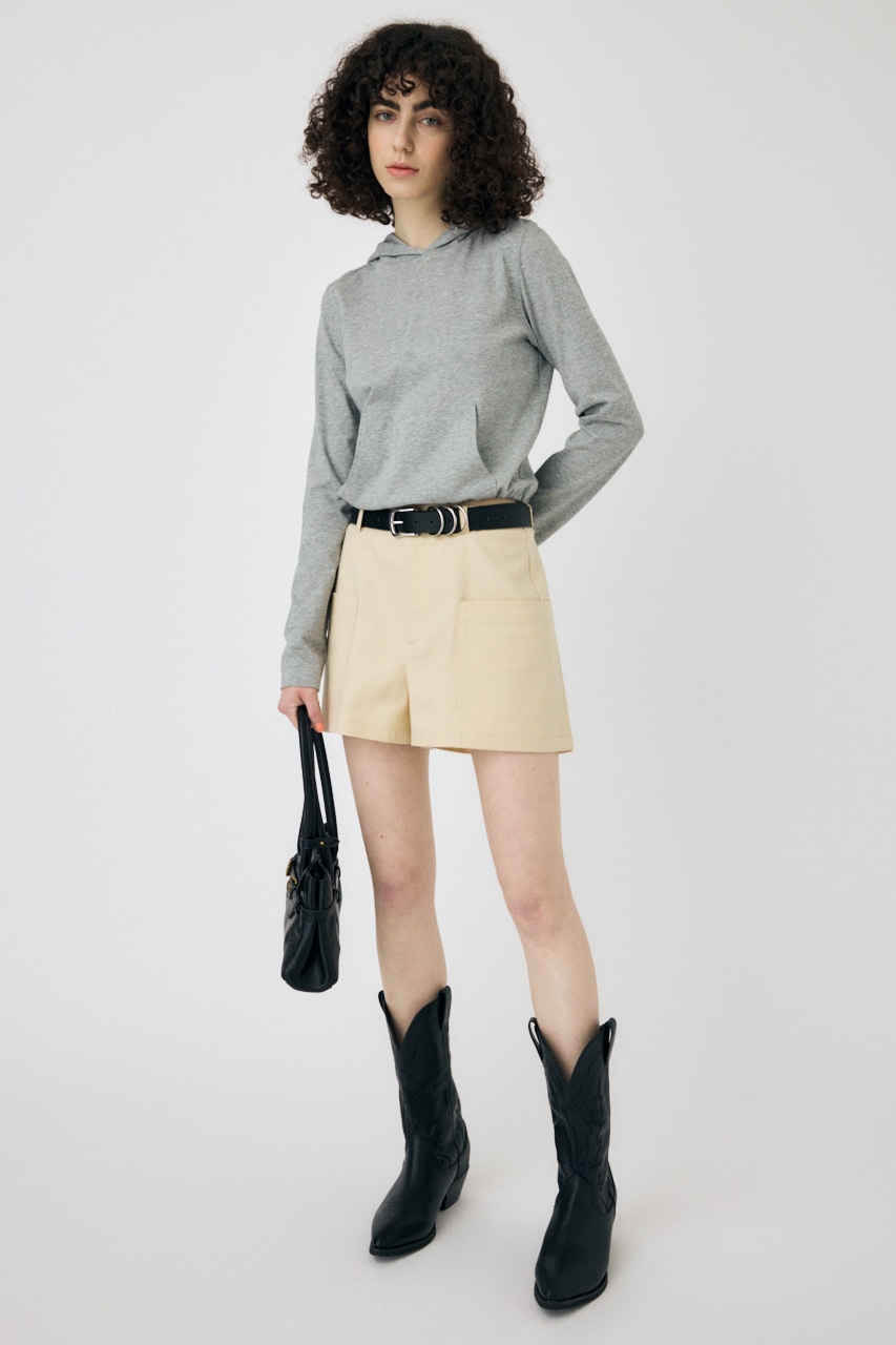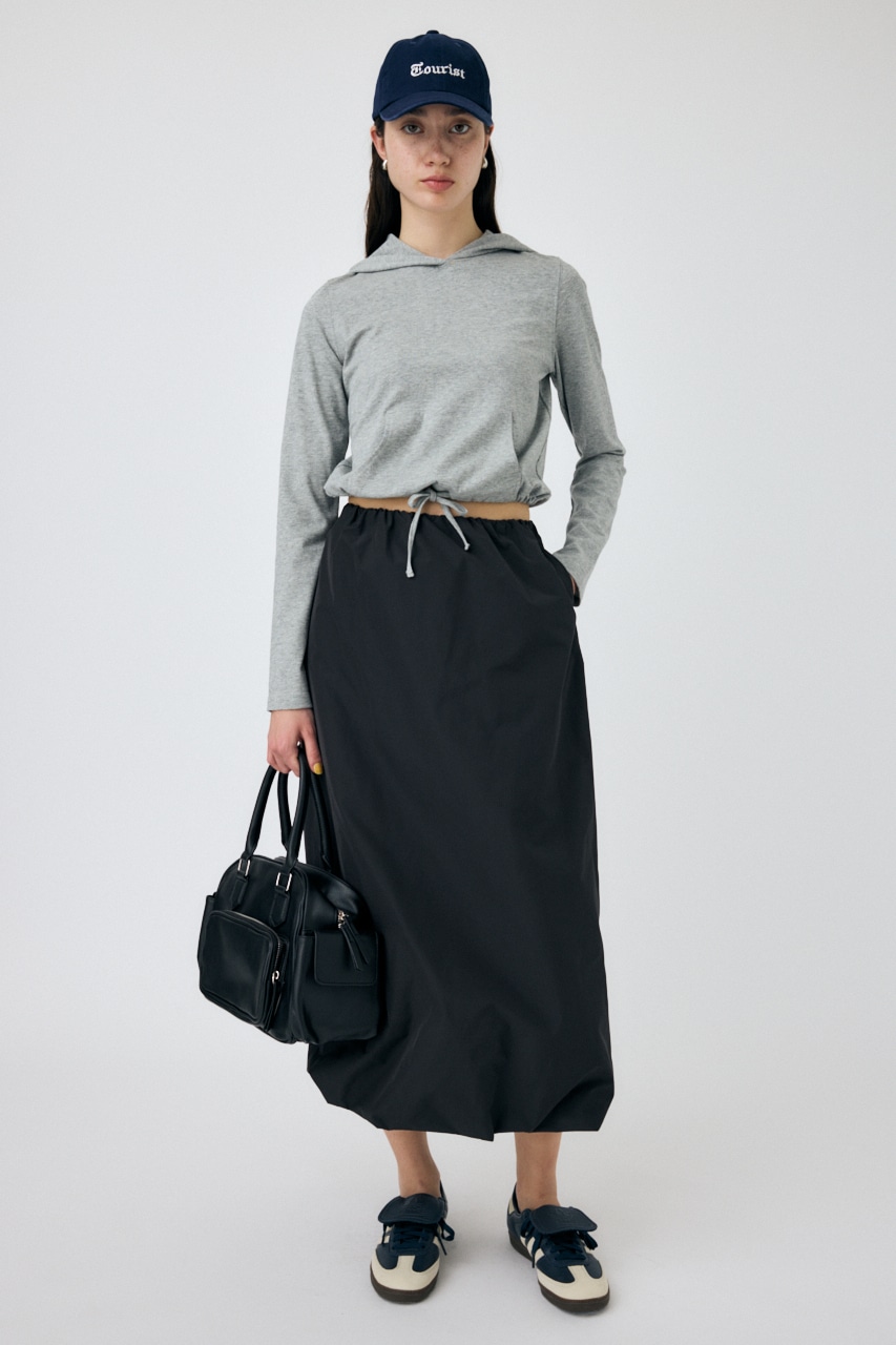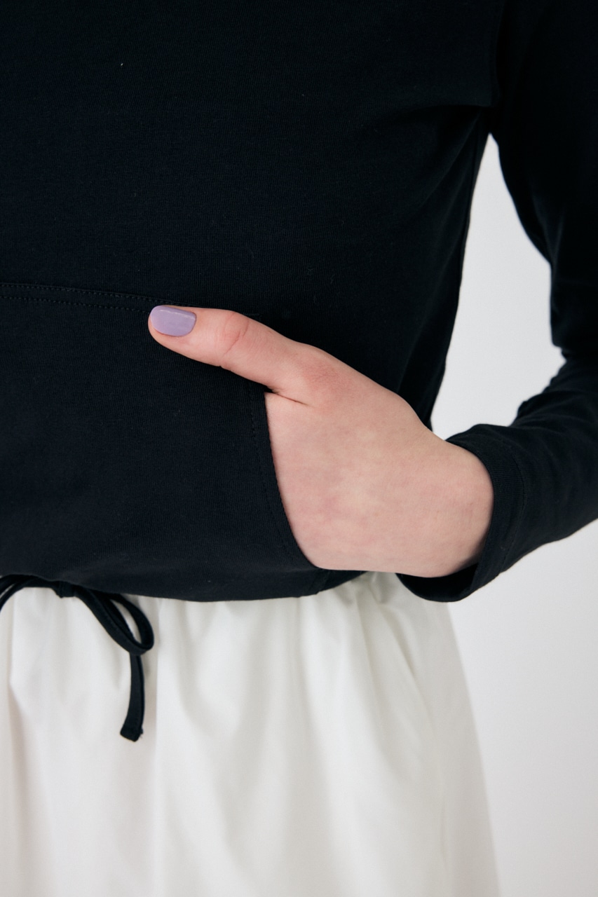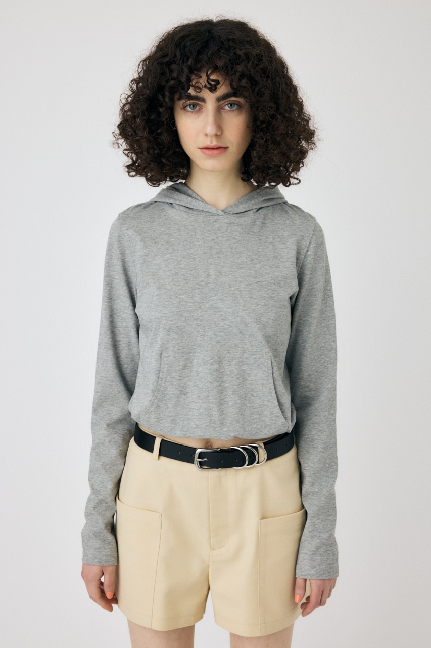コンパクトなロングTシャツにフーディーのディテールを加えたトップス。