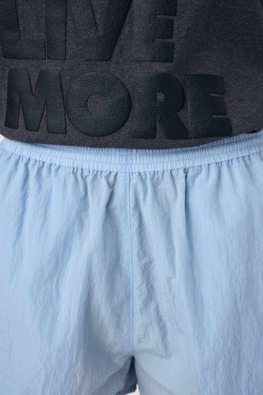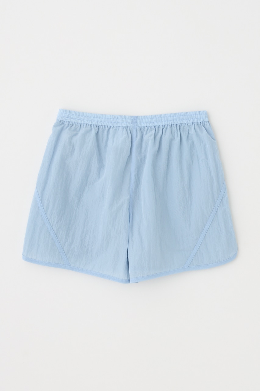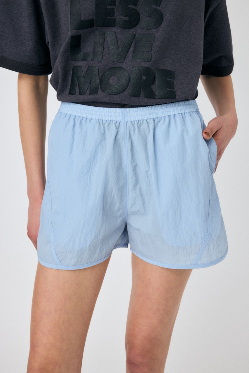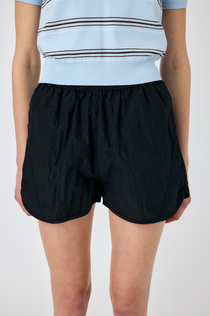 トラックショーツのパイピングまで共生地を使用し、シンプルながらもトレンド感溢れるナイロン素材のトラックショーツ。