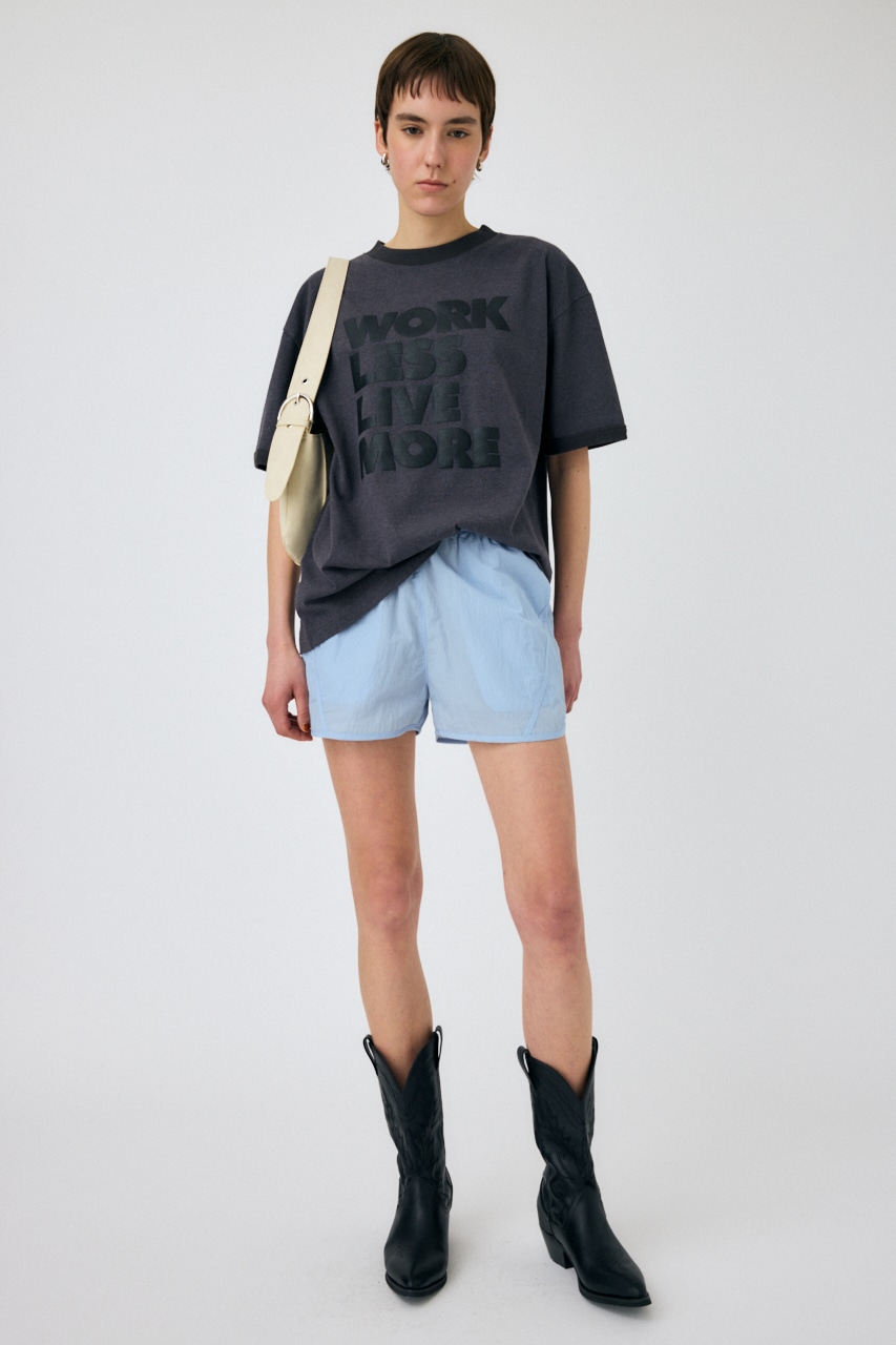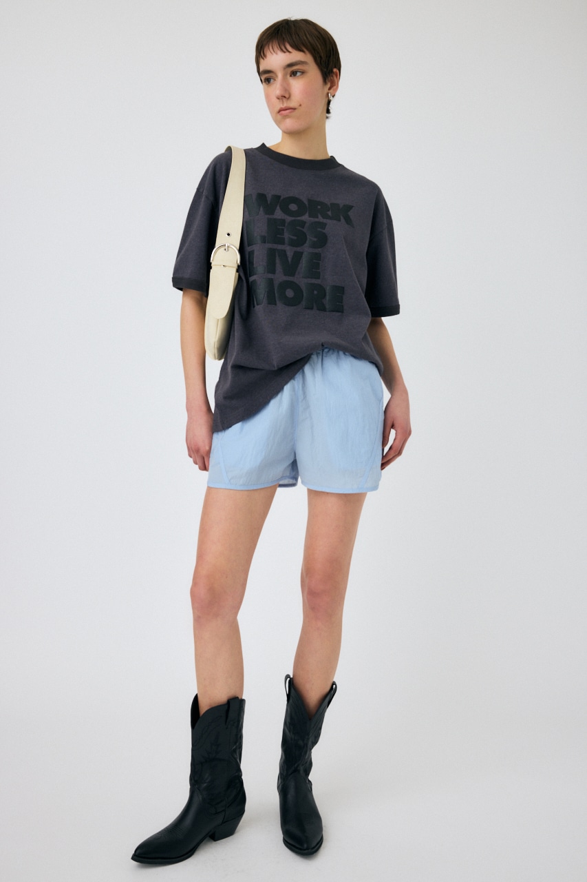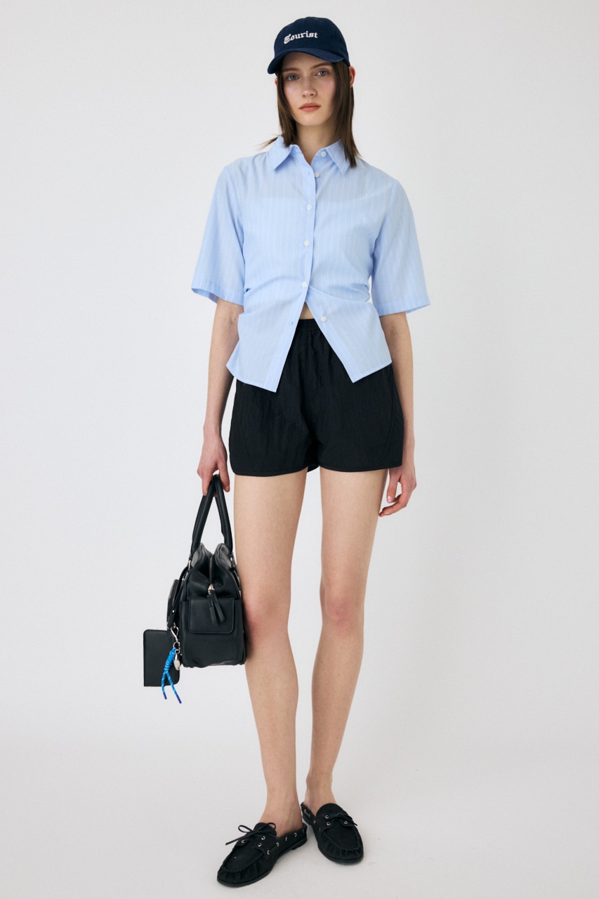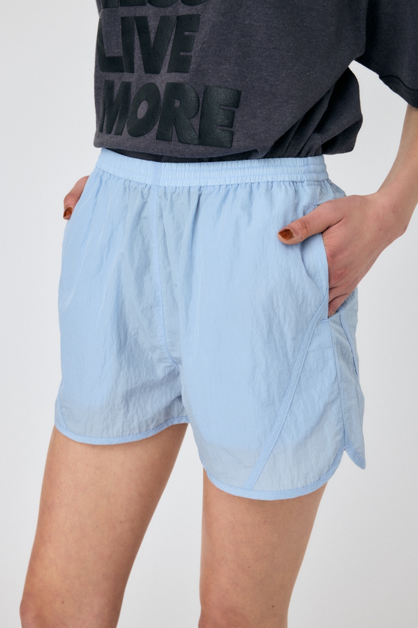 トラックショーツのパイピングまで共生地を使用し、シンプルながらもトレンド感溢れるナイロン素材のトラックショーツ。