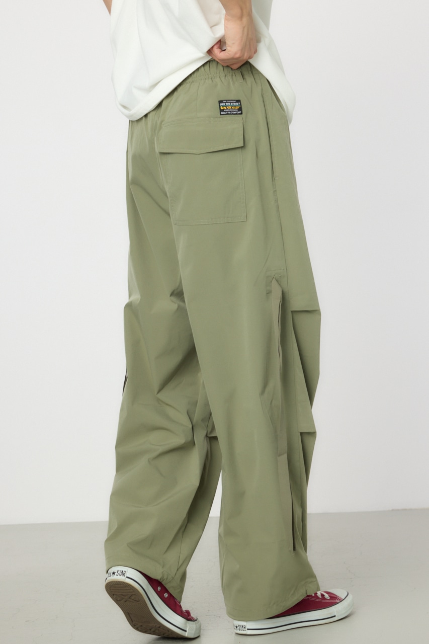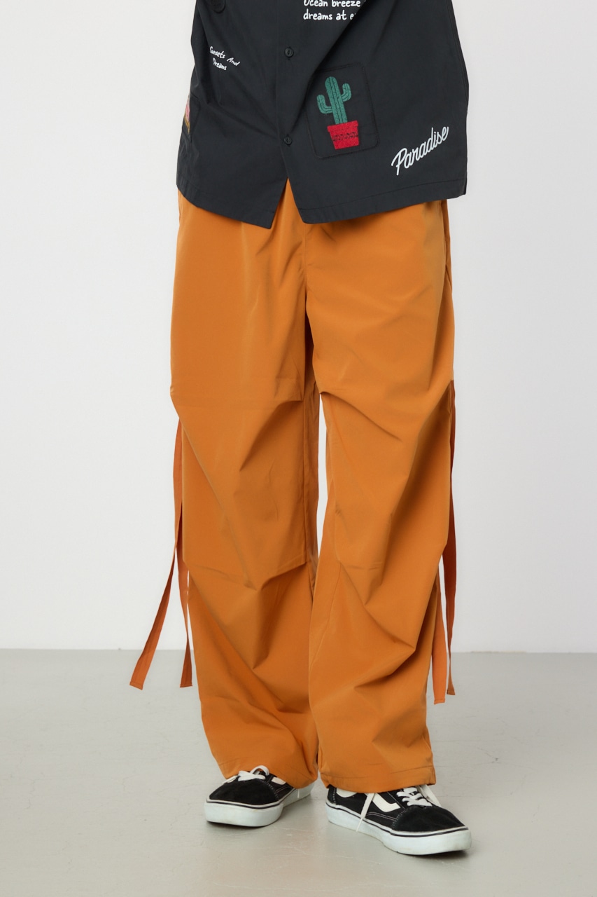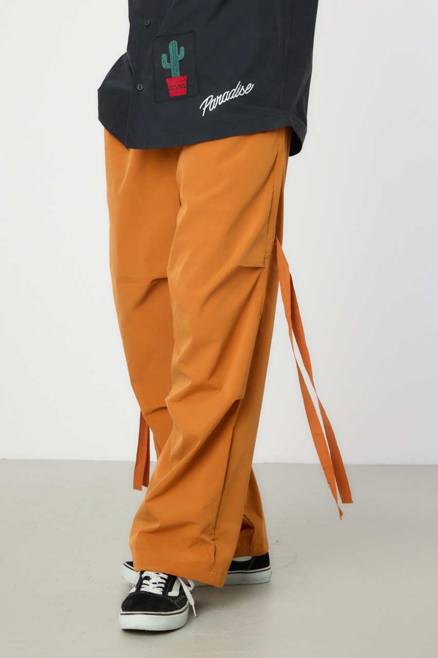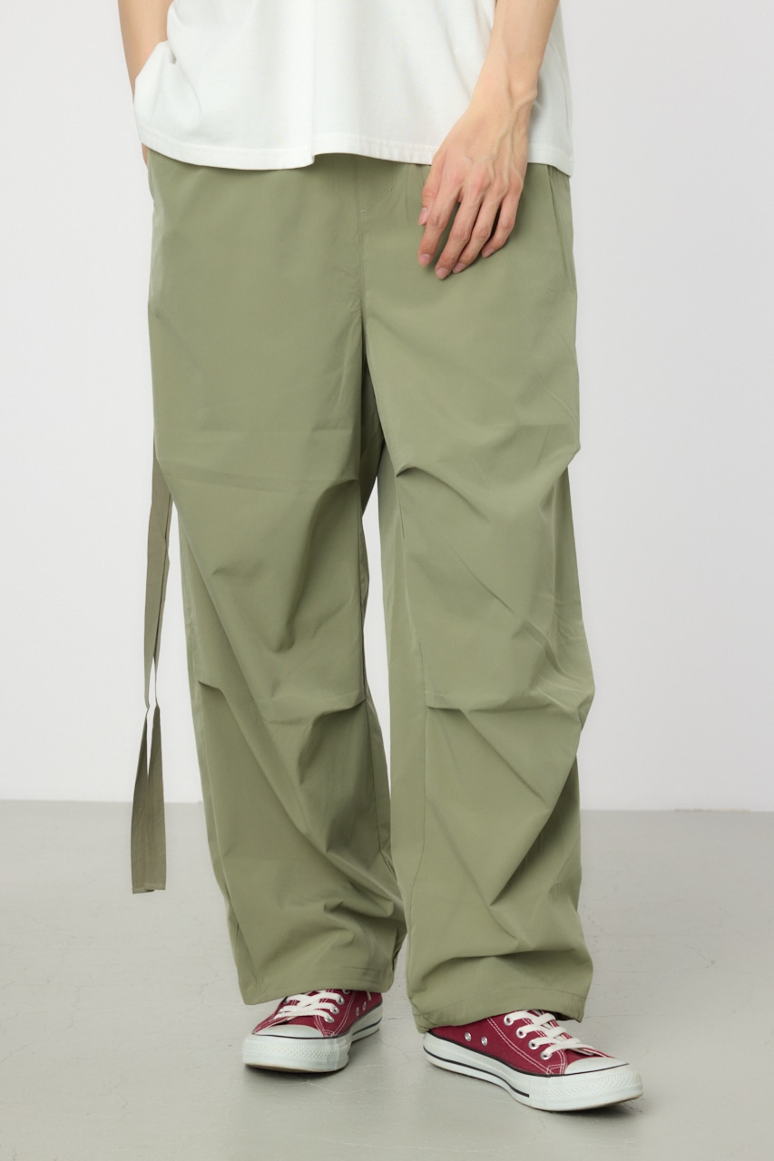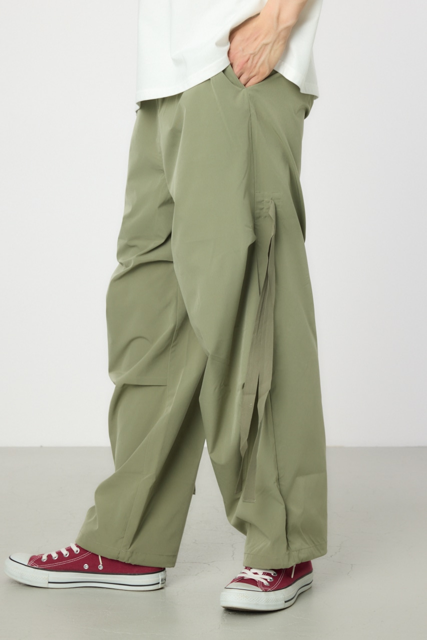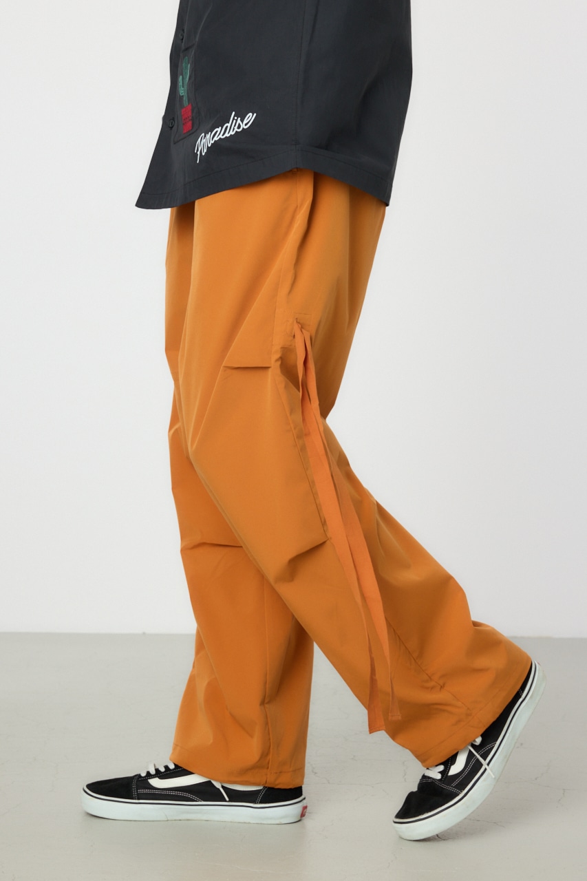 ミリタリーテイストのパラシュートパンツを、シンプルながらデザイン性のある1本に仕上げました。