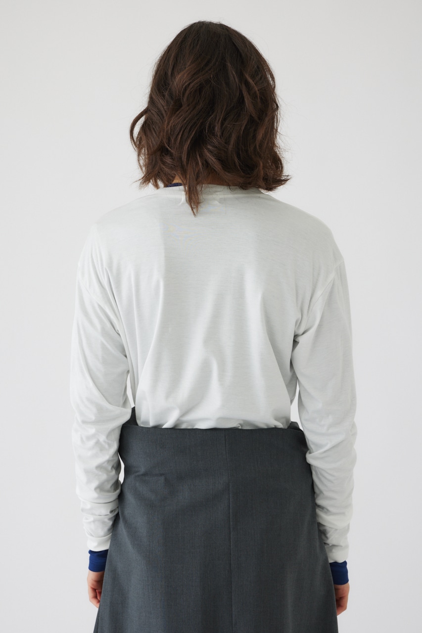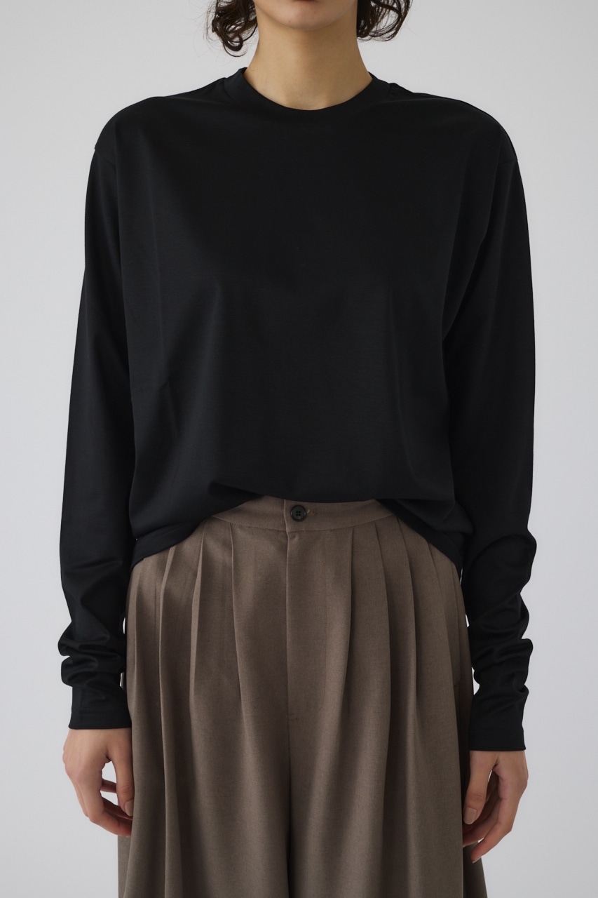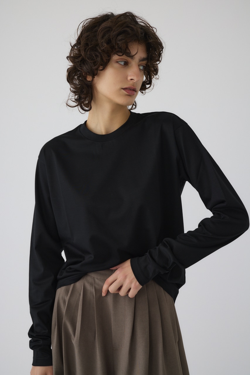 独特の滑らかな質感を持った高級超長綿ギザとリヨセルを混紡することで実現した、しっとりとした風合いと柔らかな肌触りが快適なスムースを使用。程良い光沢と艶が美しく一枚でサマになるのはもちろん、袖を長めに設定し、ニットやスウェットとレイヤードしてもこなれたスタイルが完成するように製作しています。