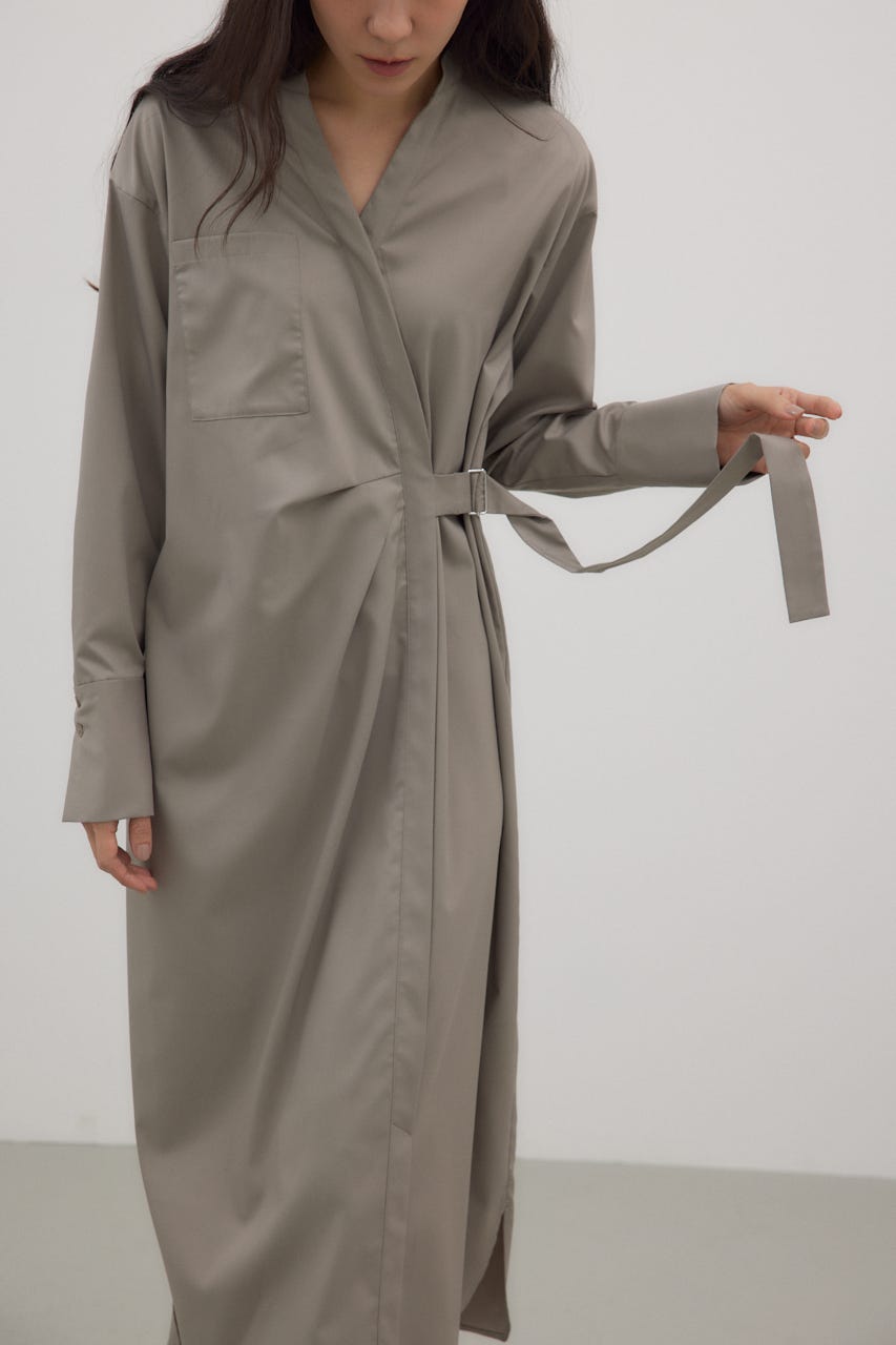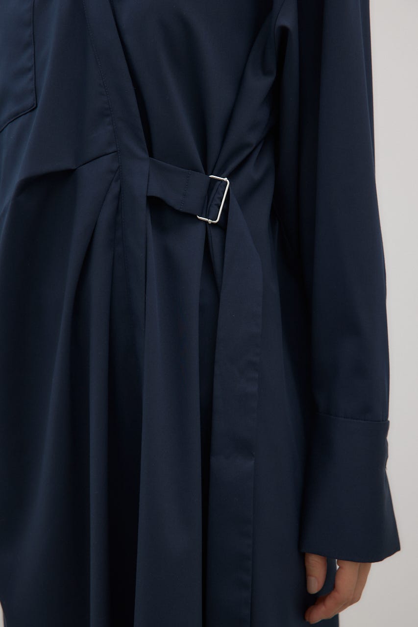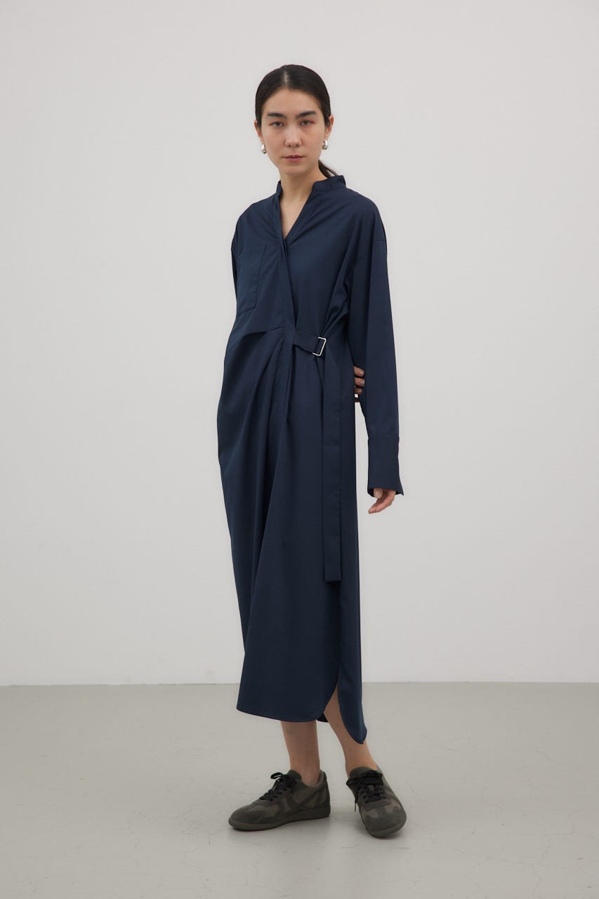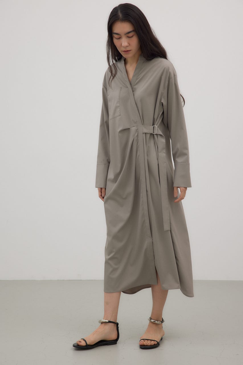 片側に共地のベルトがついたバックルがポイントのシャツワンピースになります。