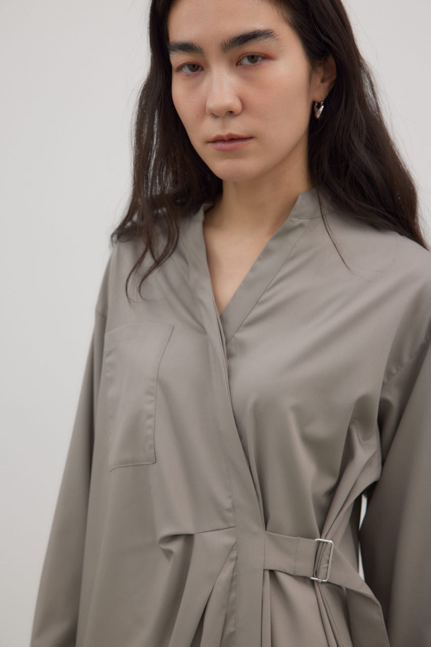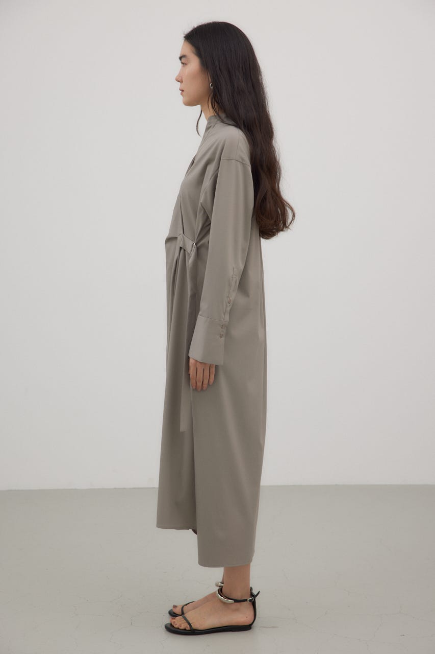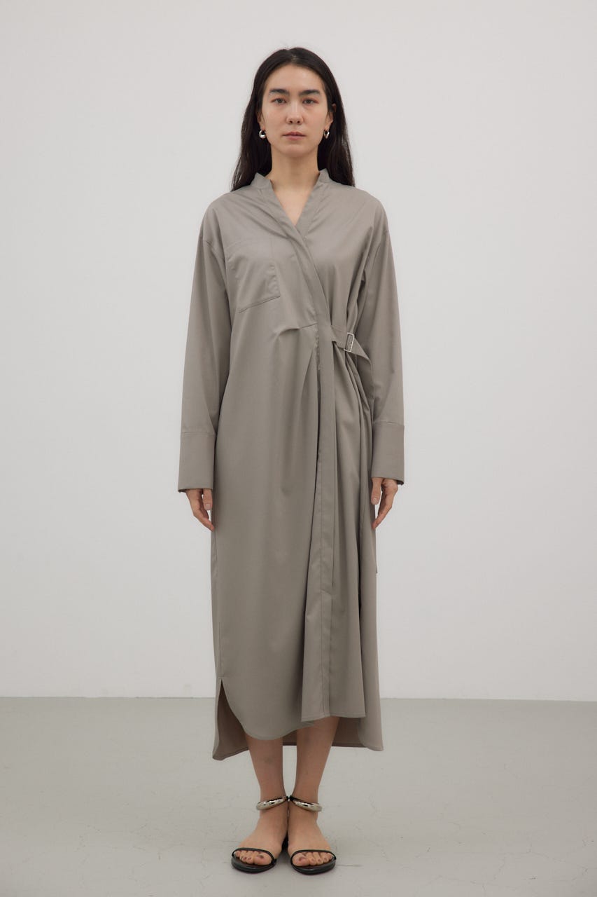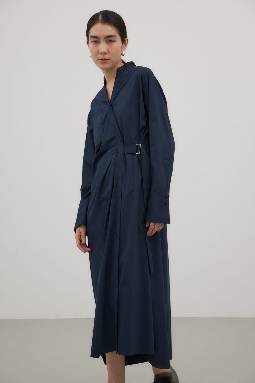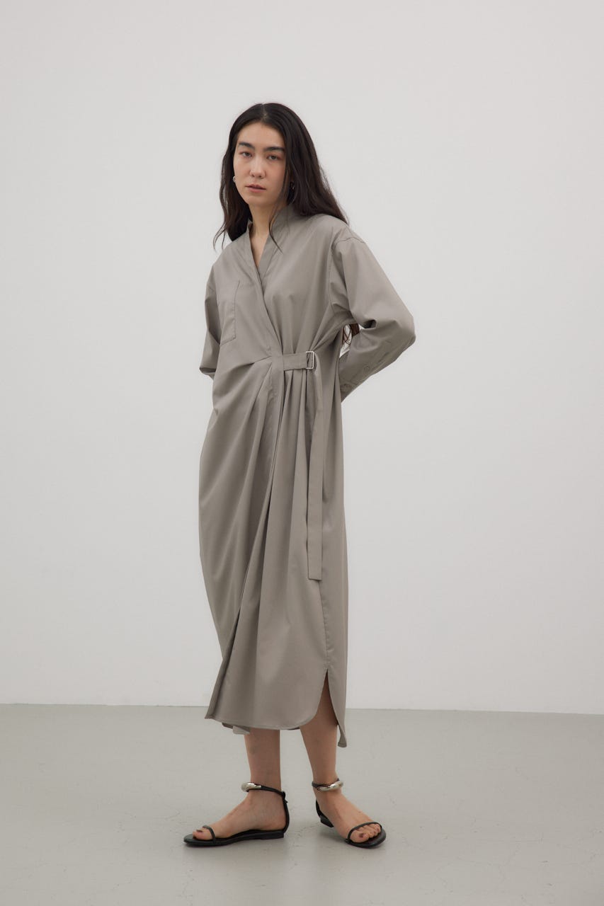 片側に共地のベルトがついたバックルがポイントのシャツワンピースになります。