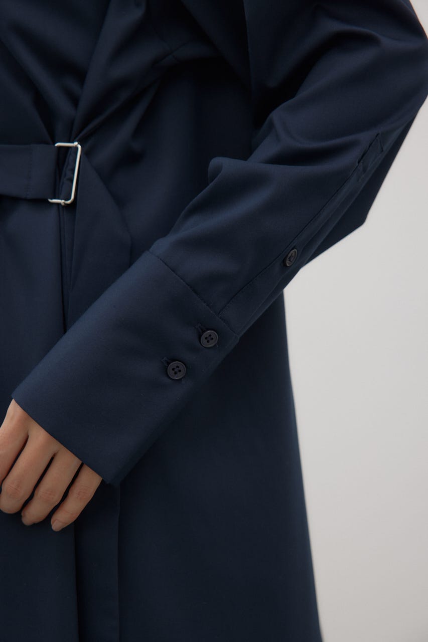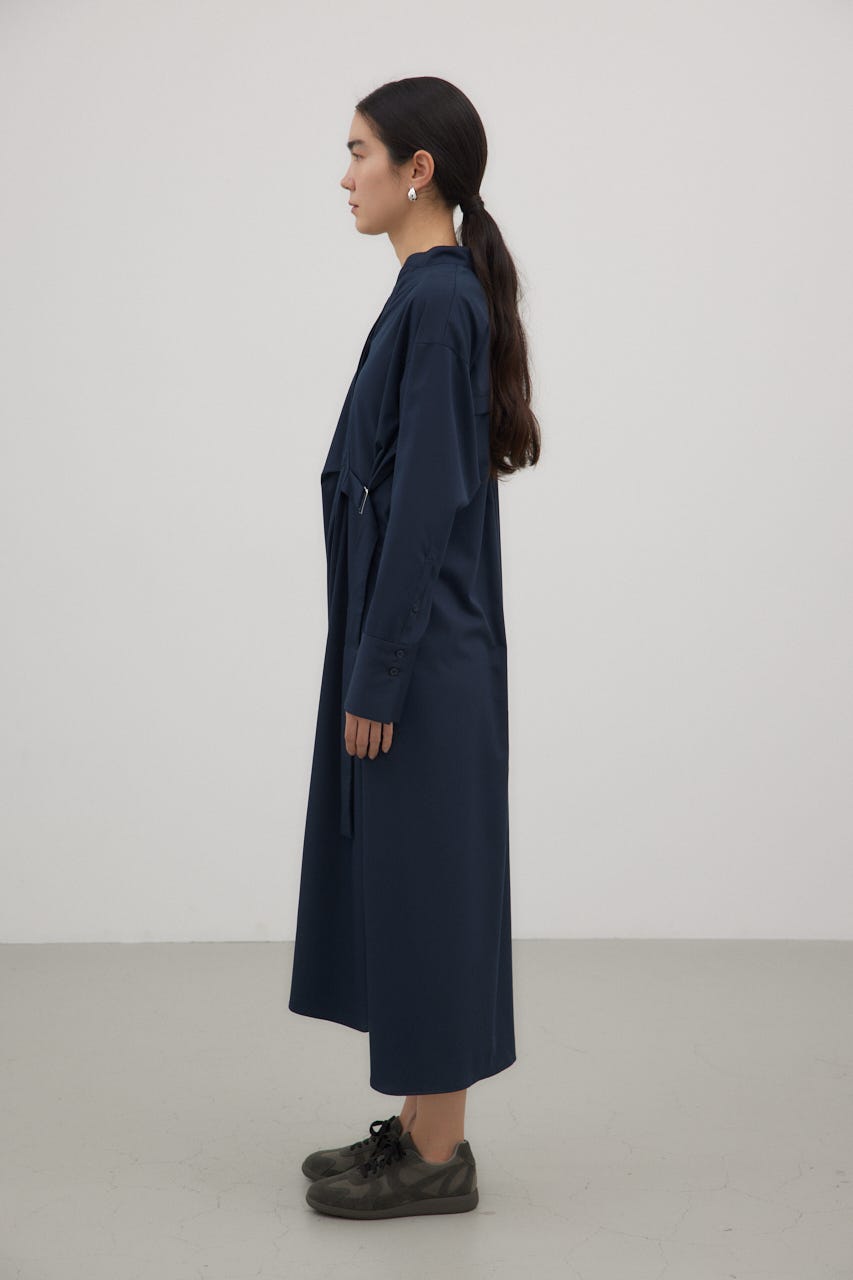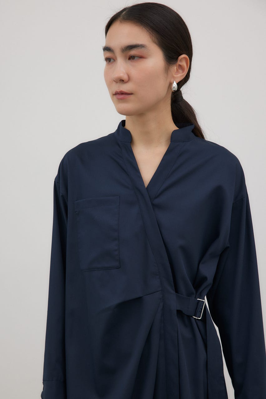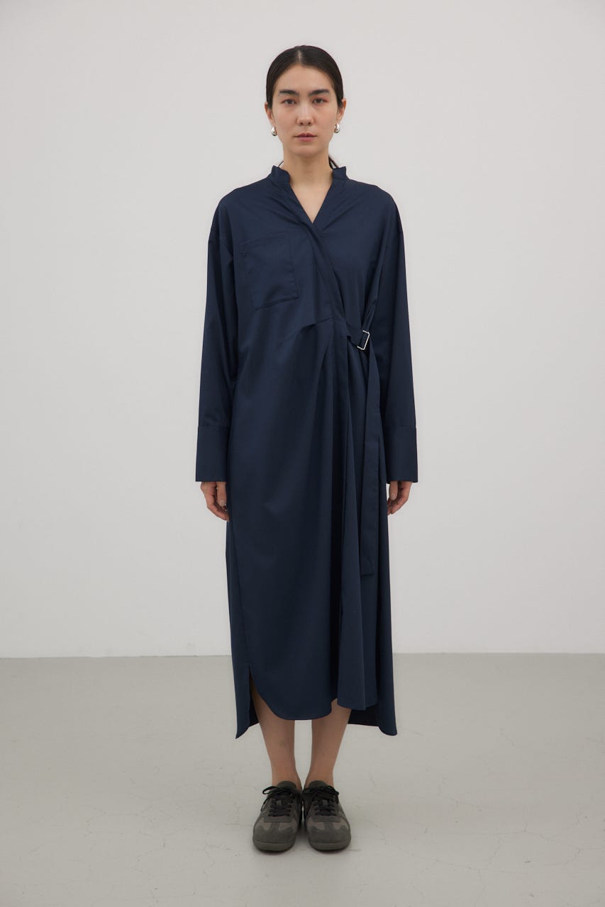 片側に共地のベルトがついたバックルがポイントのシャツワンピースになります。