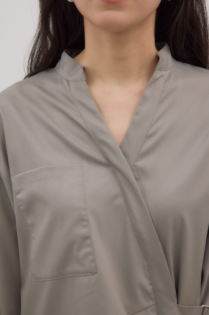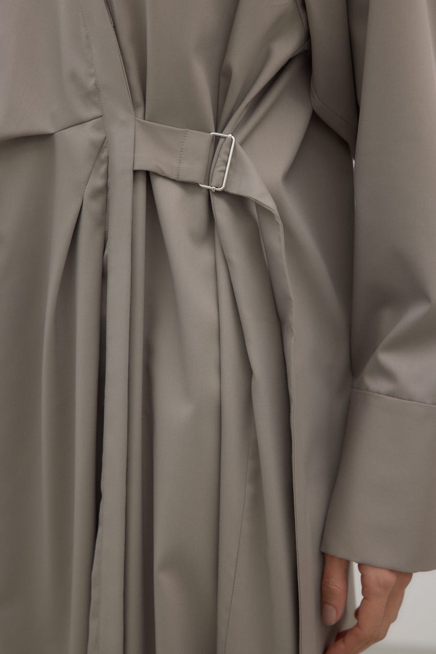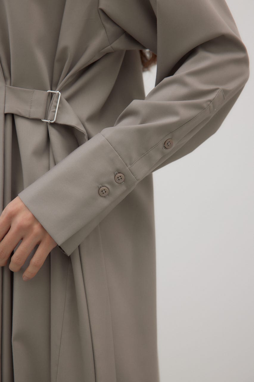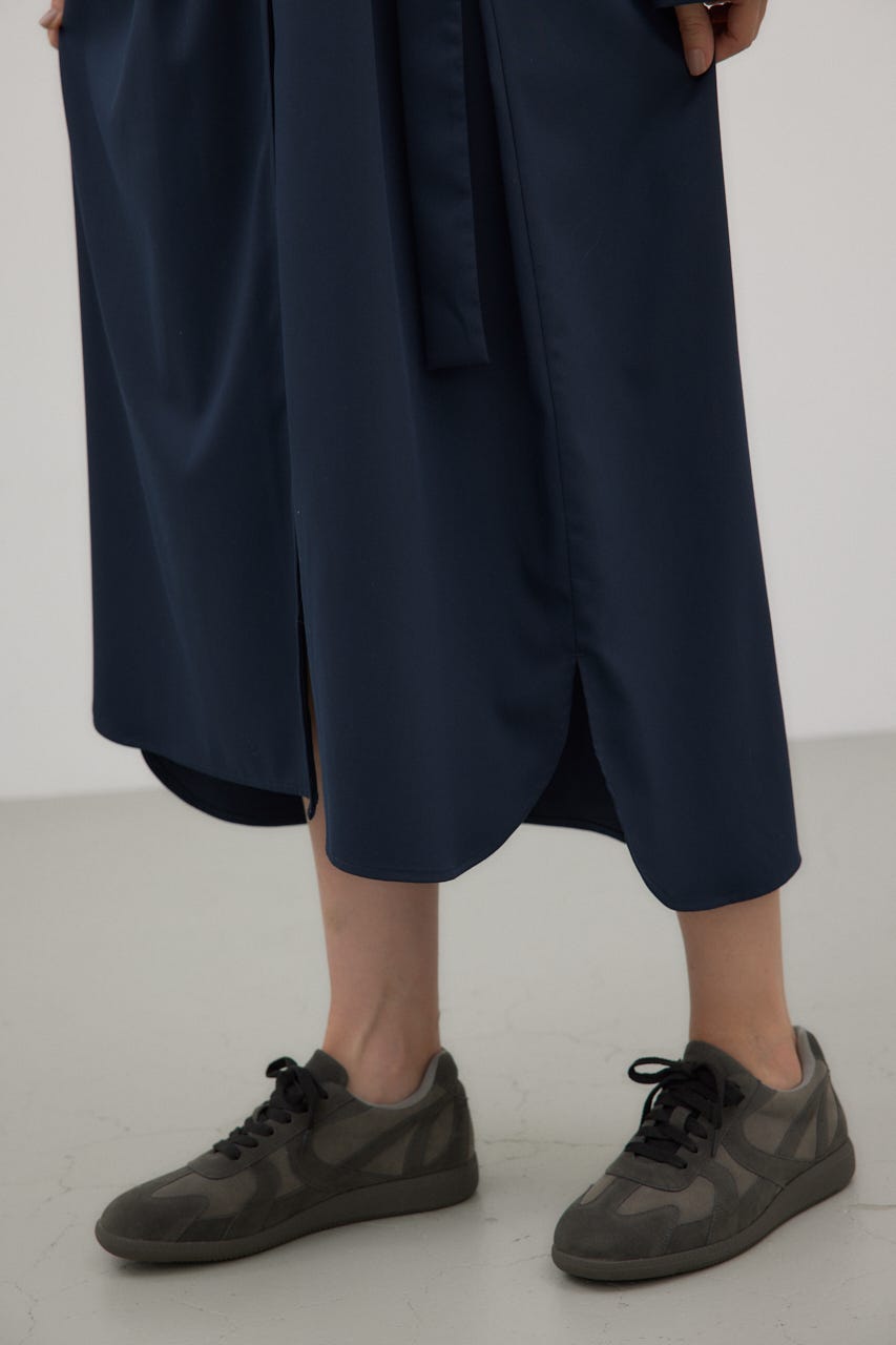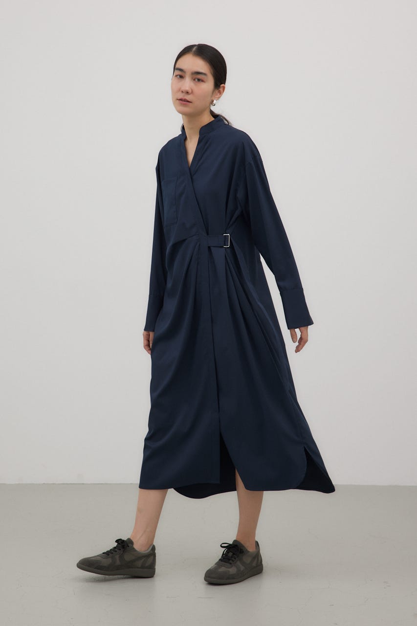 片側に共地のベルトがついたバックルがポイントのシャツワンピースになります。