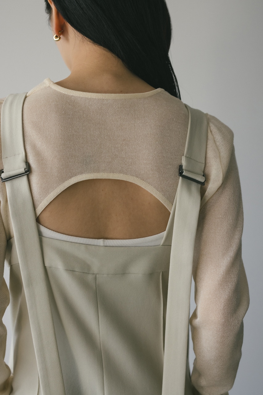 鎖骨をきれいに見せてくれるスクエアネックがポイントのロンパース。