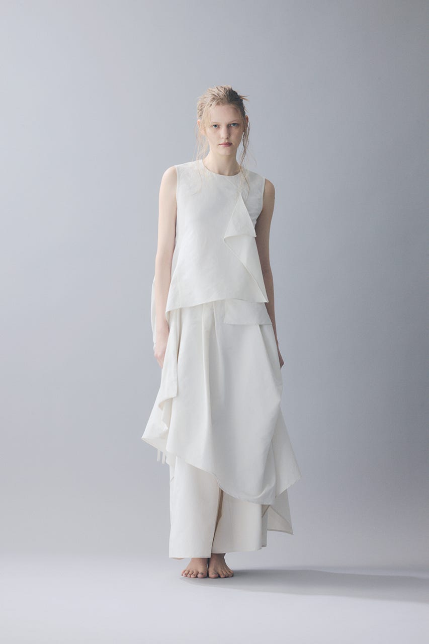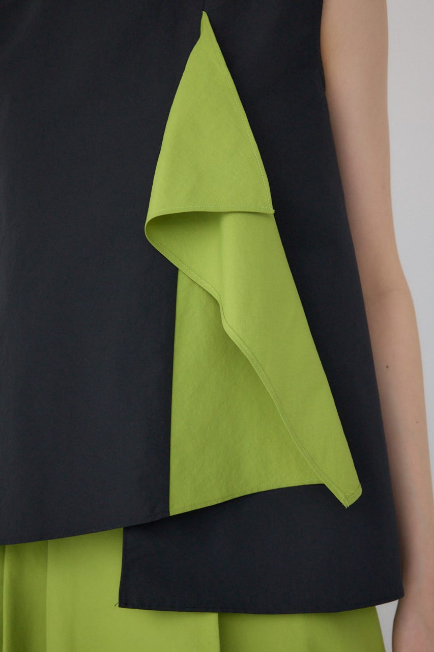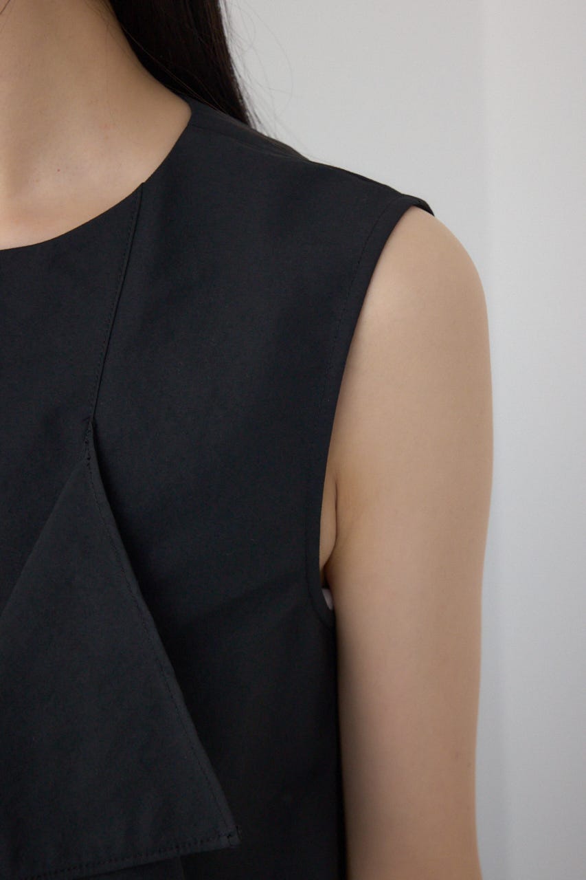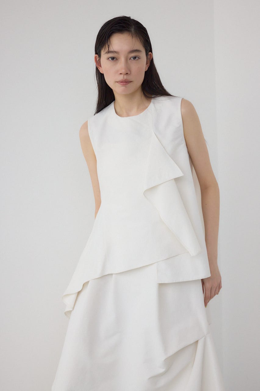動きのあるドレープデザインがポイントのノースリーブブラウスです。