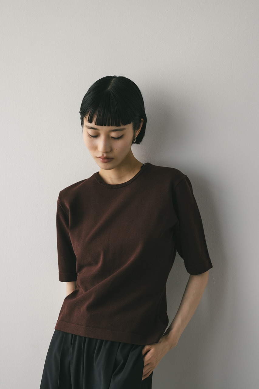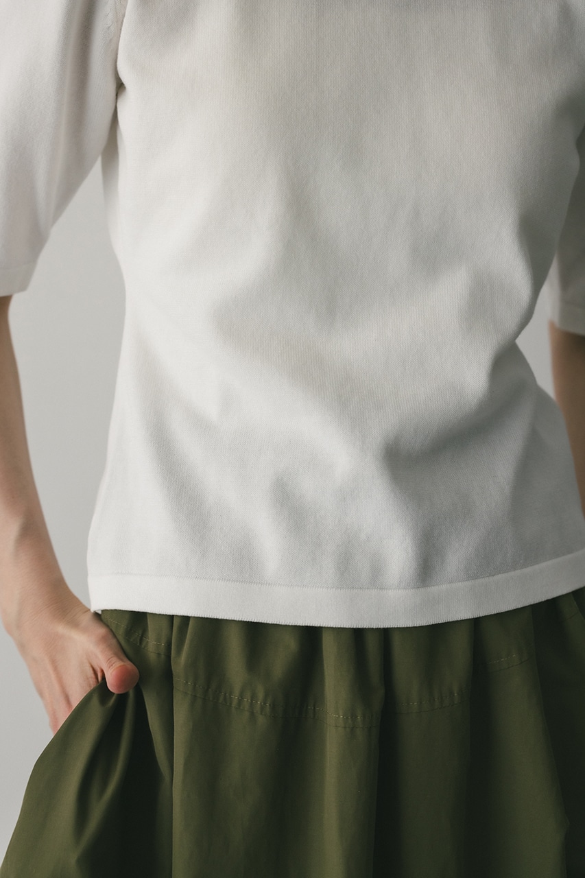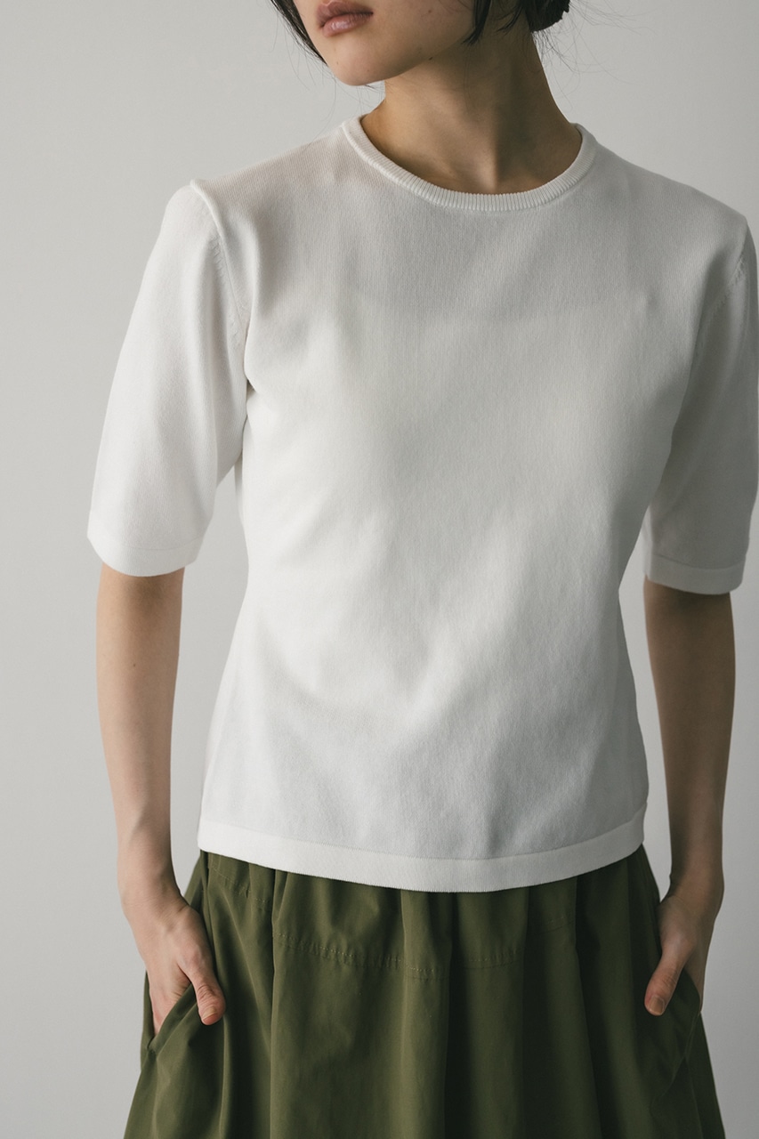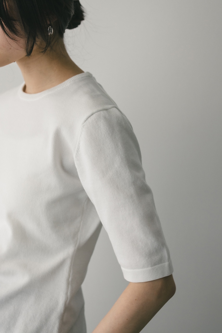 表面は100%綿の細番の強撚糸、裏目にはストレッチ糸を編み込んだドライタッチで程よく張り感のある編み地を使用しているので、身体に張り付きにくく着心地の良い一枚です。