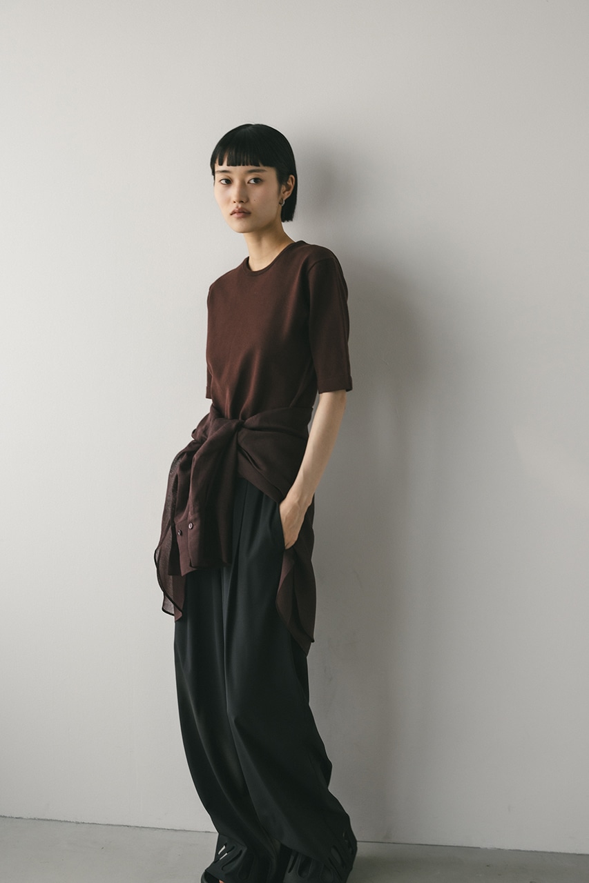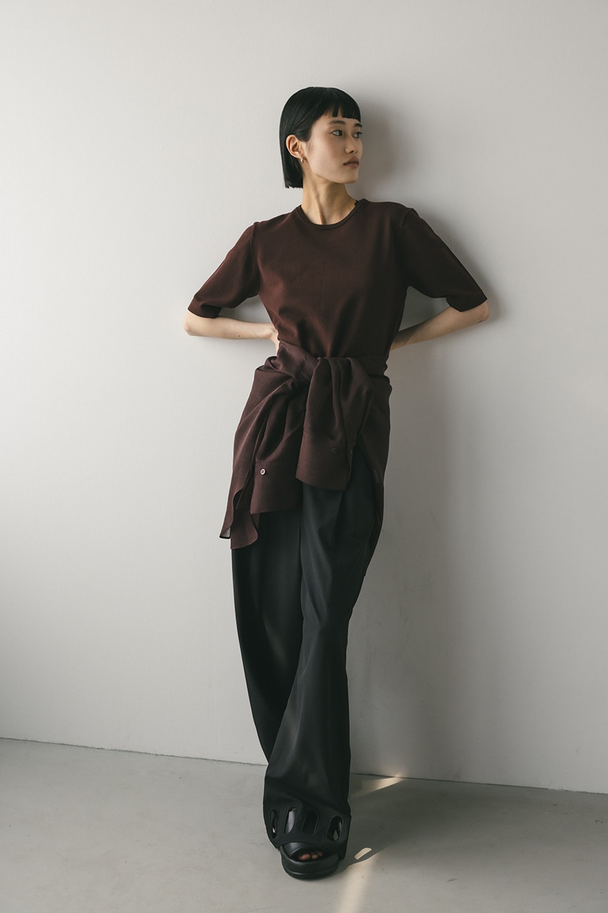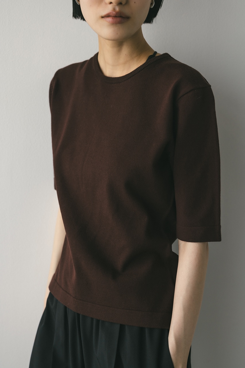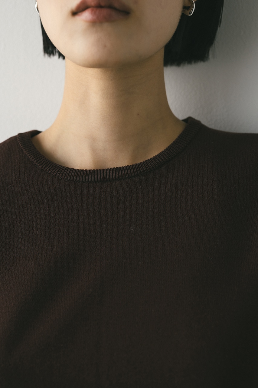 表面は100%綿の細番の強撚糸、裏目にはストレッチ糸を編み込んだドライタッチで程よく張り感のある編み地を使用しているので、身体に張り付きにくく着心地の良い一枚です。