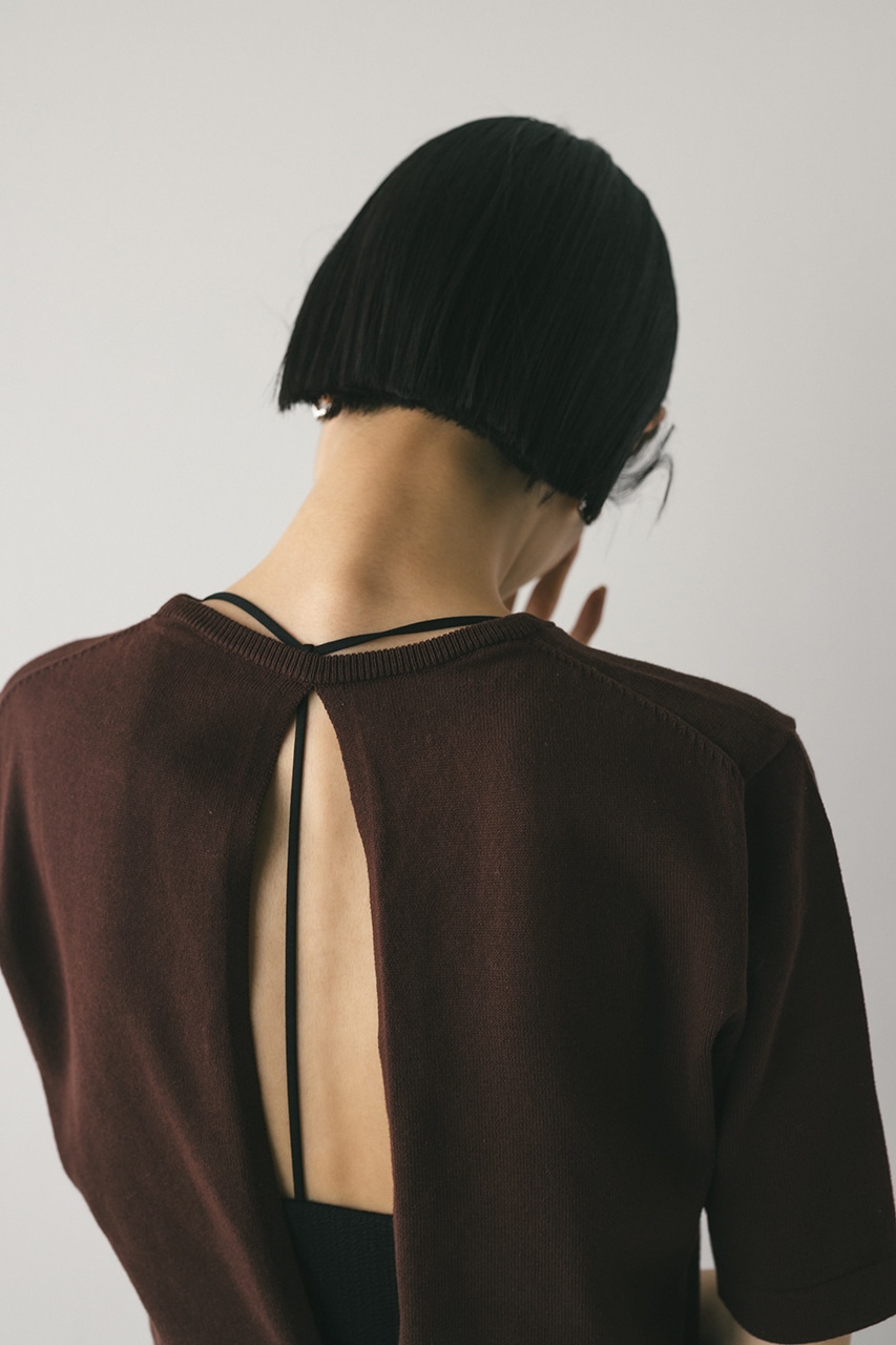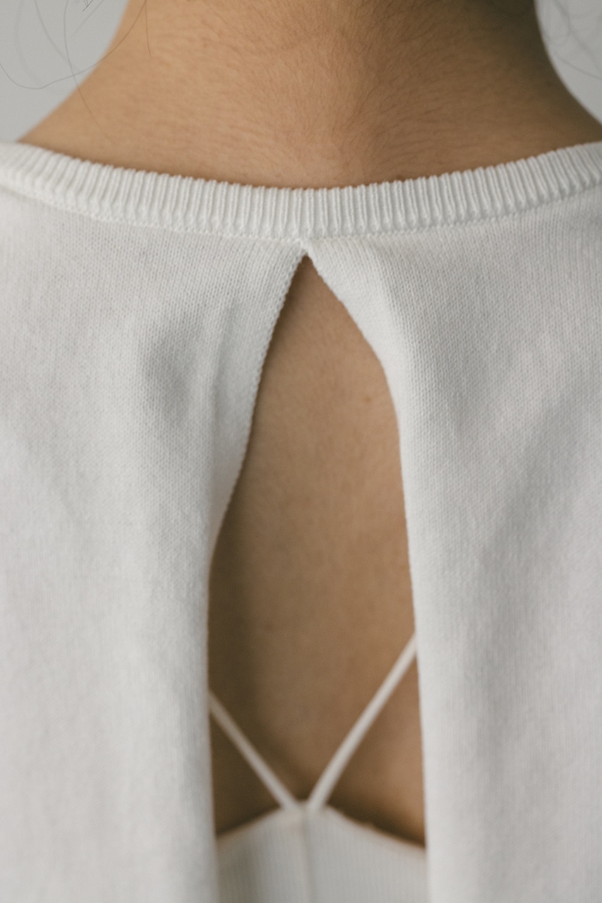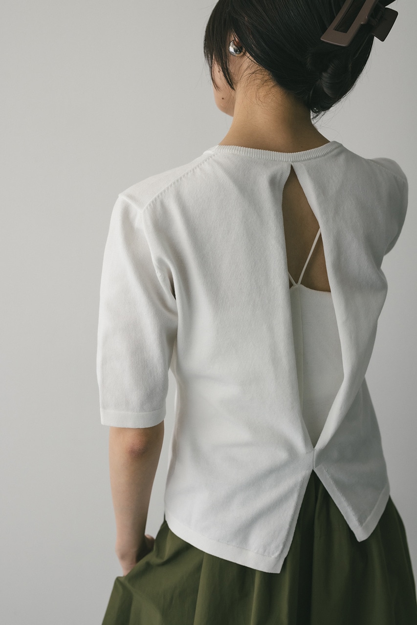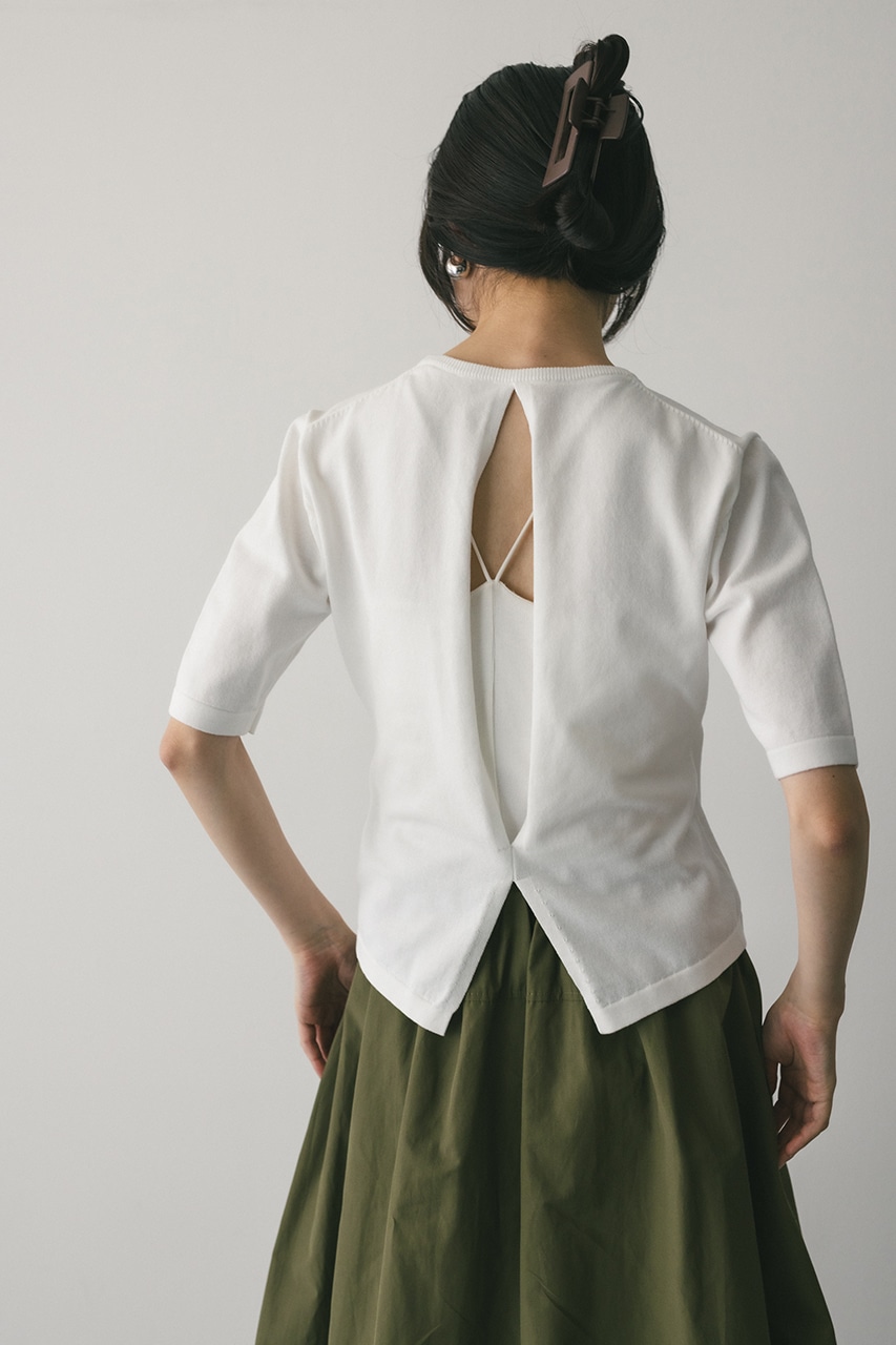 程よく肌見せできるバックオープンデザインがヘルシーでモードなニットトップ。
