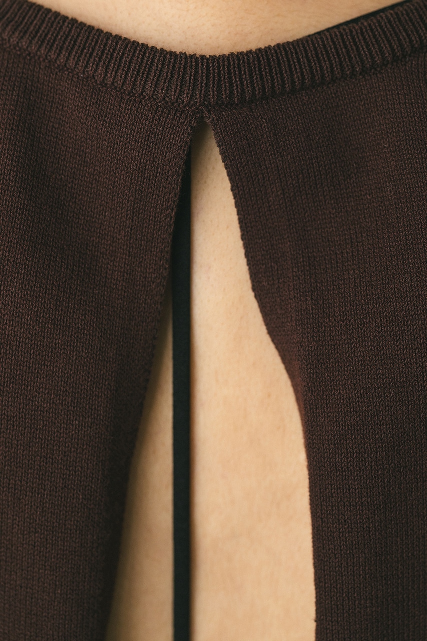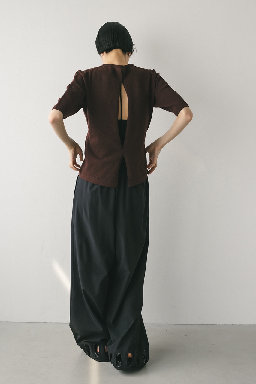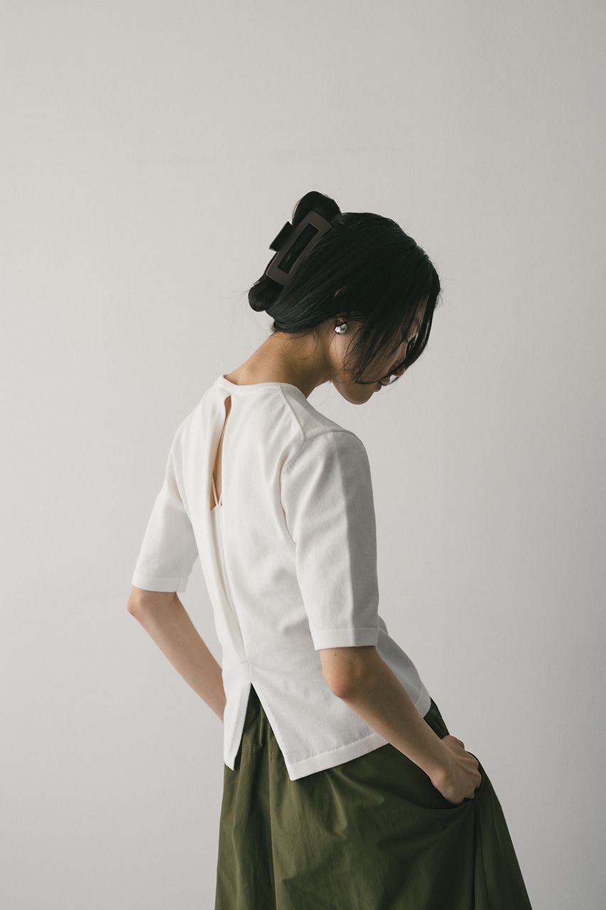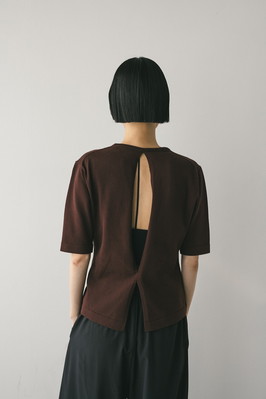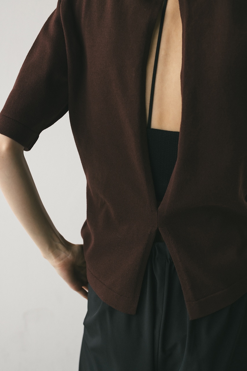 程よく肌見せできるバックオープンデザインがヘルシーでモードなニットトップ。