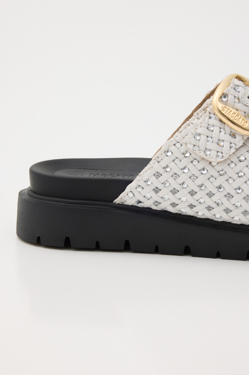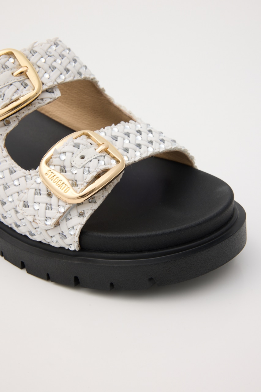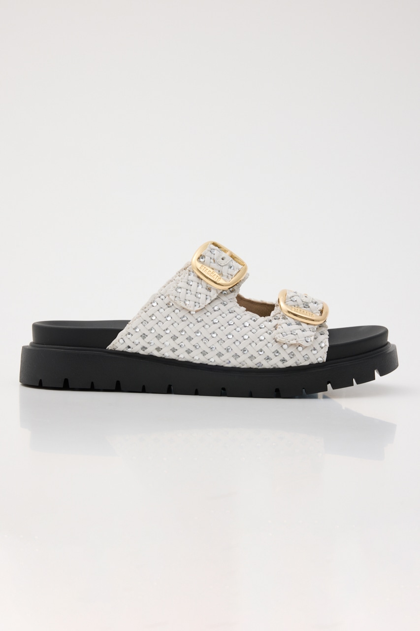 人気のサンダルに新デザインが登場!さらっとした表情感のあるイントレチャートデザインにストーンを1粒ずつ装飾した繊細なデザインが光る、春~秋まで長期間活躍してくれるデイリーにも使いやすいコンフォートサンダル。軽量かつWベルトデザインに脚を包みこんでくれるカップソールでコンフォータブルな履き心地です。ベルト部分は調節も可能です。